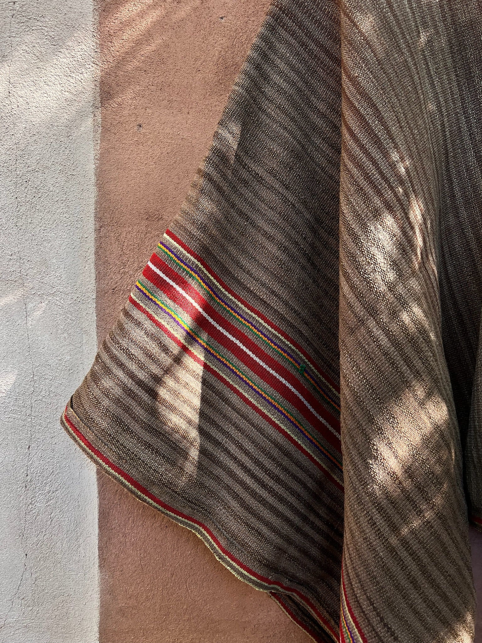 This is an antique poncho handwoven on a waist loom in the Sacred Valley of Cusco.