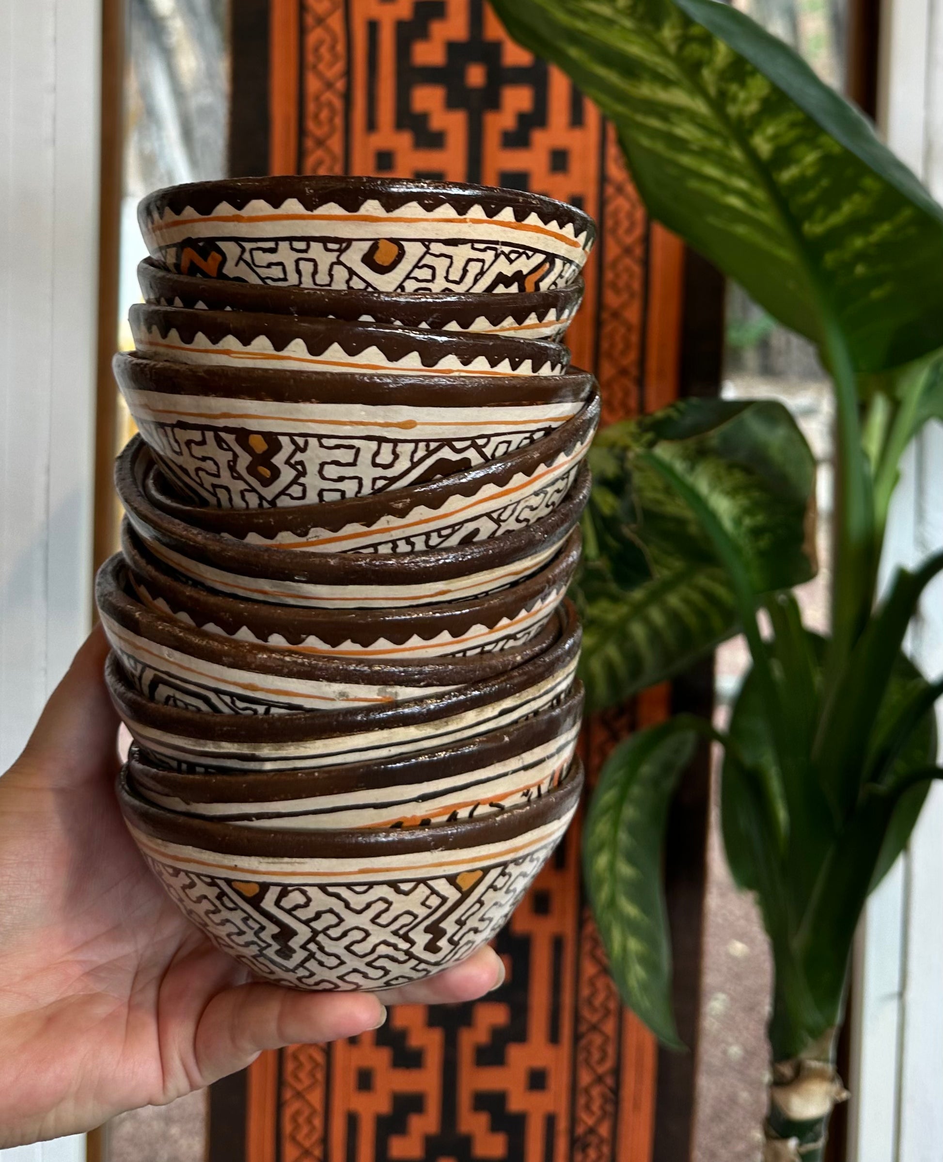 Handbuilt ceramic mini bowls from the Peruvian Amazon. Sandra Pacaya Panduro is a master ceramic artist form the Shipibo-Conibo Indigenous community near Pucallpa, Peru. Sandra collects the clay and pit fires the pieces and uses colored clay to paint them with the sacred patterns characteristic of her community. The handprinted designs represent the ayahuasca visions that are central to the cosmology and culture of this ancient civilization.
