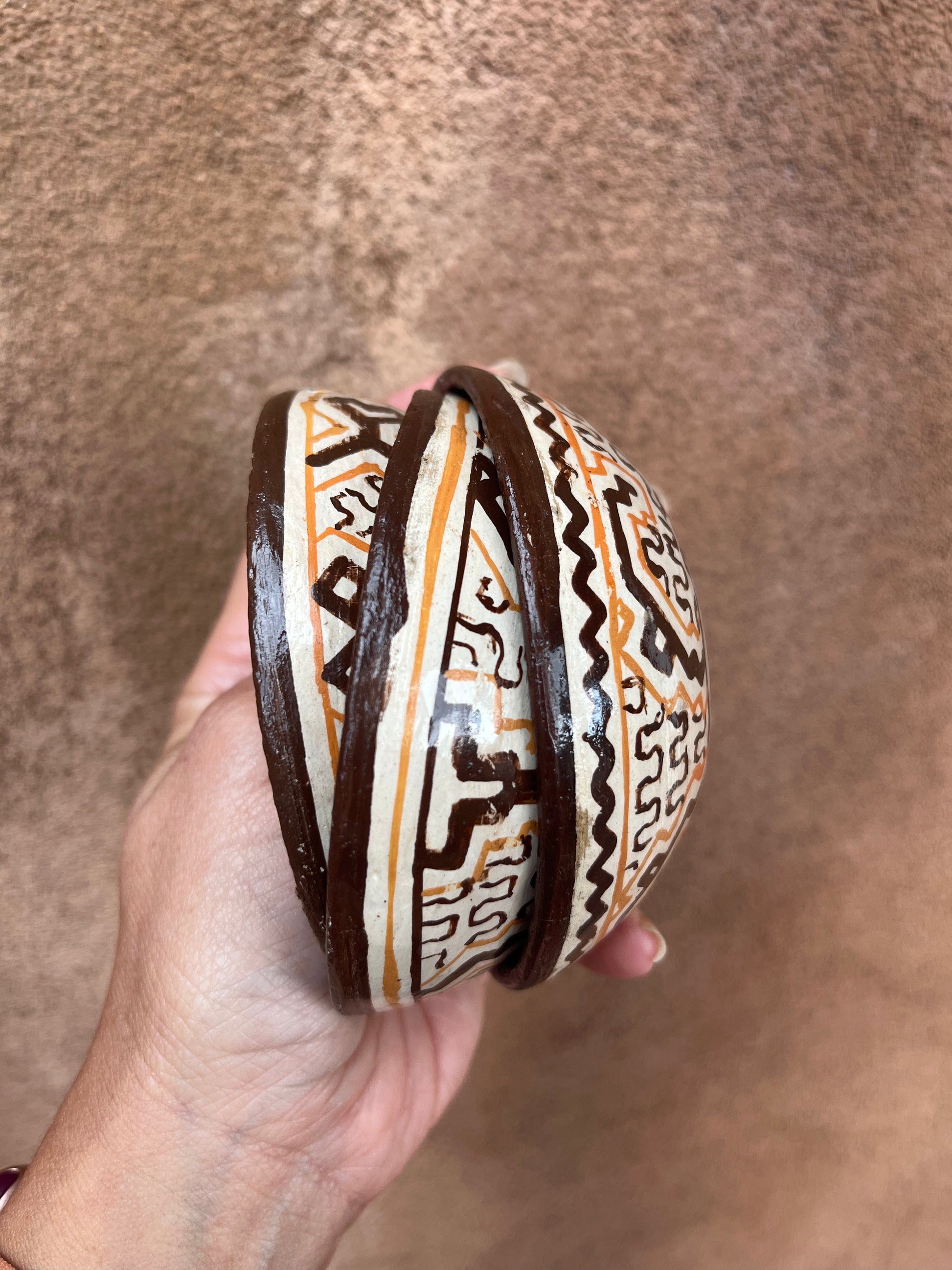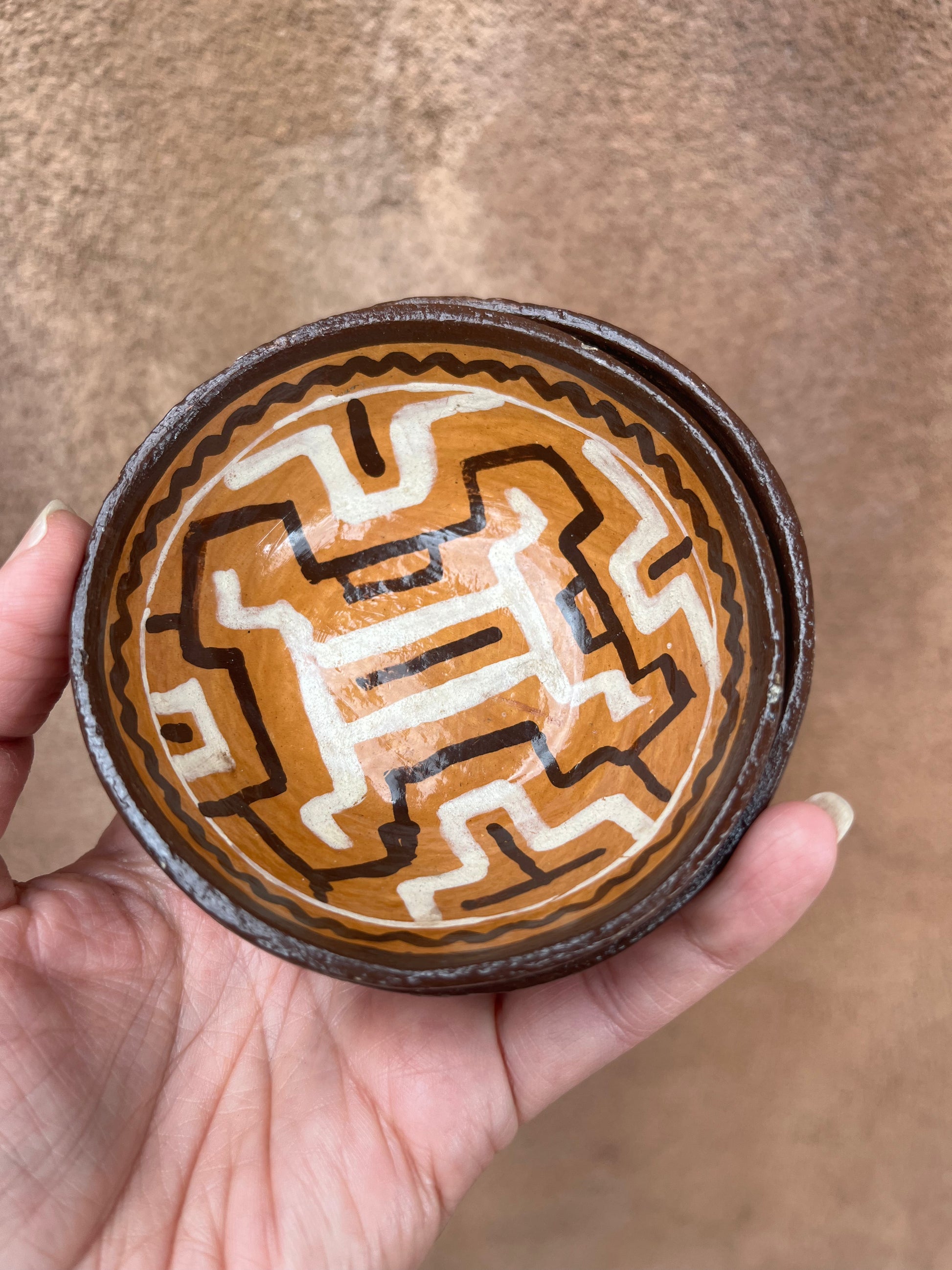 Handbuilt ceramic mini bowls from the Peruvian Amazon. Sandra Pacaya Panduro is a master ceramic artist form the Shipibo-Conibo Indigenous community near Pucallpa, Peru. Sandra collects the clay and pit fires the pieces and uses colored clay to paint them with the sacred patterns characteristic of her community. The handprinted designs represent the ayahuasca visions that are central to the cosmology and culture of this ancient civilization.