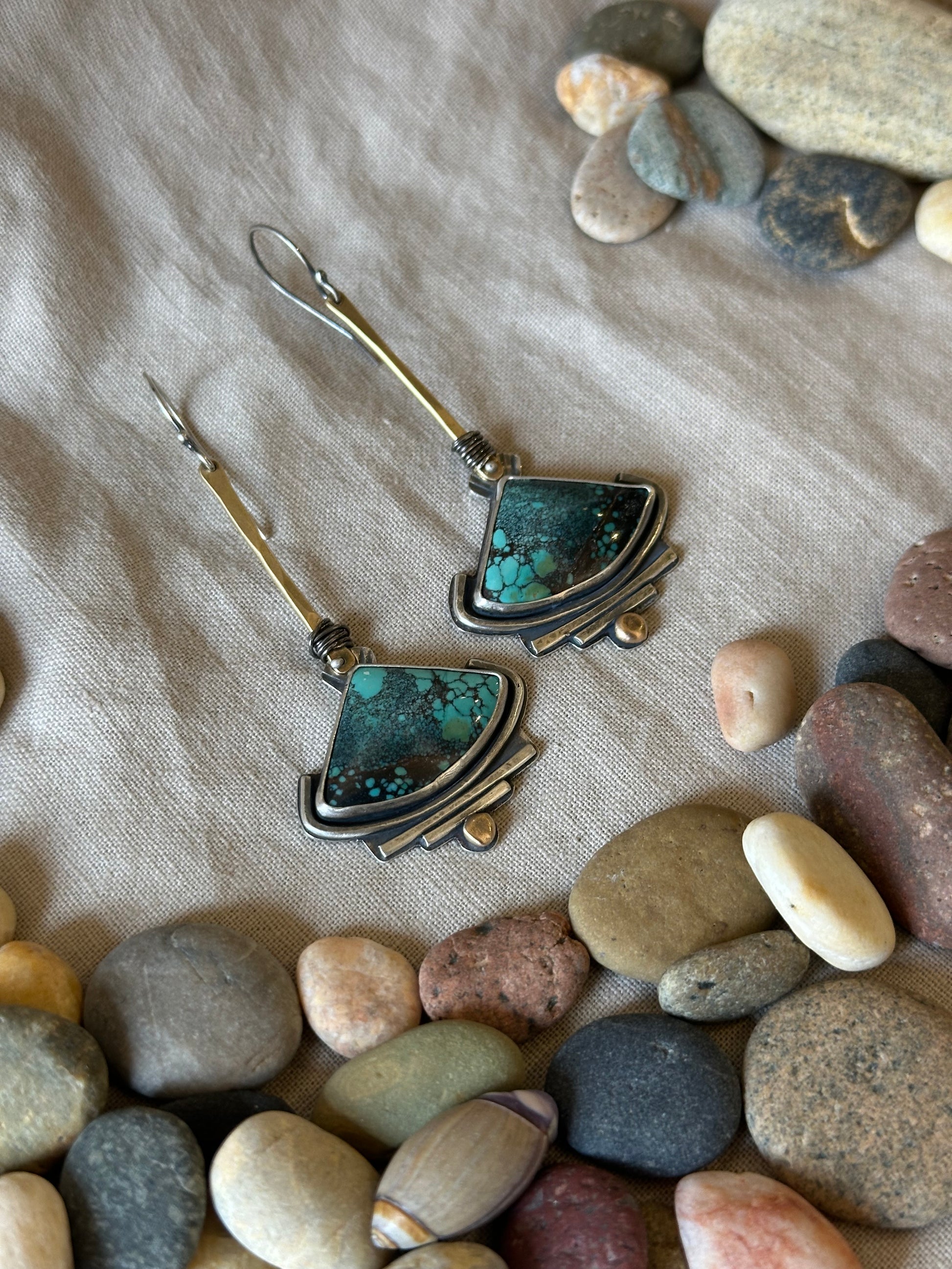 Blue Moon Turquoise Geometric earrings - sterling silver and brass