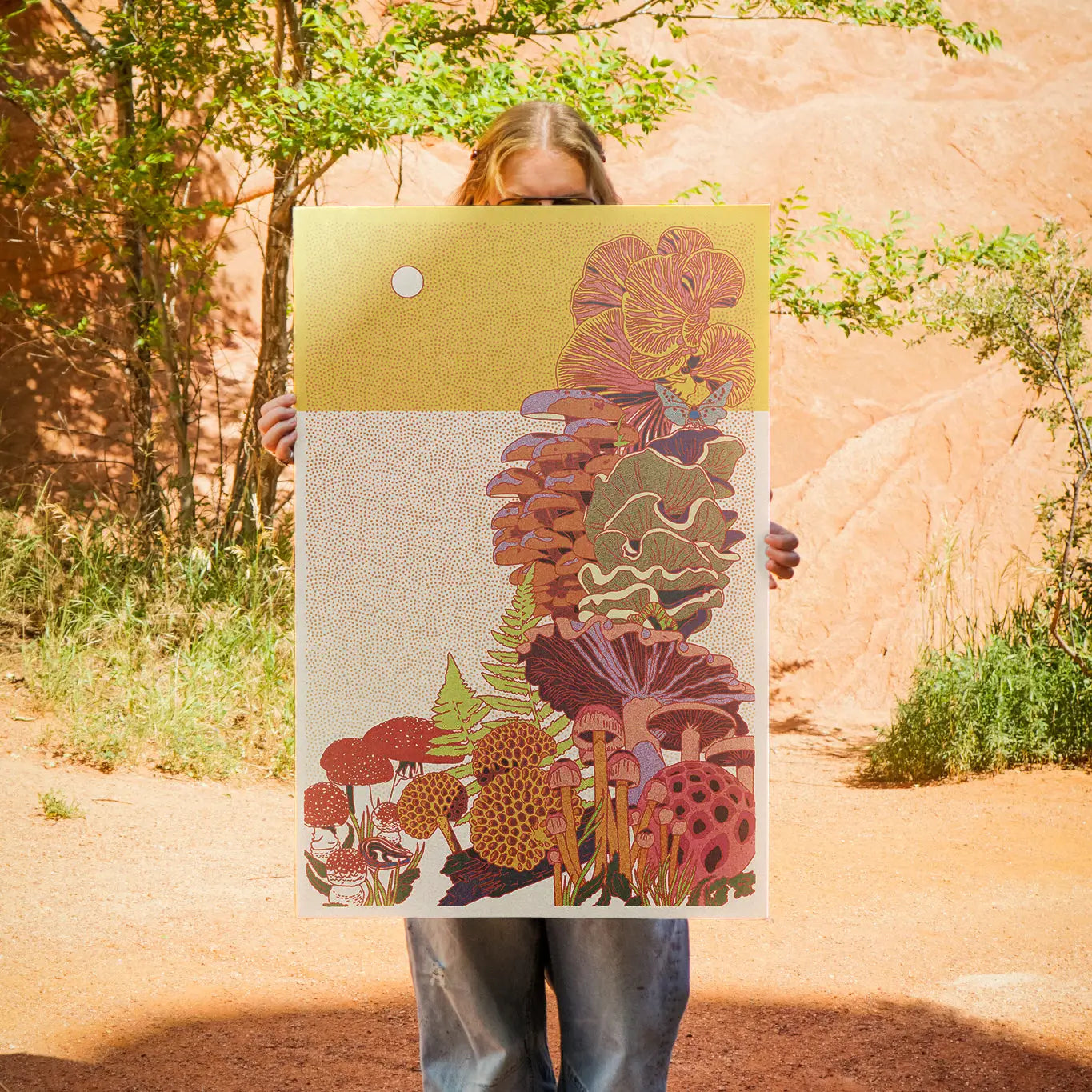 Mushroom Planet 24" x 36" print. Digitally printed on high quality, pulpy off-white card stock paper. Can be purchased unframed or in a solid wood frame.