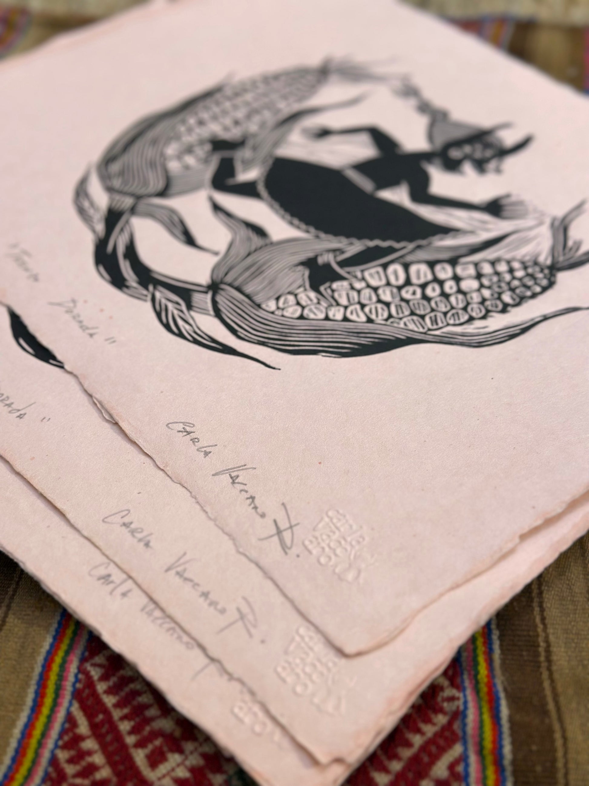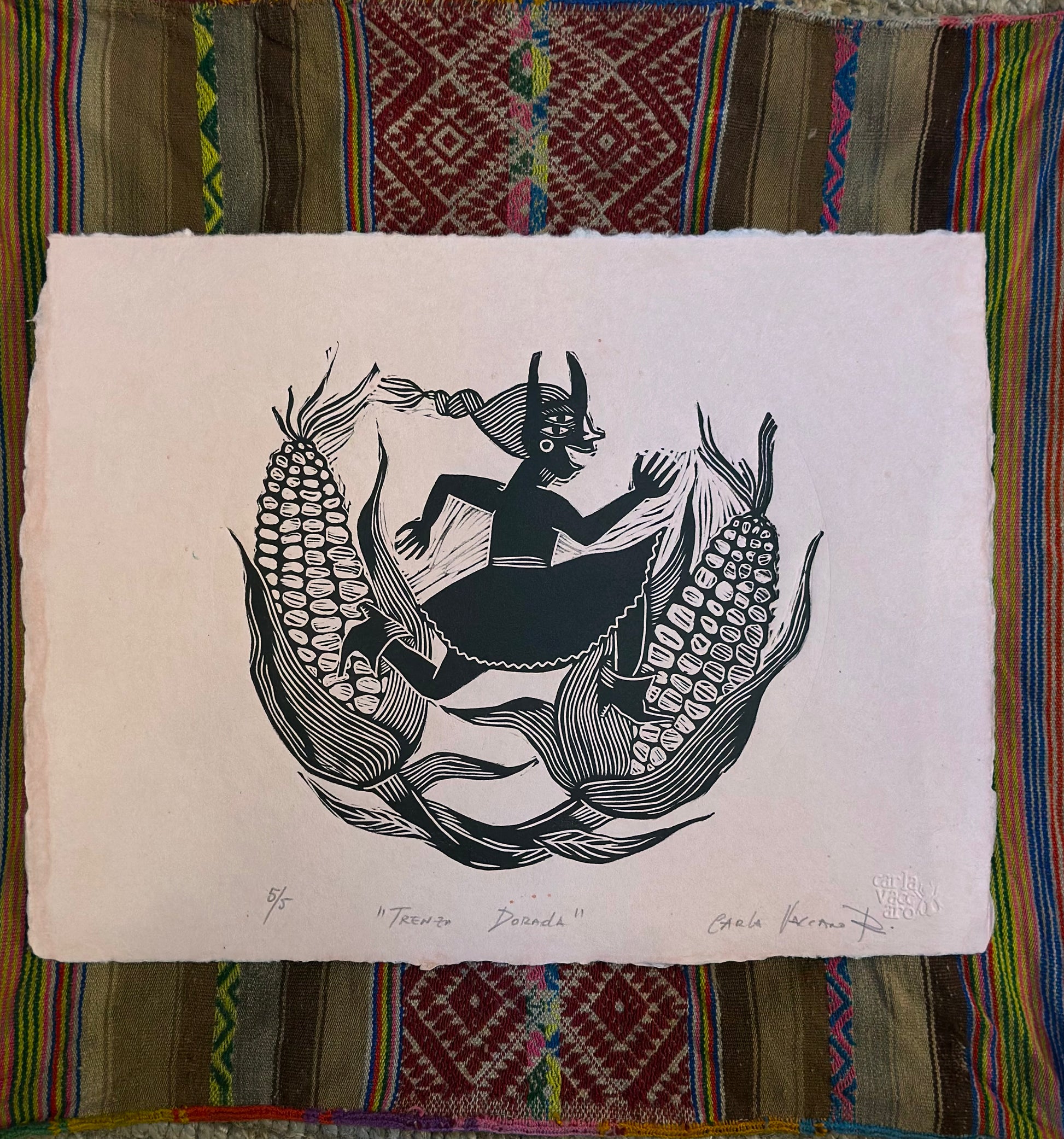 This is "Trenza Dorada", a lino print using handmade paper produced in the center's Living Museum of Paper from materials such as cotton, denim and kozo (paper mulberry) This paper is used by artists who complete residencies or workshops at La Ceiba Grafica, which is a printmaking center in Veracruz, Mexico.