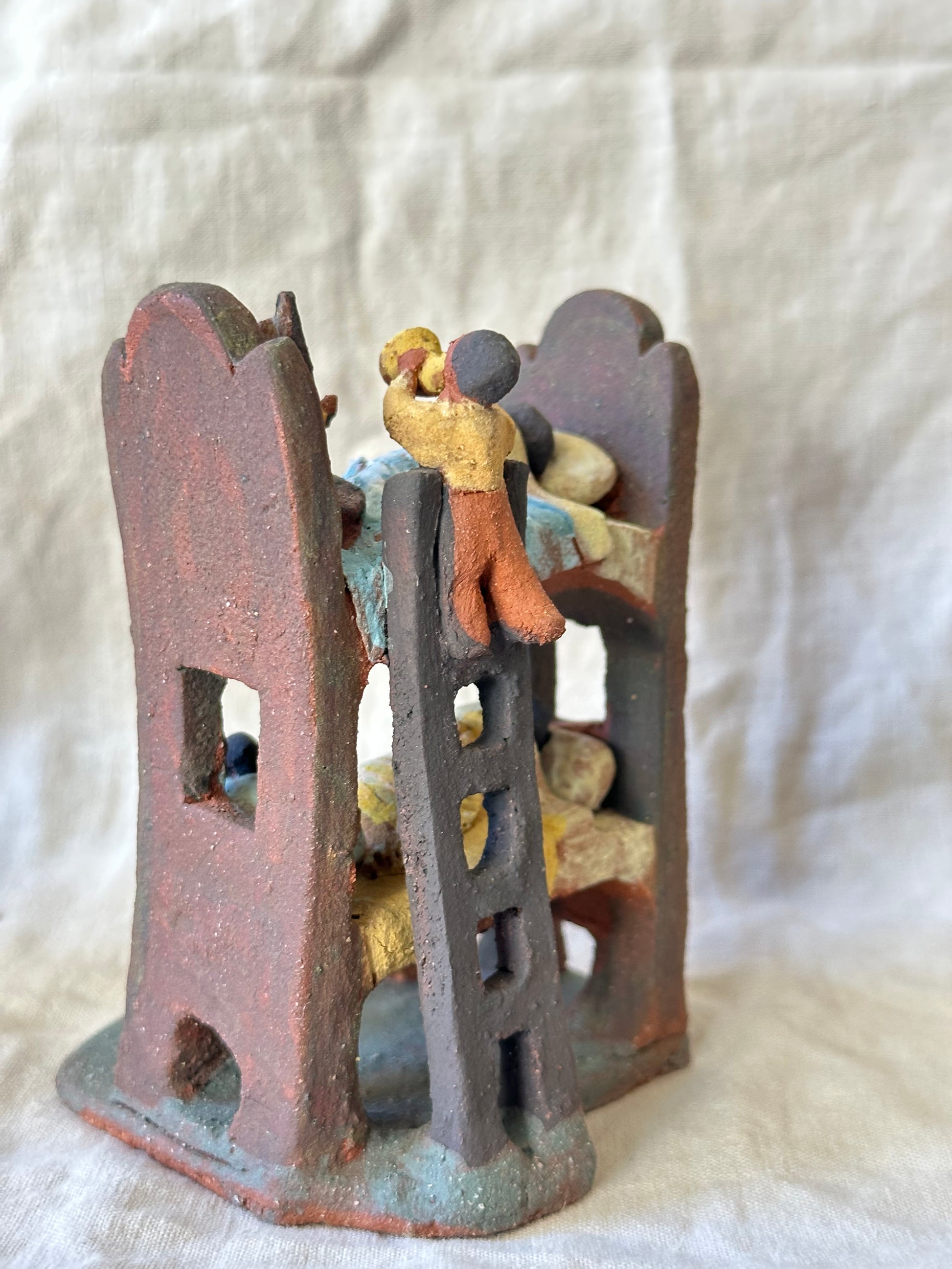 “I have been working with clay for almost twenty years. I first studied art at Rhode Island School of Design, and then I went on to do puppetry for several years with the Bread and Puppet theater in Vermont. My love of clay and puppets led me into making moving clay toys, whistles and bells and I have been making miniature clay works ever since. Growing up in a big family and spending much time in Peru during my childhood has also greatly influenced my work.”