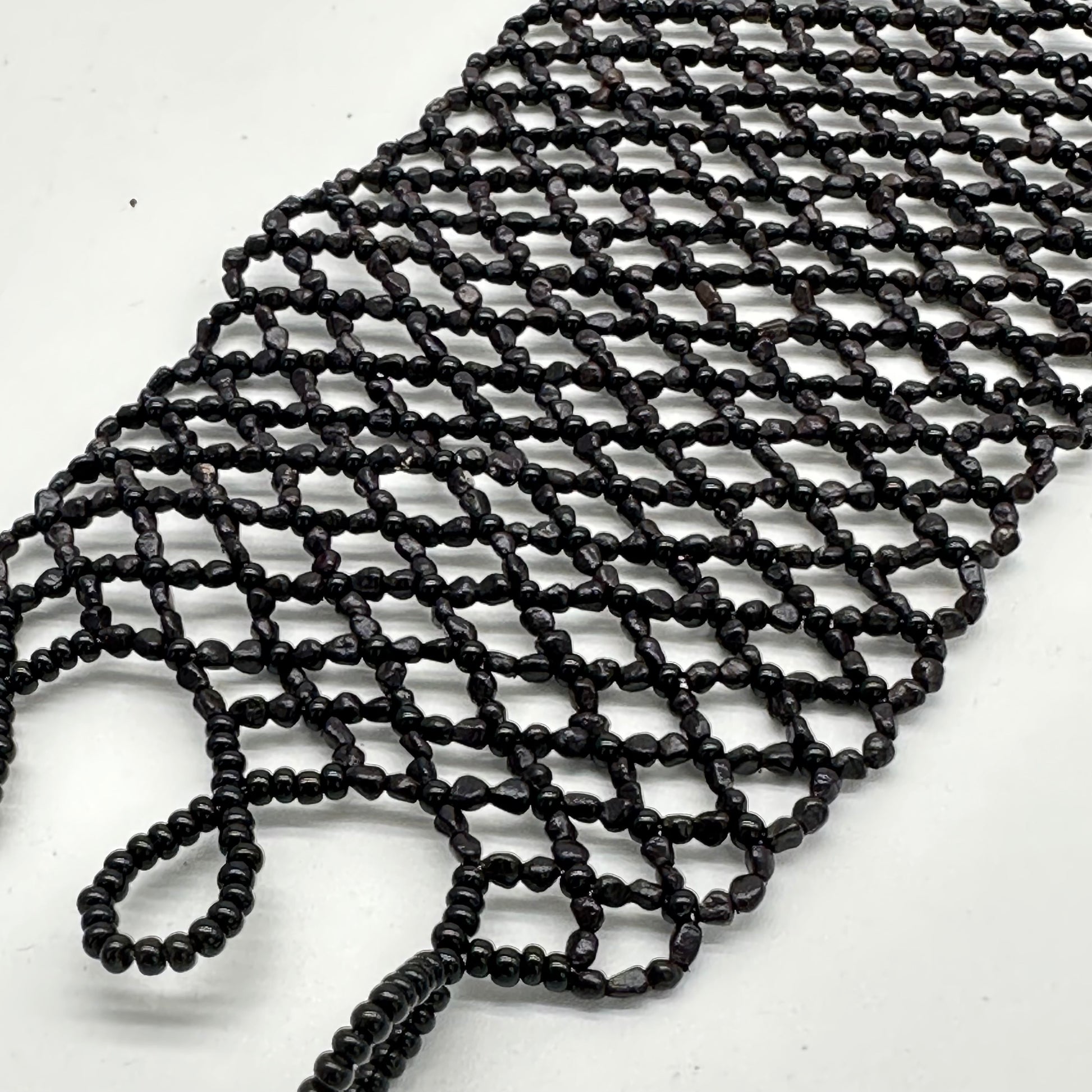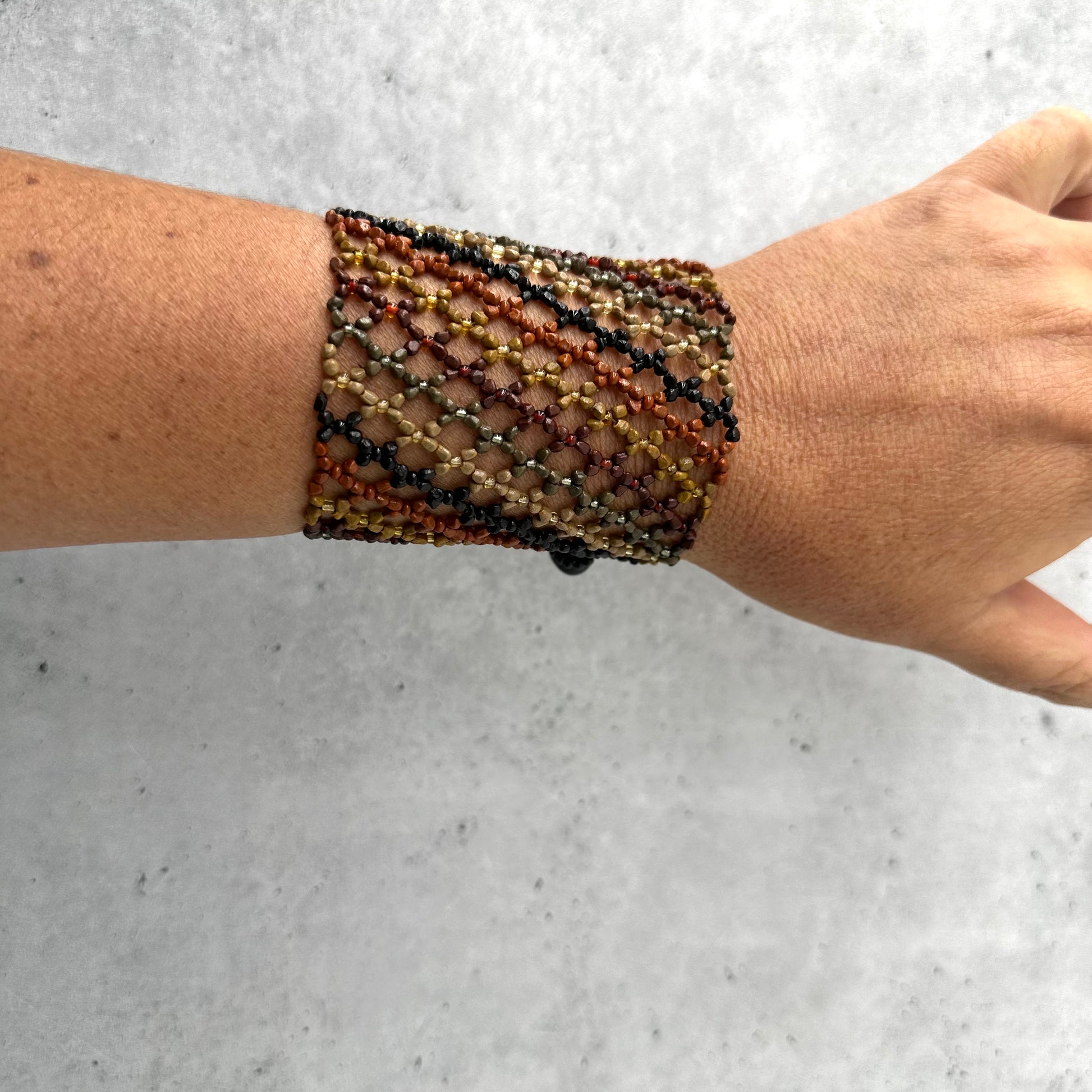 Dimensions: 6.5” long by 2.75” wide approx, the bracelet is made with nylon that makes the piece flexible. 3 big seeds work as clasps.