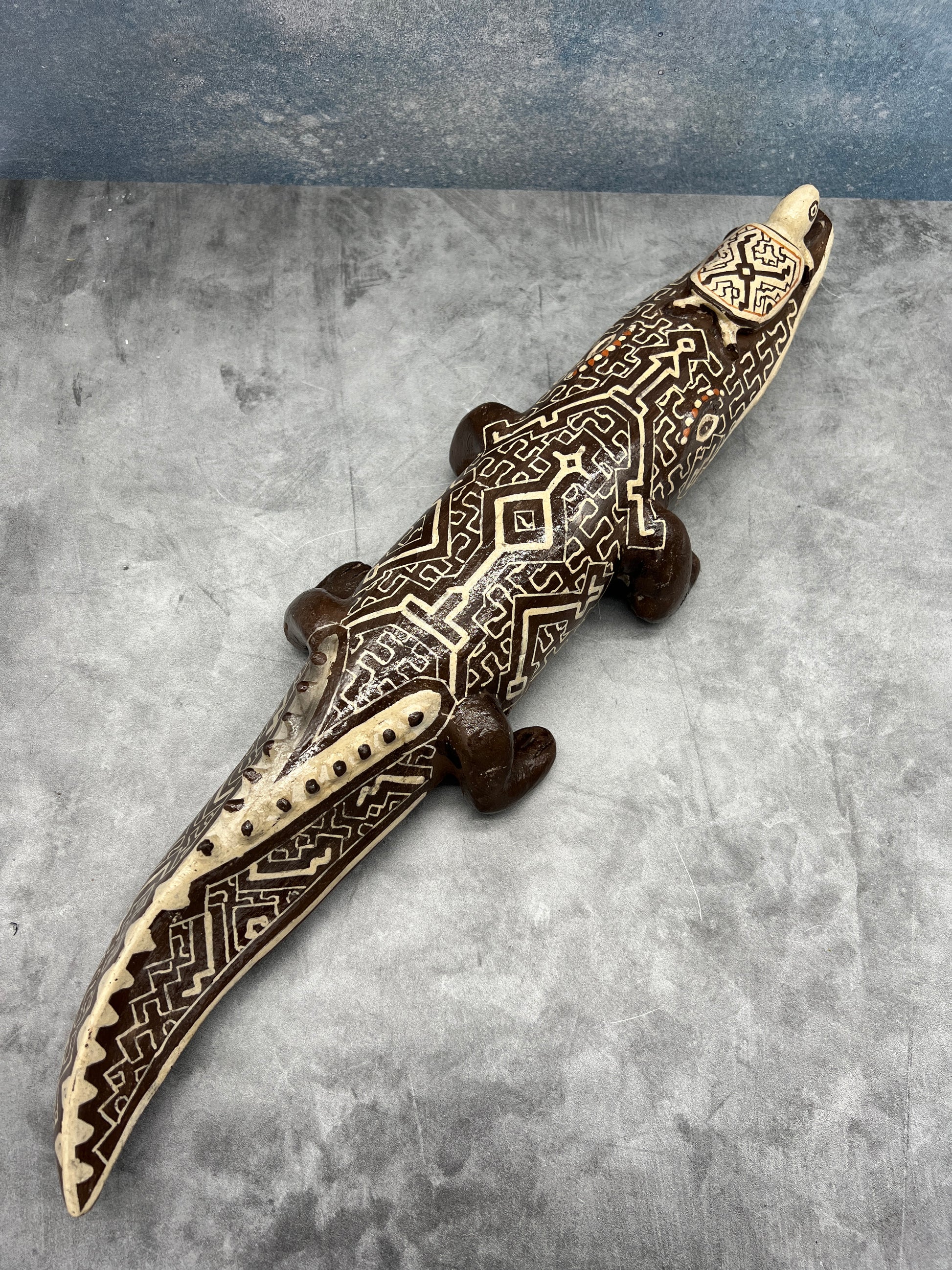 Handbuilt ceramic cayman with turtle from the Peruvian Amazon. Lily Panduro is a master ceramic artist form the Shipibo-Konibo Indigenous community near Pucallpa, Peru. These pieces are each one of a kind and represent the different animal spirits that protect the rainforest. Lily collects the clay and pit fires the pieces and uses colored clay to paint them with the sacred patterns characteristic of her community. The handprinted designs represent the ayahuasca visions that are central to the cosmology and culture of this ancient civilization.