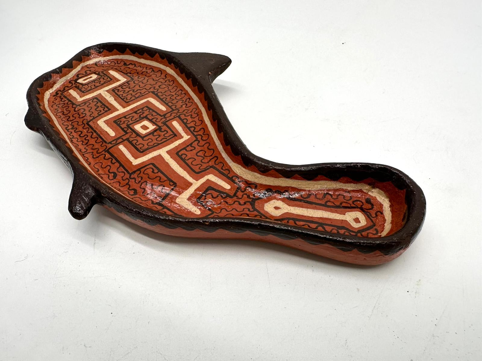 Handbuilt ceramic river fish platter from the Peruvian Amazon. Sandra Panduro is a master ceramic artist form the Shipibo-Konibo Indigenous community near Pucallpa, Peru. These pieces are each one of a kind and represent the different animal spirits that protect the rainforest. Sandra collects the clay and pit fires the pieces and uses colored clay to paint them with the sacred patterns characteristic of her community. The handprinted designs represent the ayahuasca visions that are central to the cosmology and culture of this ancient civilization.