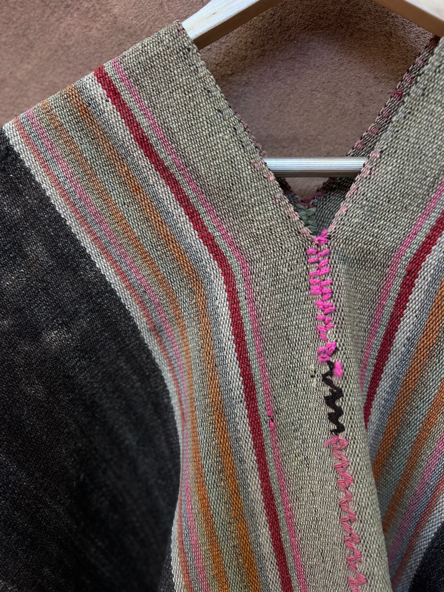 This is an antique poncho handwoven on a waist loom in the Sacred Valley of Cusco.