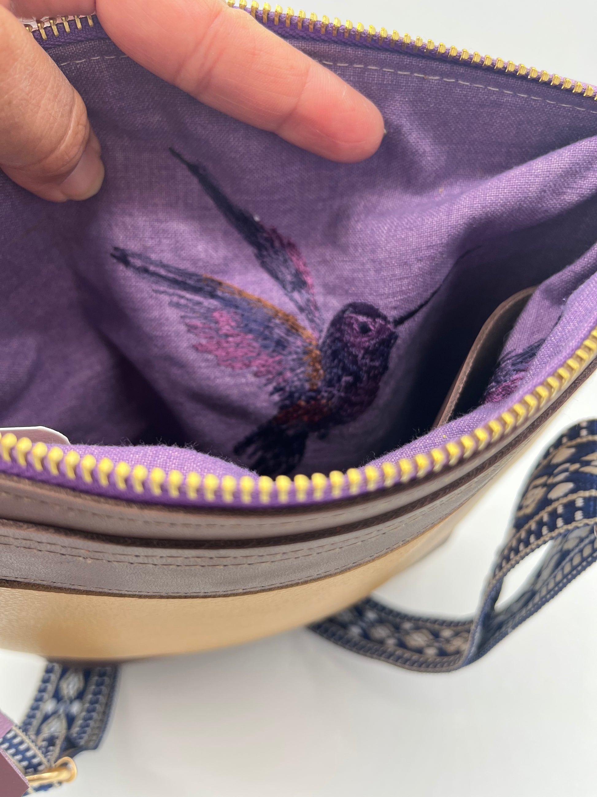 - Dimensions: Length 11" x Width 9.5" purple interior print hummingbirds