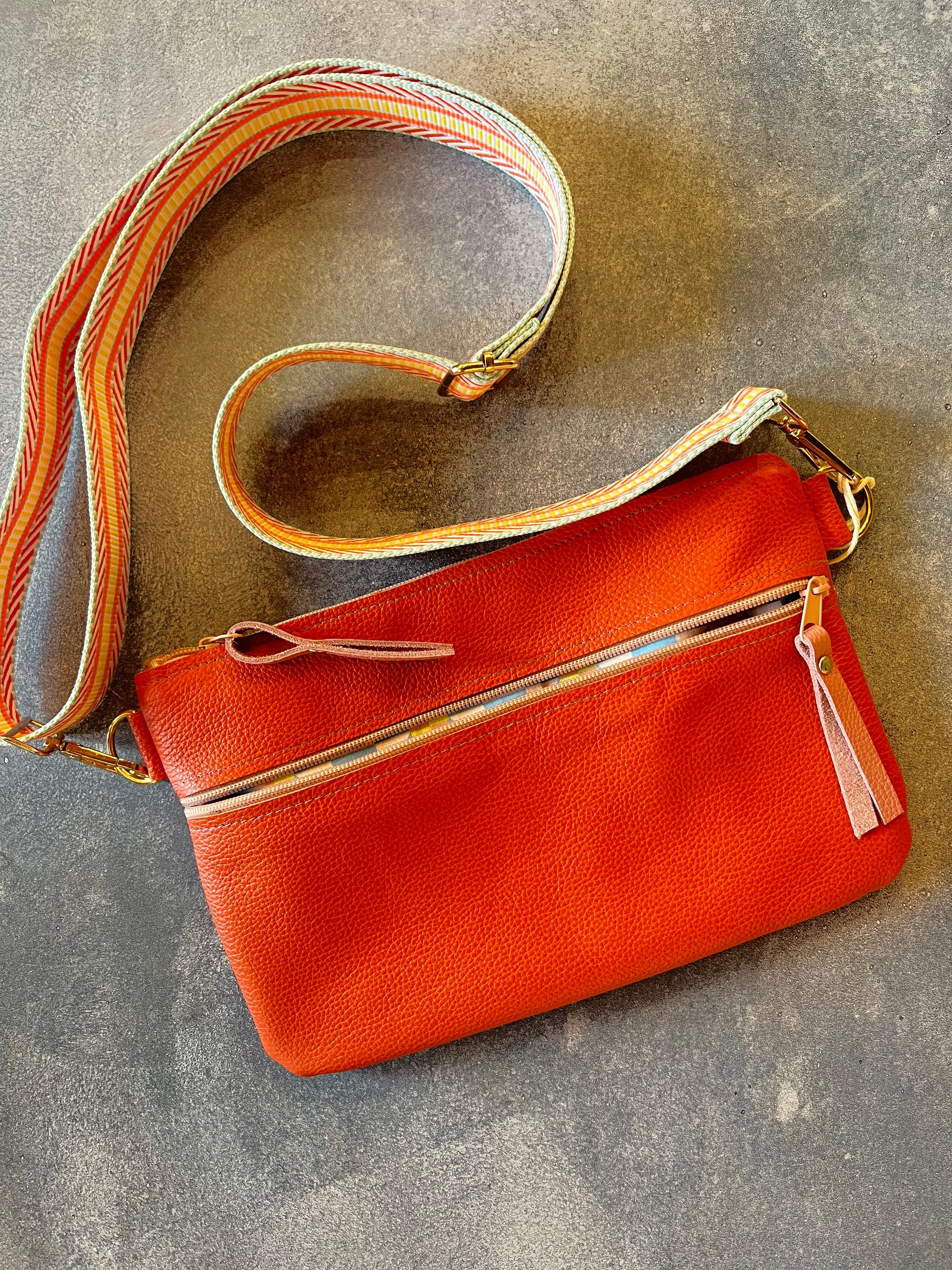 This bag measures 7 inches tall and 10 inches wide, crafted with a secure zipper and fully lined for durability. Handmade by Rachel Reyes in her studio in Albuquerque, New Mexico, these bags come with a colorful pattern adjustable strap for comfortable crossbody wear and feature a convenient back pocket that fits your iPhone perfectly. Discover the perfect blend of functionality and style!