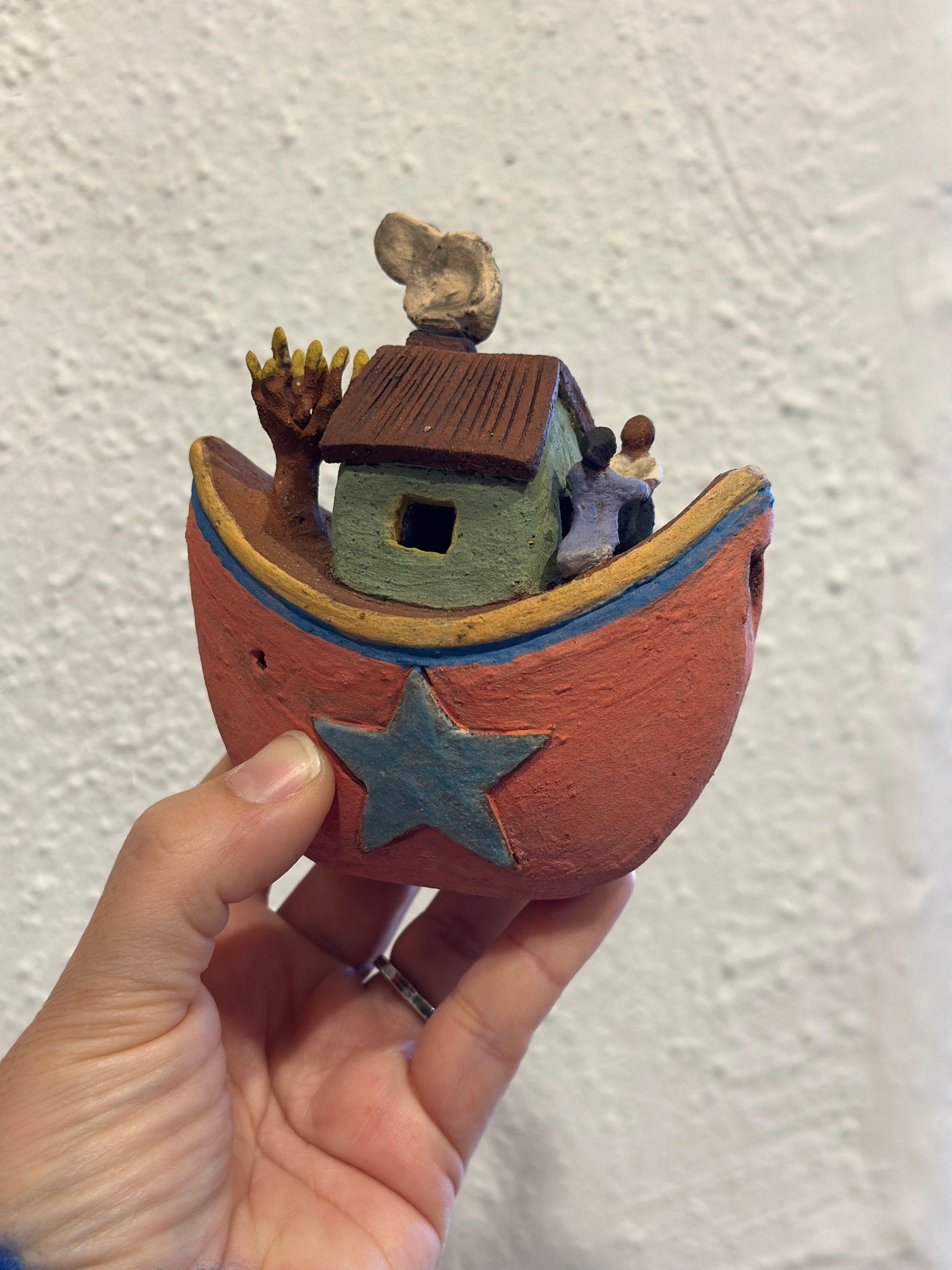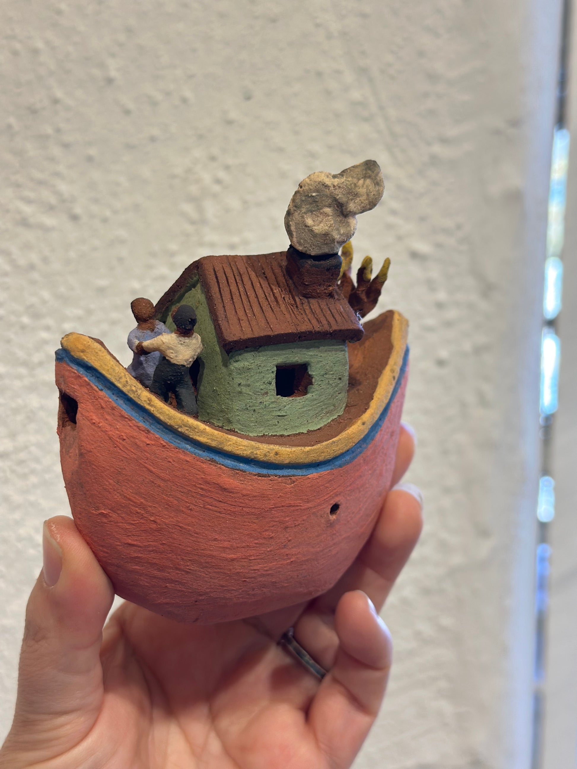 “I have been working with clay for almost twenty years. I first studied art at Rhode Island School of Design, and then I went on to do puppetry for several years with the Bread and Puppet theater in Vermont. My love of clay and puppets led me into making moving clay toys, whistles and bells and I have been making miniature clay works ever since. Growing up in a big family and spending much time in Peru during my childhood has also greatly influenced my work.”