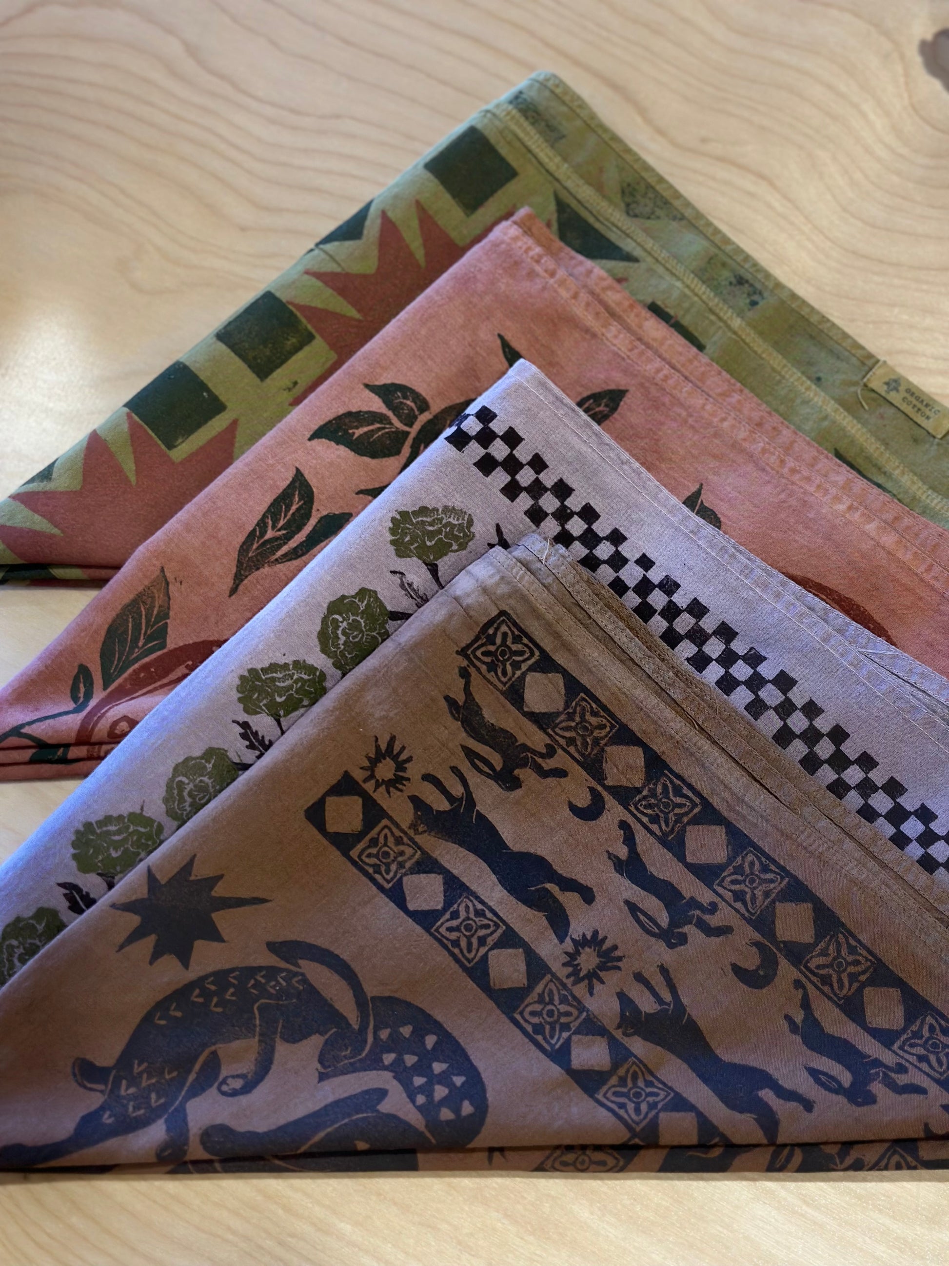 Hand dyed and printed wearable art. Botanical dyed bandanas