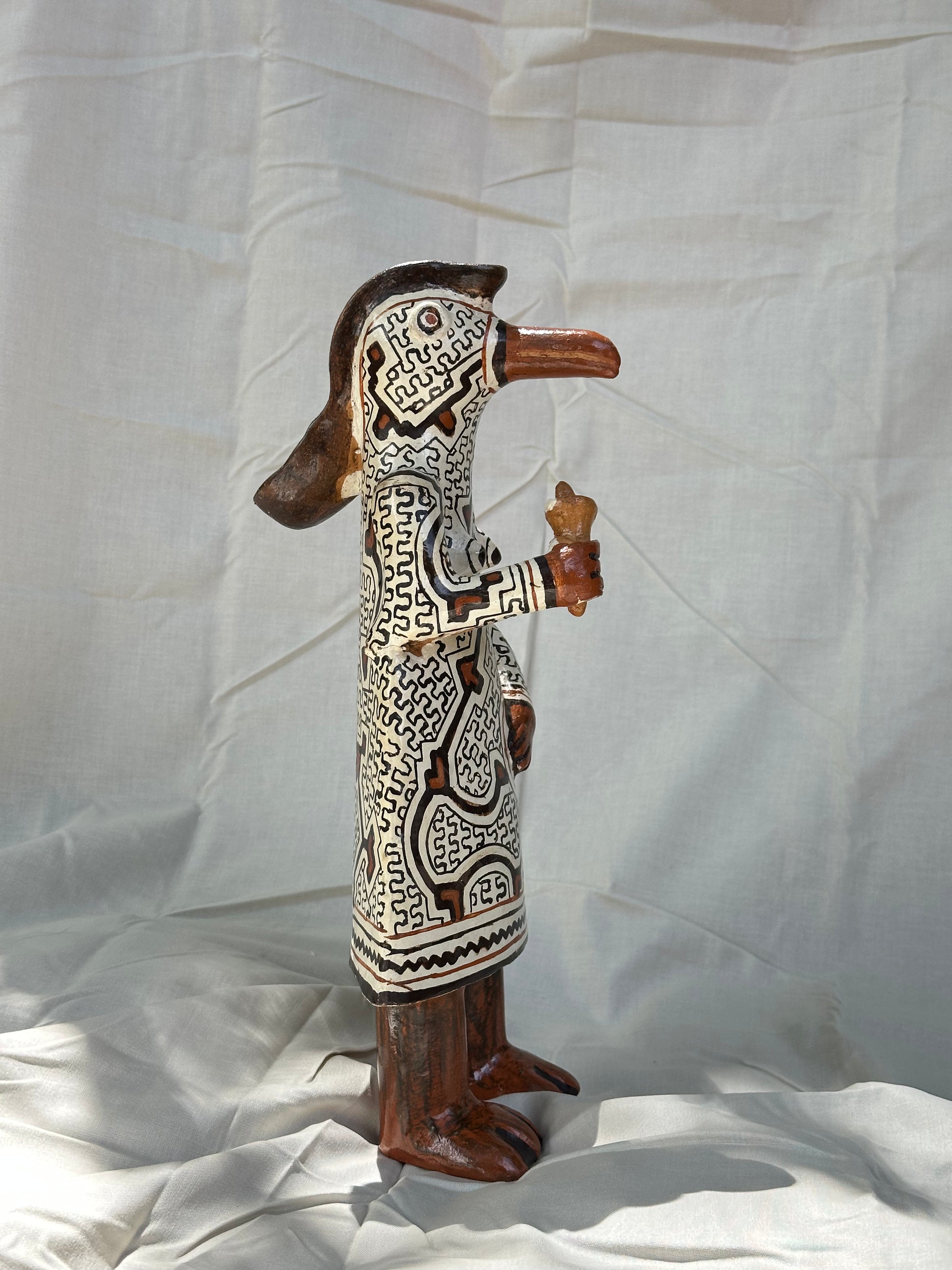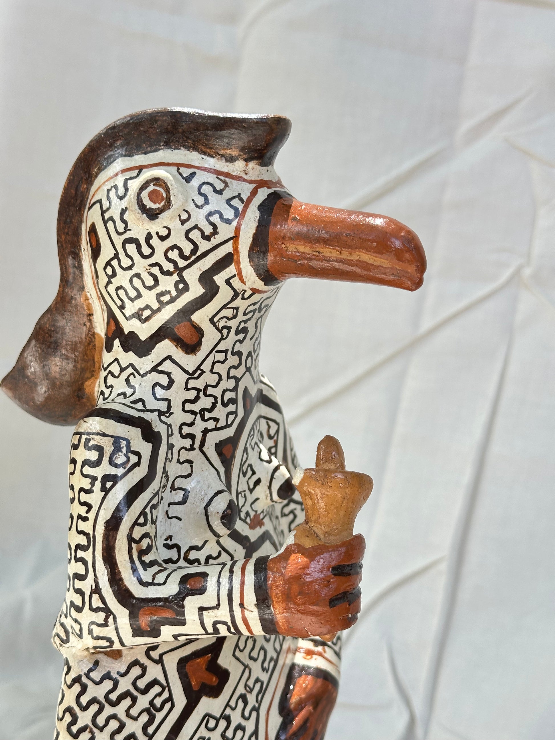 Handbuilt ceramic Hummingbird from the Peruvian Amazon. Sandra Panduro is a master ceramic artist form the Shipibo-Konibo Indigenous community near Pucallpa, Peru. These pieces are each one of a kind and represent the different animal spirits that protect the rainforest. Sandra collects the clay and pit fires the pieces and uses colored clay to paint them with the sacred patterns characteristic of her community. The handprinted designs represent the ayahuasca visions that are central to the cosmology and culture of this ancient civilization.
