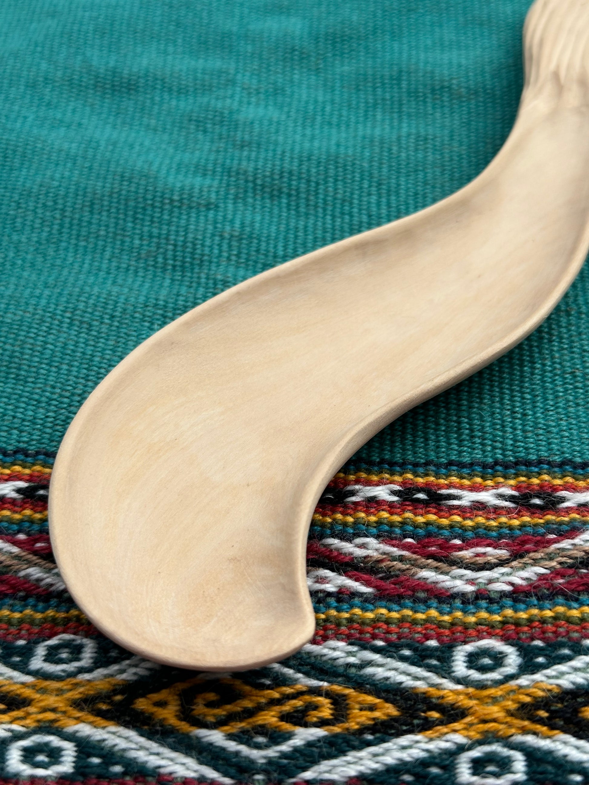 These utensils are made by a family of master wood carvers in Ayacucho, Peru. They harvest and use "unka", a shrub-like tree endemic to the Andes that is highly prized for its hard, almost white wood that has no taste or smell. The Ciprian family is well-known for their highly detailed carvings and finely designed utensils that are made by hand.