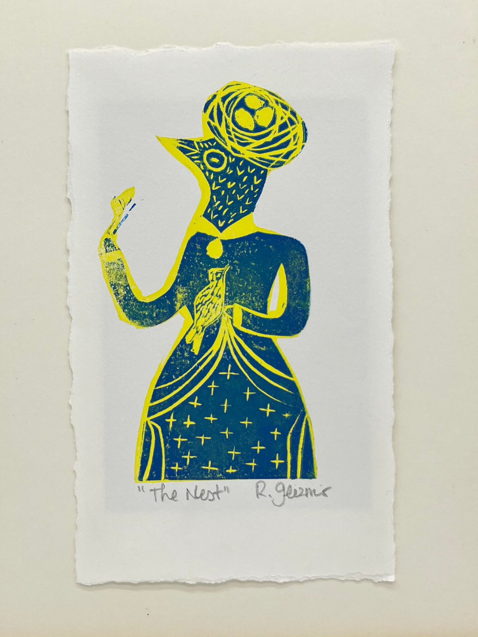 "The Nest" - Linocut Print 5x7 - Blue & yellow
