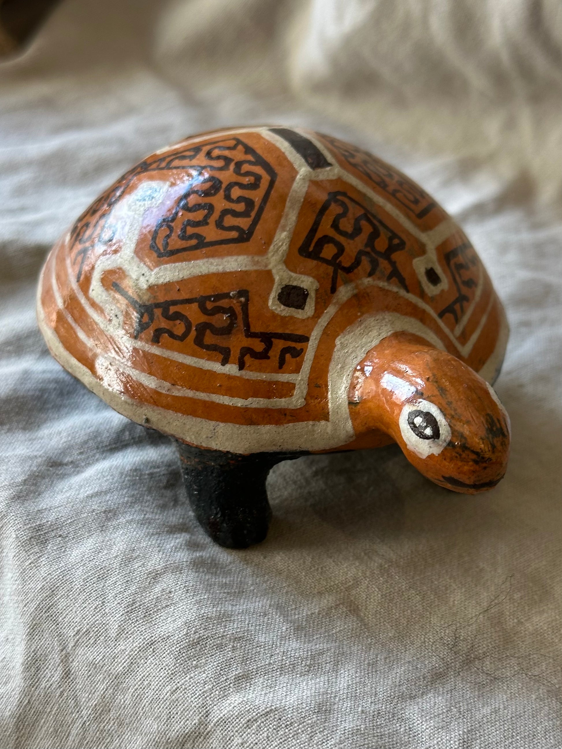 Handbuilt ceramic turtle from the Peruvian Amazon. Lily Panduro is a master ceramic artist form the Shipibo-Konibo Indigenous community near Pucallpa, Peru. These pieces are each one of a kind and represent the different animal spirits that protect the rainforest. Lily collects the clay and pit fires the pieces and then uses colored clay to paint them with the sacred patterns characteristic of her community. The designs represent the ayahuasca visions that are central to the cosmology and culture of this ancient civilization.