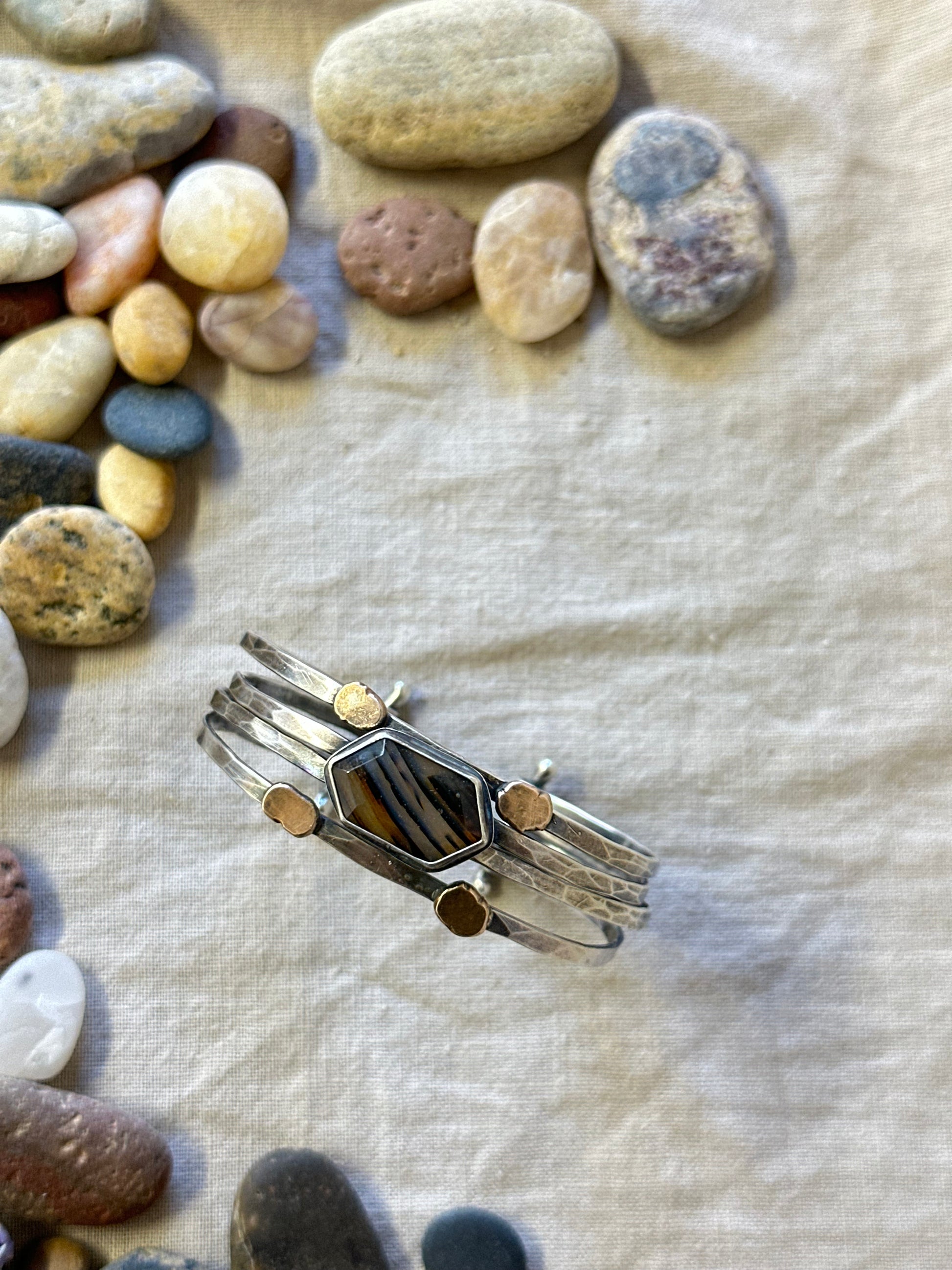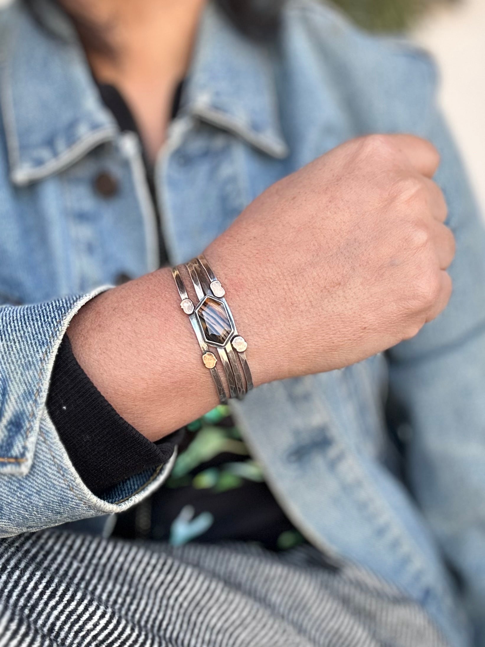 This sturdy sterling silver bracelet holds a hexagonal Montana Agate on a sturdy statement cuff constructed by 4 hammered texture wires. Balled ends wires keep all hand formed wire cuff connected and in place. I finished this cuff with a dark patina to accentuate the hammered texture. This cuff can be slightly formed to fit a many sizes.