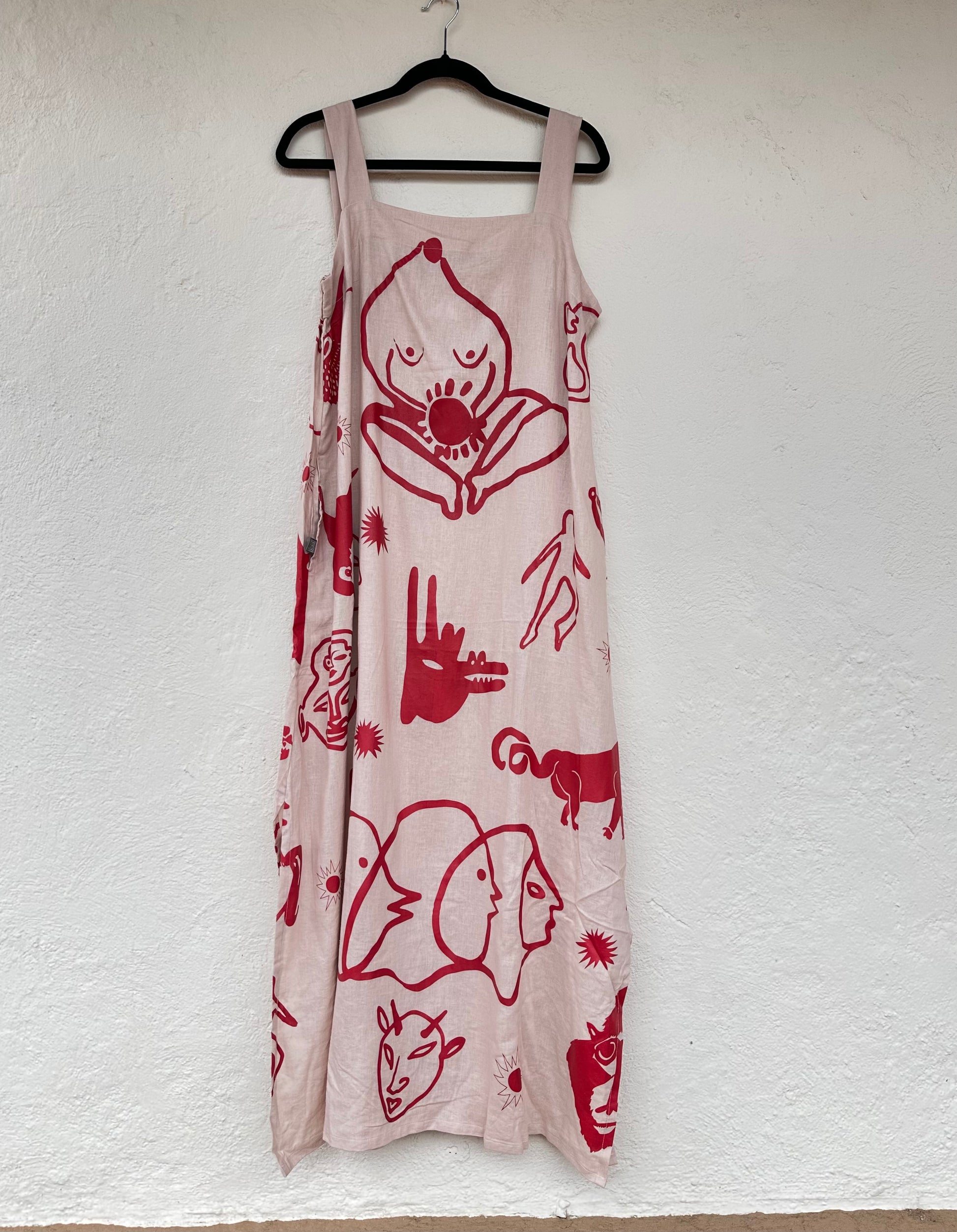 A cut long dress with wide shoulder straps. Pleated breast, elastic back.