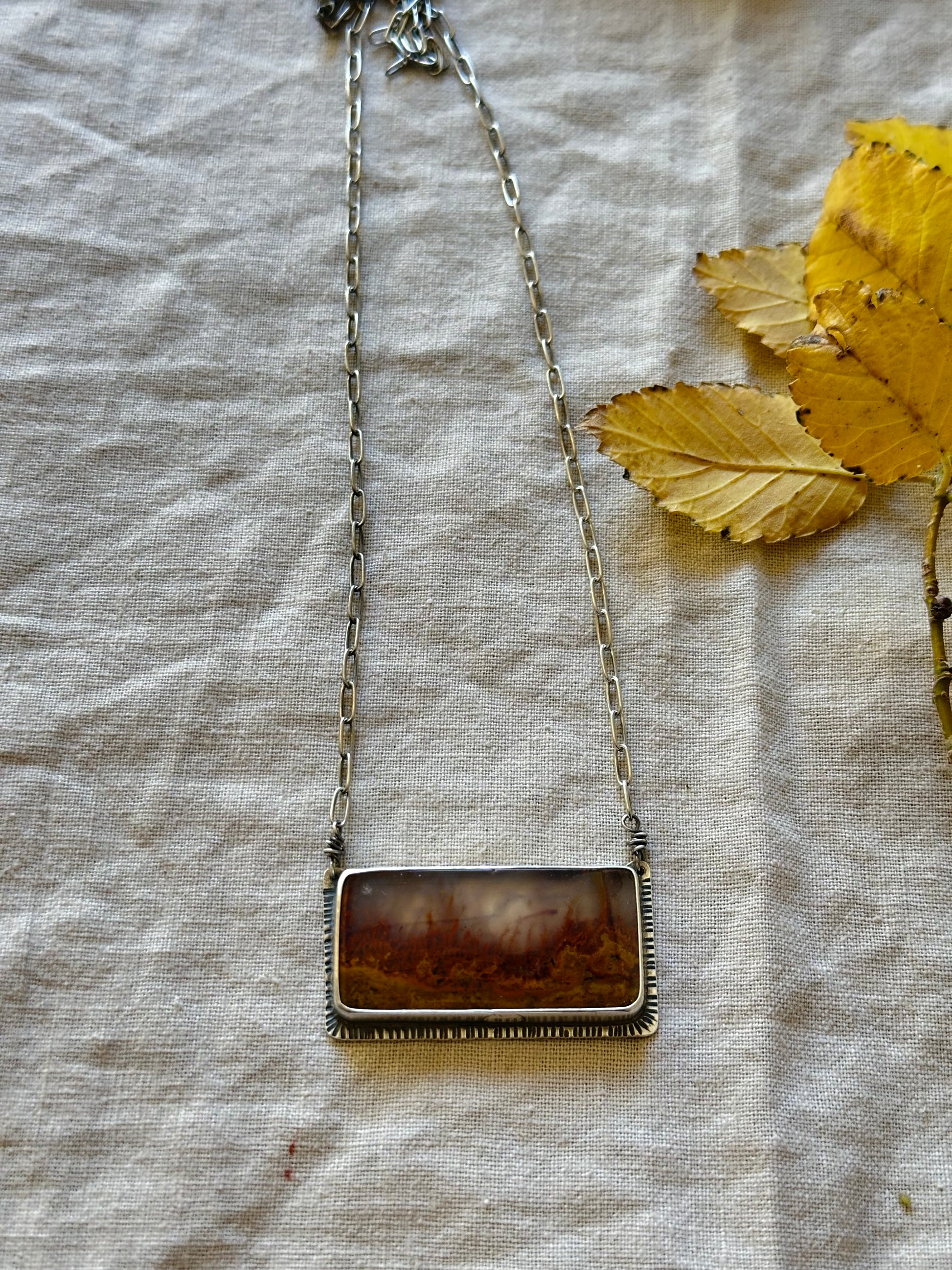 A unique rectangular piece of Mexican Flame Agate set in fine and Sterling Silver. The pendant has a Mesa Mountain silhouette saw on the back.