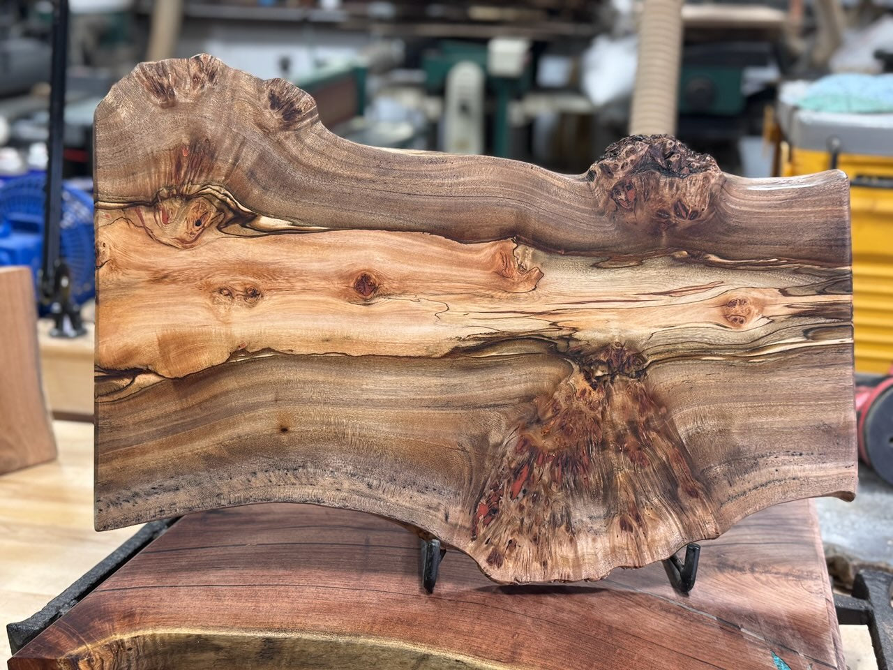 This is a charcuterie board/wall art made from a California Peppercorn Tree. Inlaid with crushed red coral. This board has a food safe finish and is meant to be functional or decorative