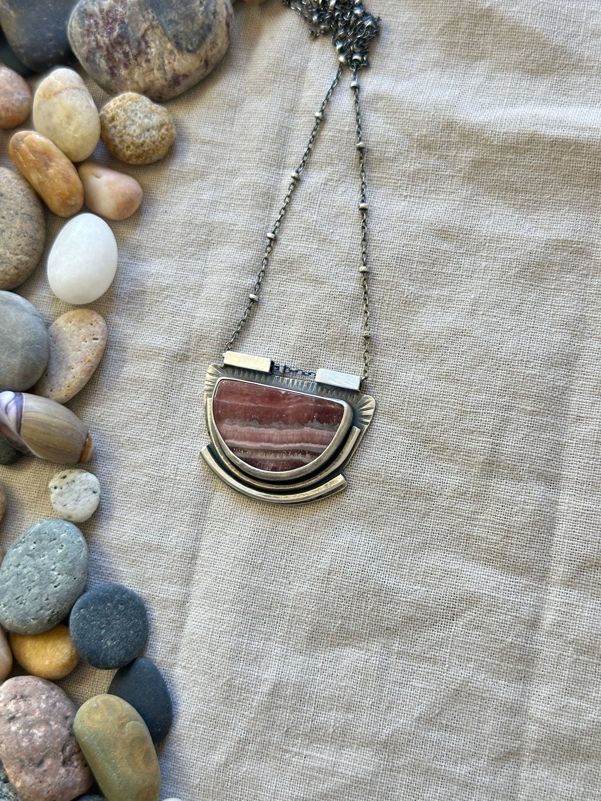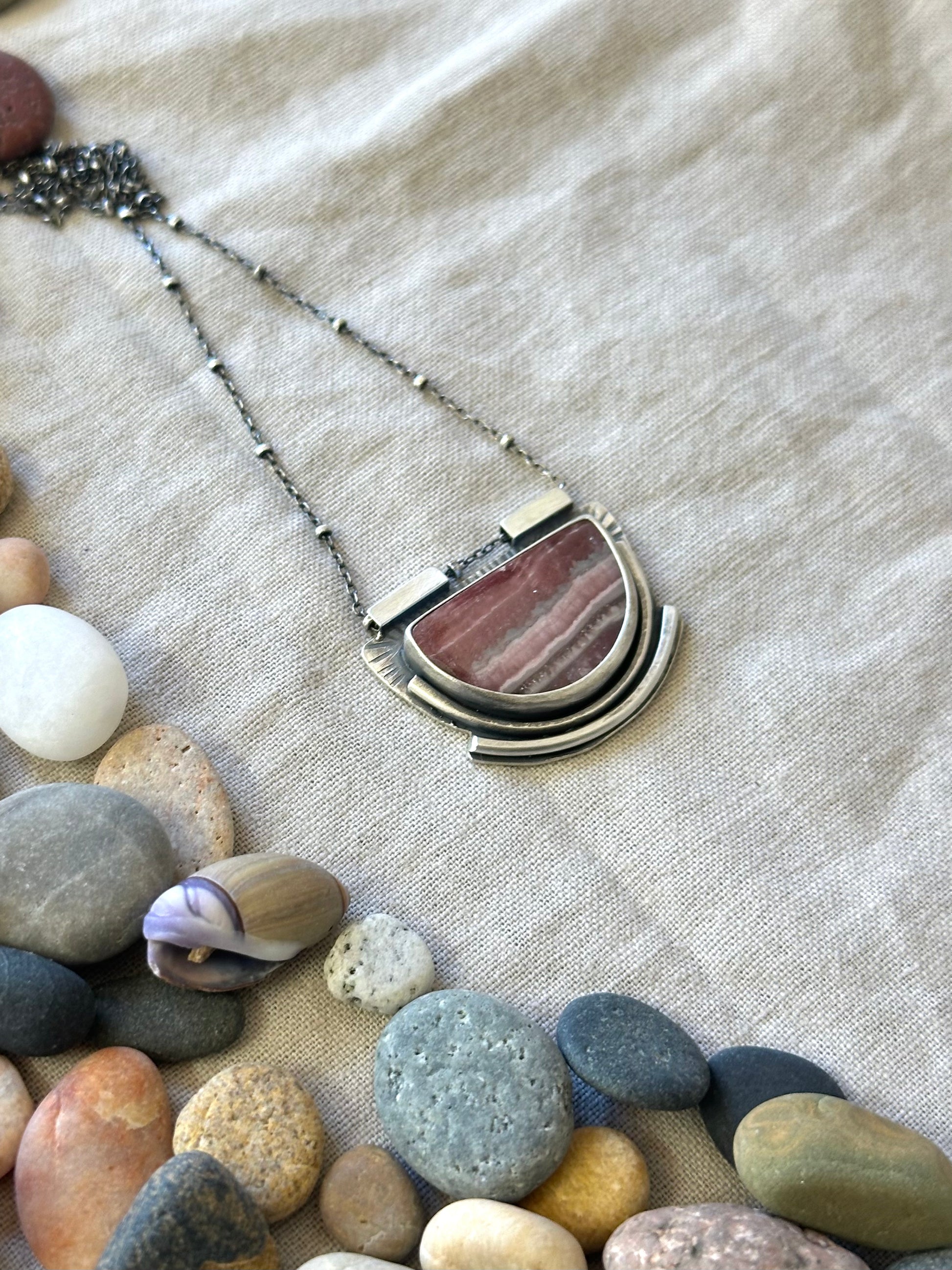 Handcrafted from sterling silver and set with Argentinian half circle Rhodochrosite. I applied a dark patina to add depth and highlight the texture.