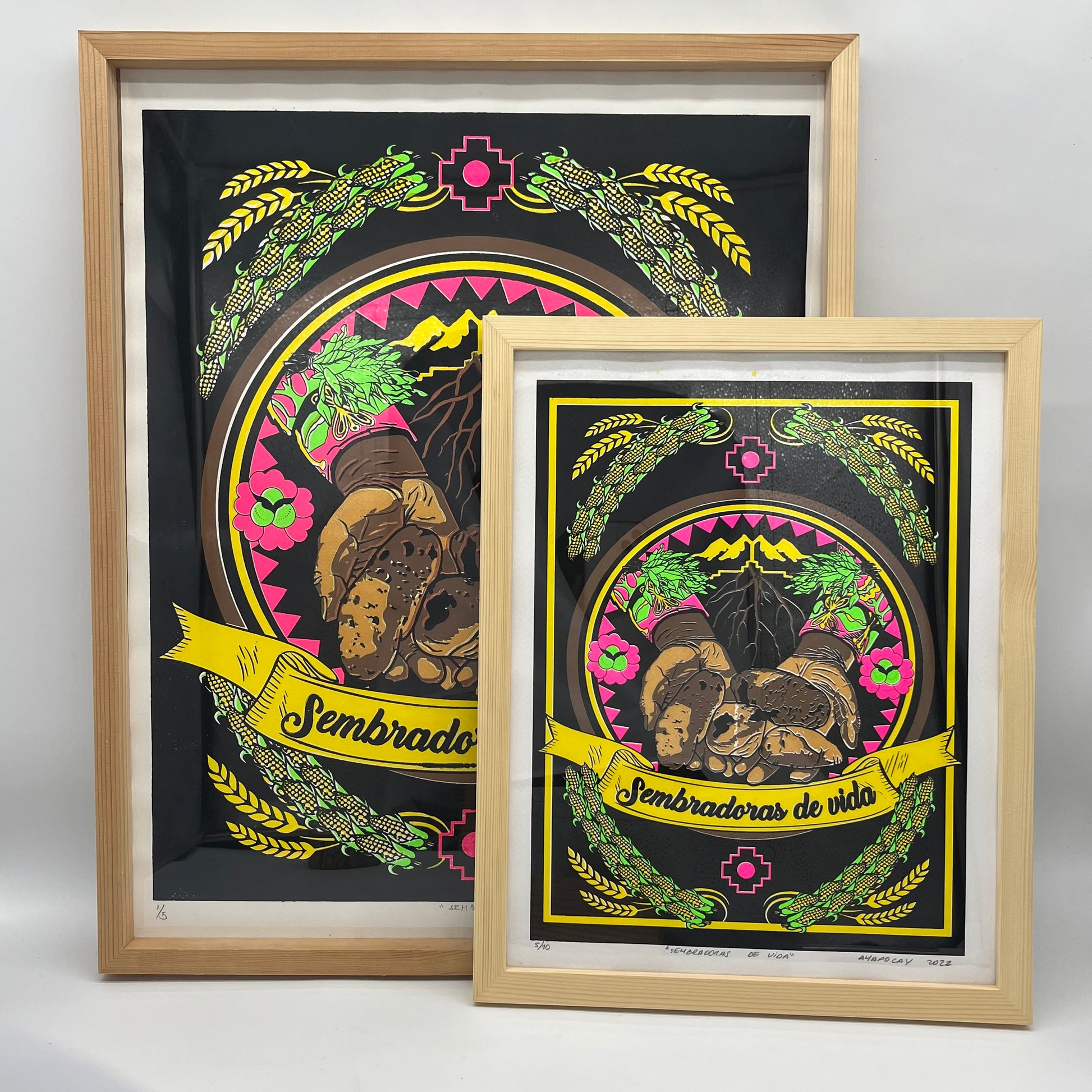 Amapolay uses silkscreen printing as a platform to elevate the struggles of Latin America's indigenous communities and resistance to colonialism. Their work draws on the popular art of Lima's working class neighborhoods and is heavily influence by the painting style and symbology brought by Andean and Amazonian migrants. The juxtaposition of traditional motifs within urban settings is commentary and celebration of Peru's multicultural heritage, interpreted in their signature electric color palette.