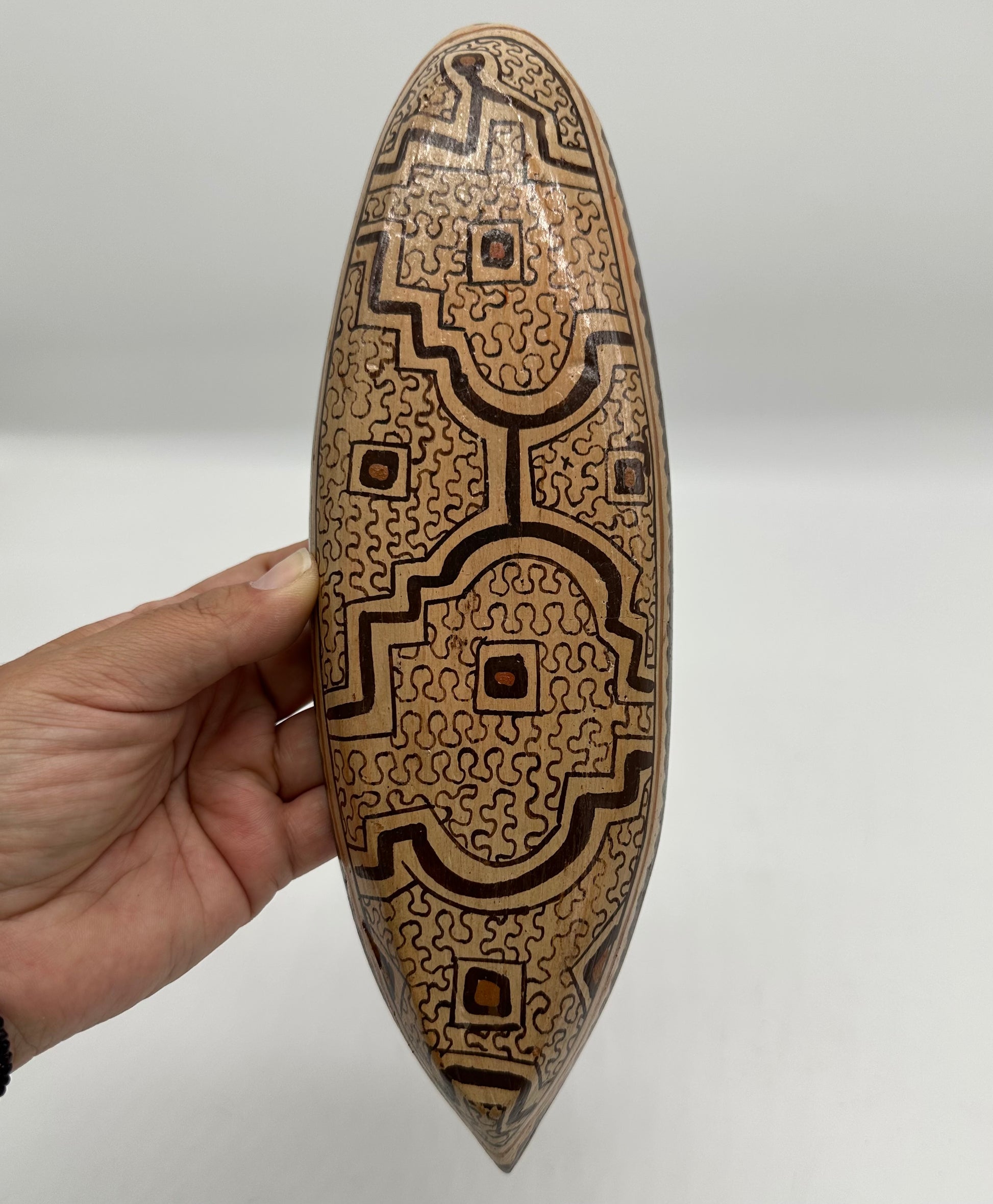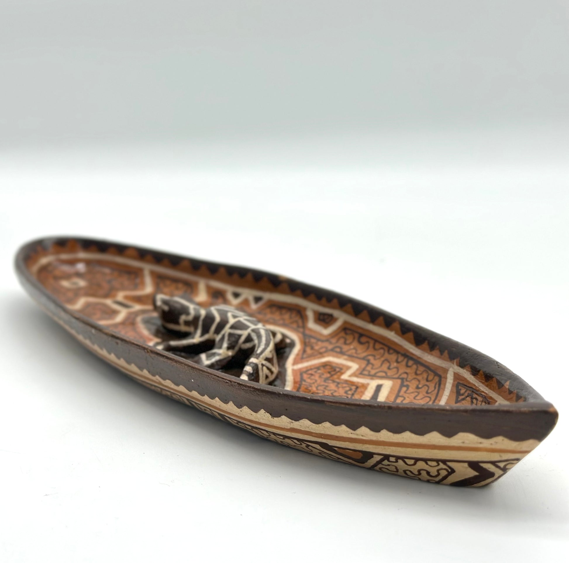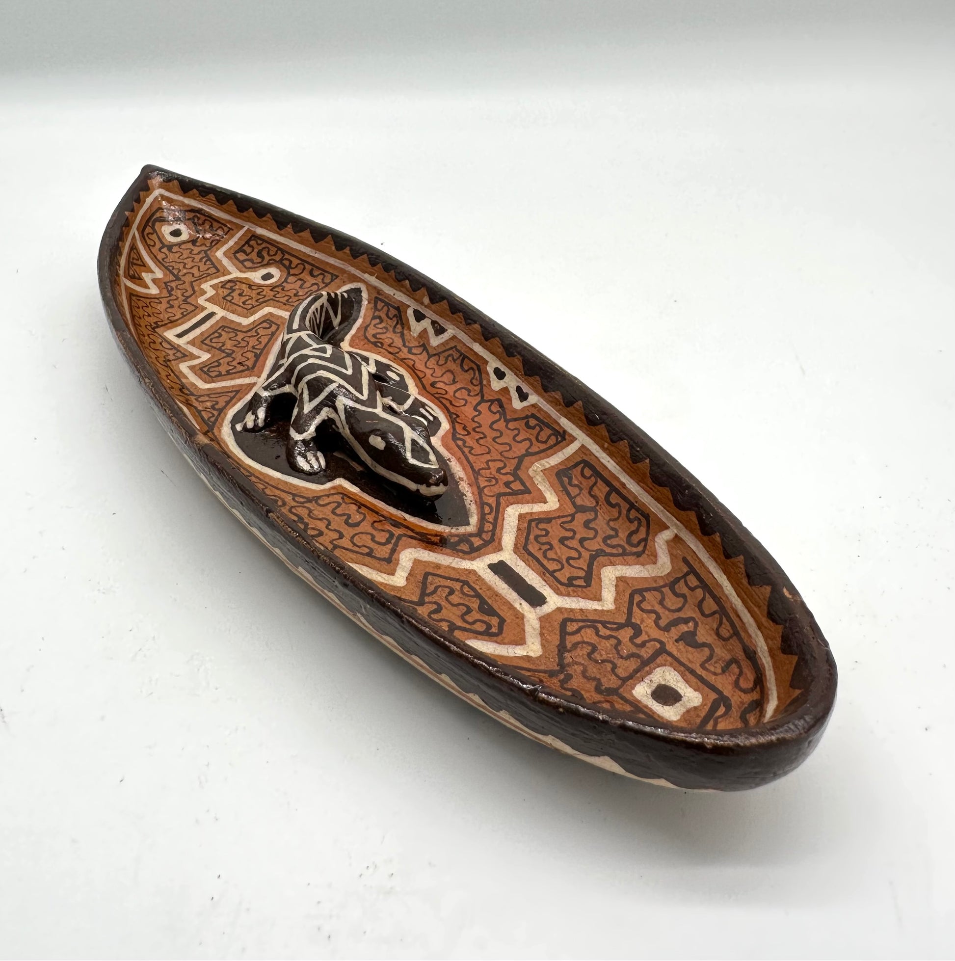 Handbuilt ceramic canoe with caiman from the Peruvian Amazon. Sandra Panduro is a master ceramic artist form the Shipibo-Konibo Indigenous community near Pucallpa, Peru. These pieces are each one of a kind and represent the different animal spirits that protect the rainforest. Sandra collects the clay and pit fires the pieces and uses colored clay to paint them with the sacred patterns characteristic of her community. The handprinted designs represent the ayahuasca visions that are central to the cosmology and culture of this ancient civilization.