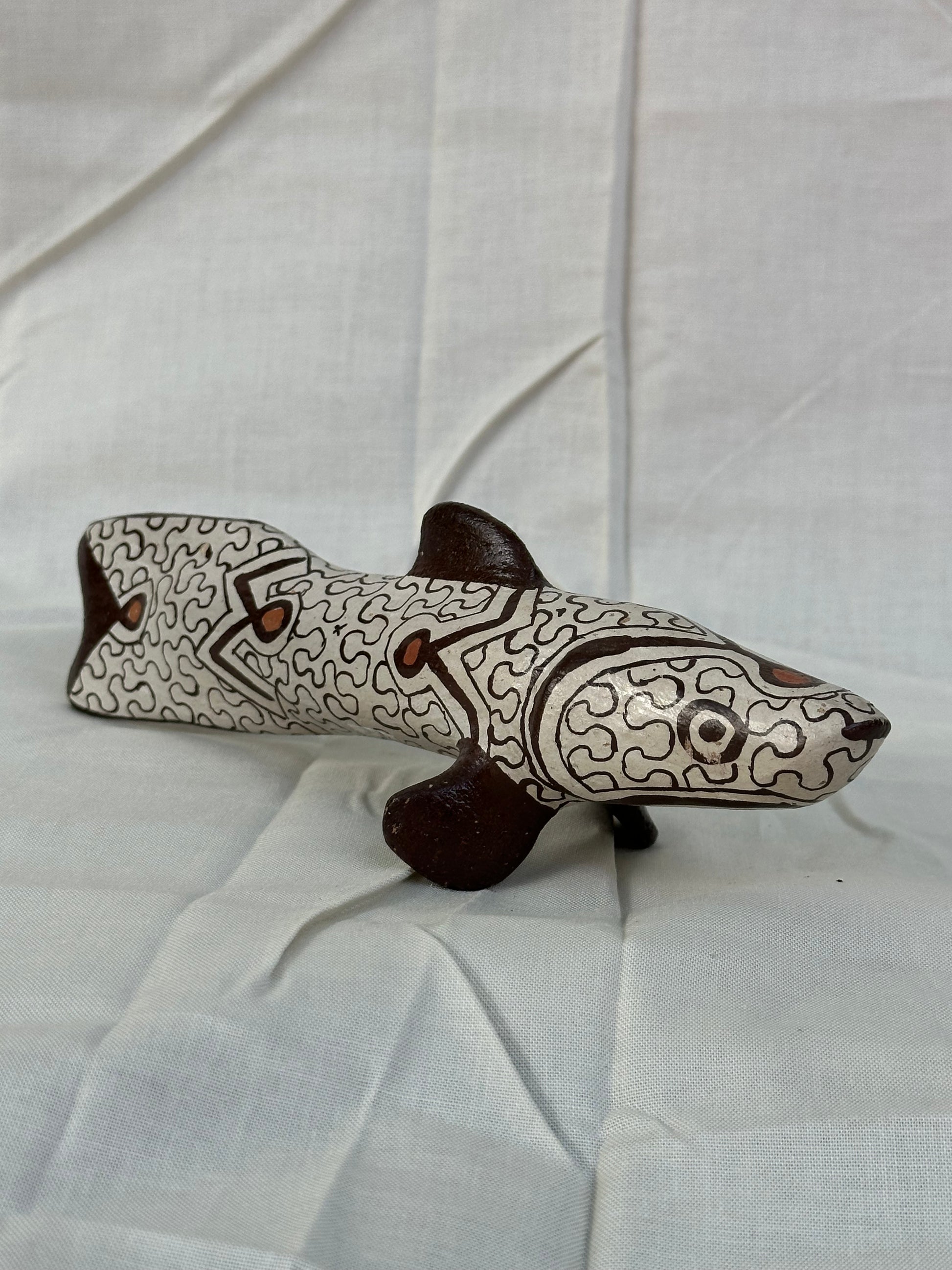 Handbuilt ceramic fish from the Peruvian Amazon. Lily Panduro is a master ceramic artist form the Shipibo-Konibo Indigenous community near Pucallpa, Peru. These pieces are each one of a kind and represent the different animal spirits that protect the rainforest. Lily collects the clay and pit fires the pieces and then paints them with the sacred patterns characteristic of her community. The designs represent the ayahuasca visions that are central to the cosmology and culture of this ancient civilization.