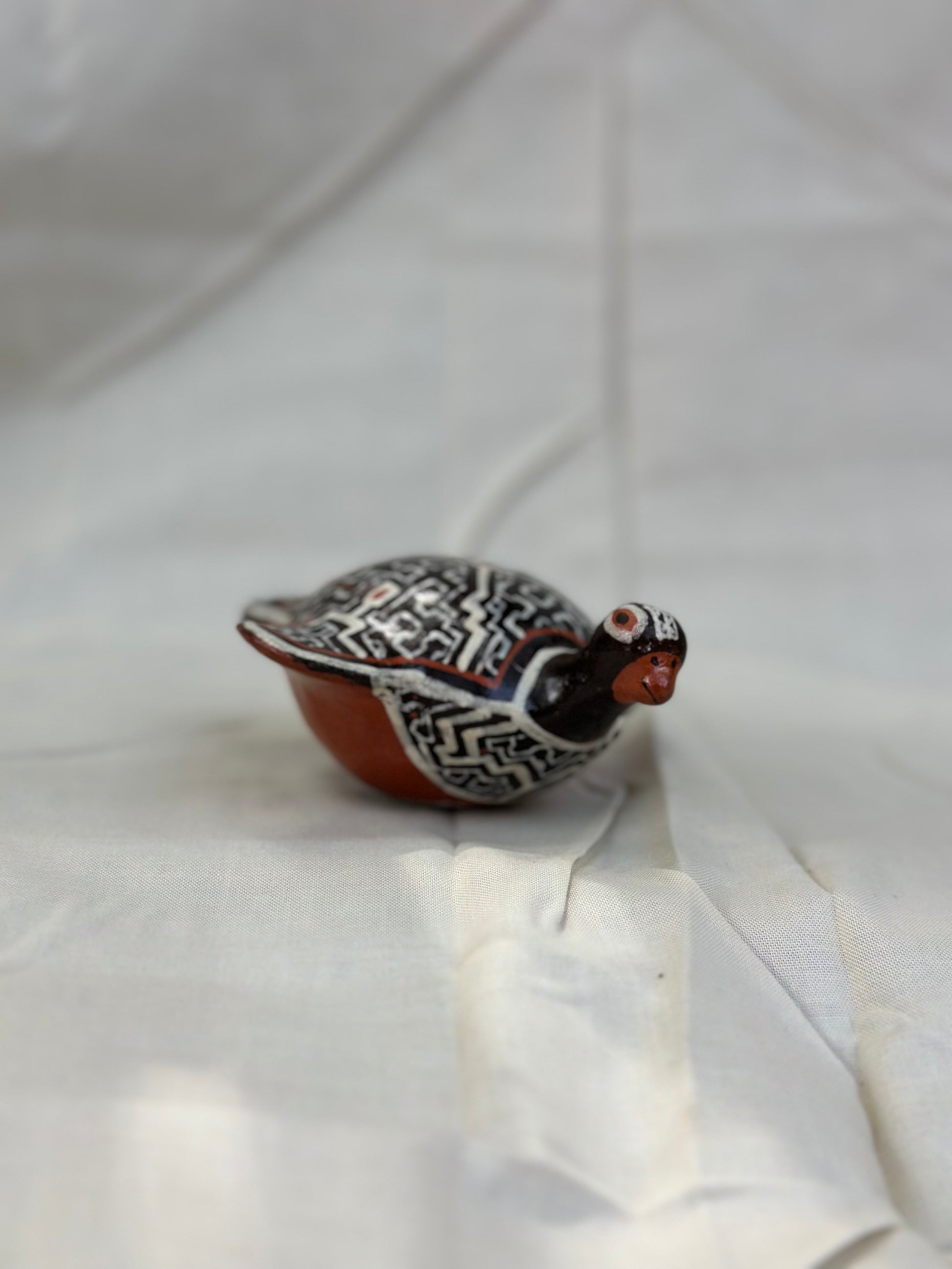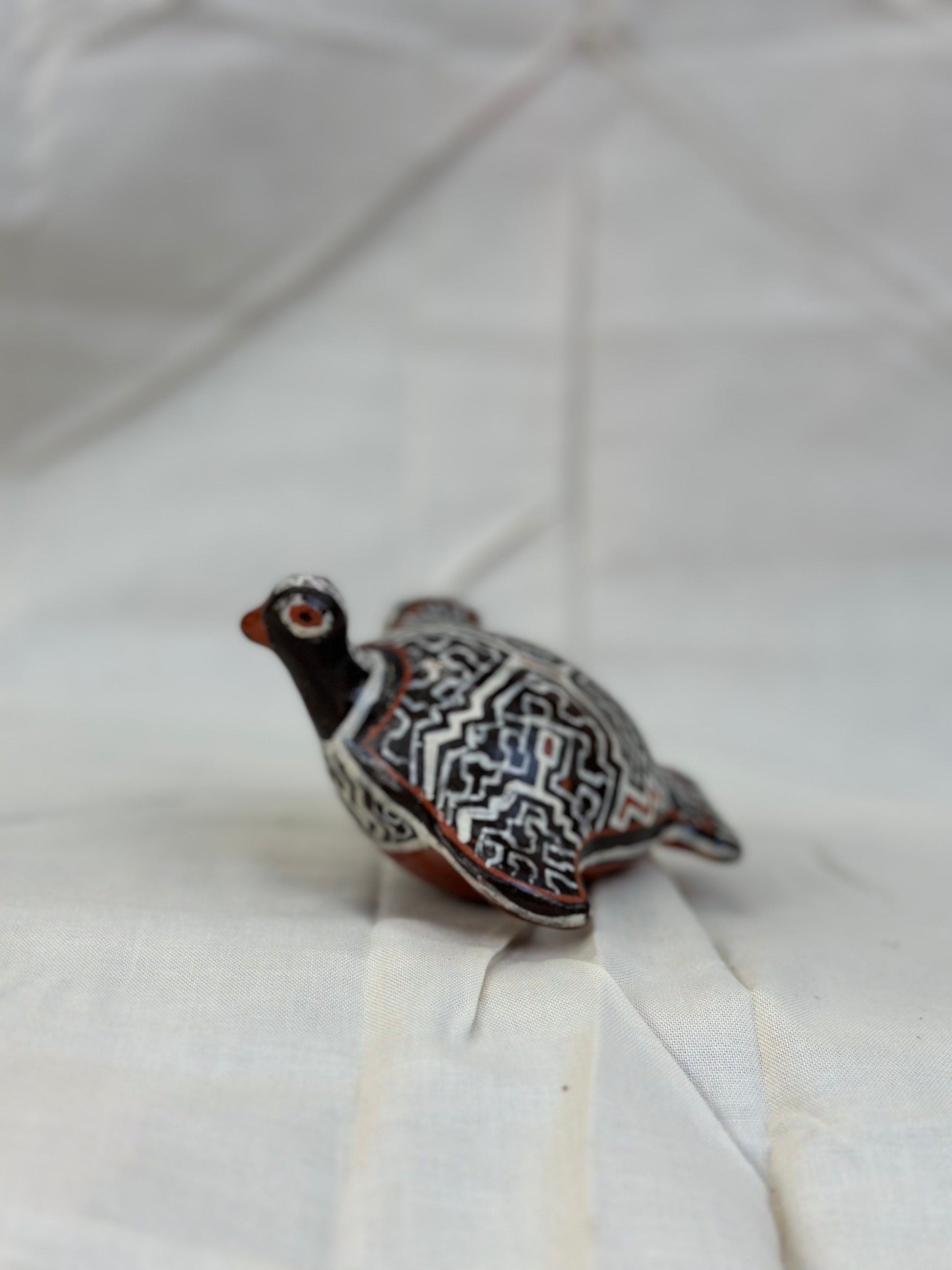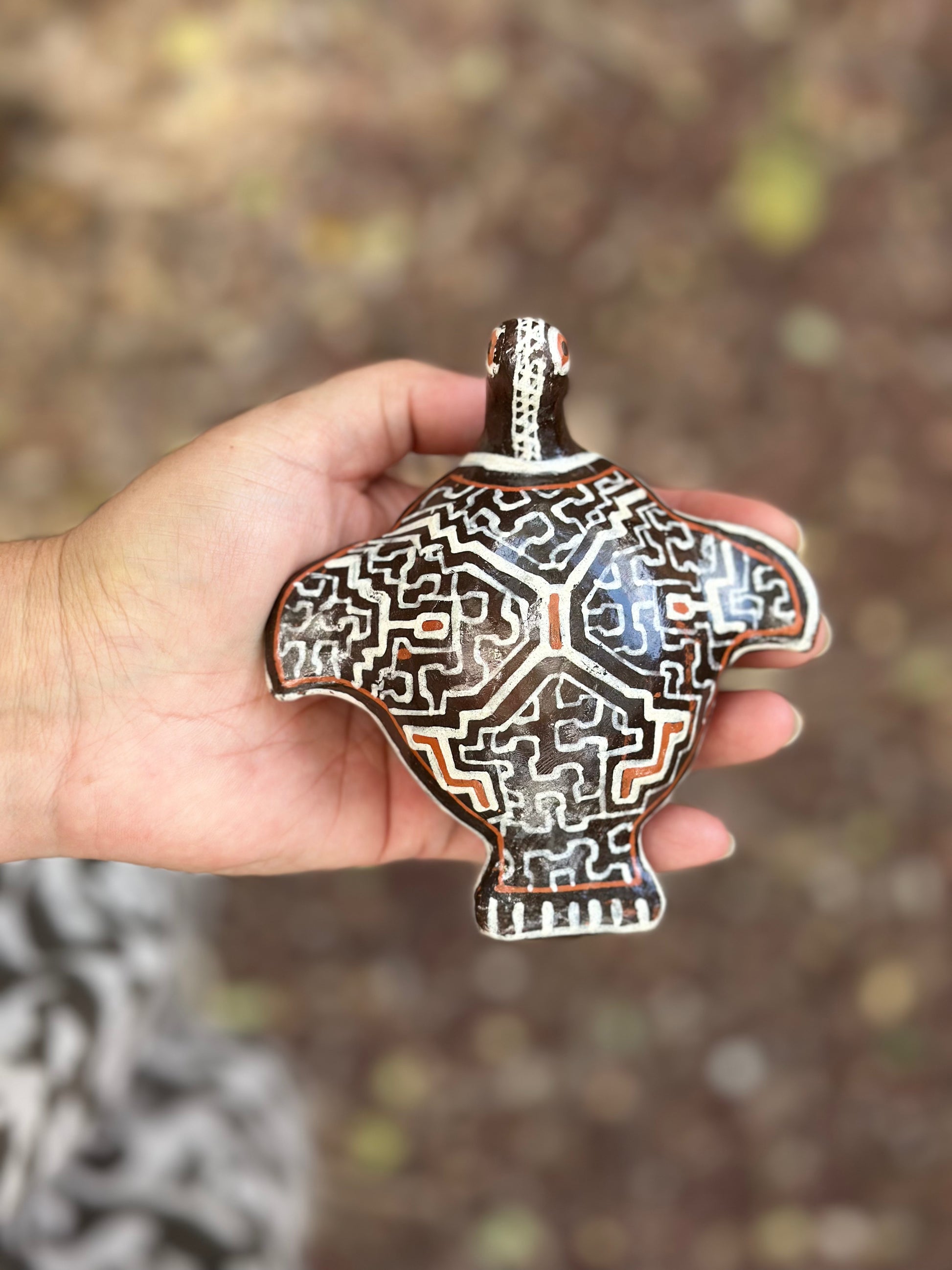 Handbuilt ceramic bird from the Peruvian Amazon. Lily Panduro is a master ceramic artist form the Shipibo-Konibo Indigenous community near Pucallpa, Peru. These pieces are each one of a kind and represent the different animal spirits that protect the rainforest. Lily collects the clay and pit fires the pieces and then paints them with the sacred patterns characteristic of her community. The designs represent the ayahuasca visions that are central to the cosmology and culture of this ancient civilization.