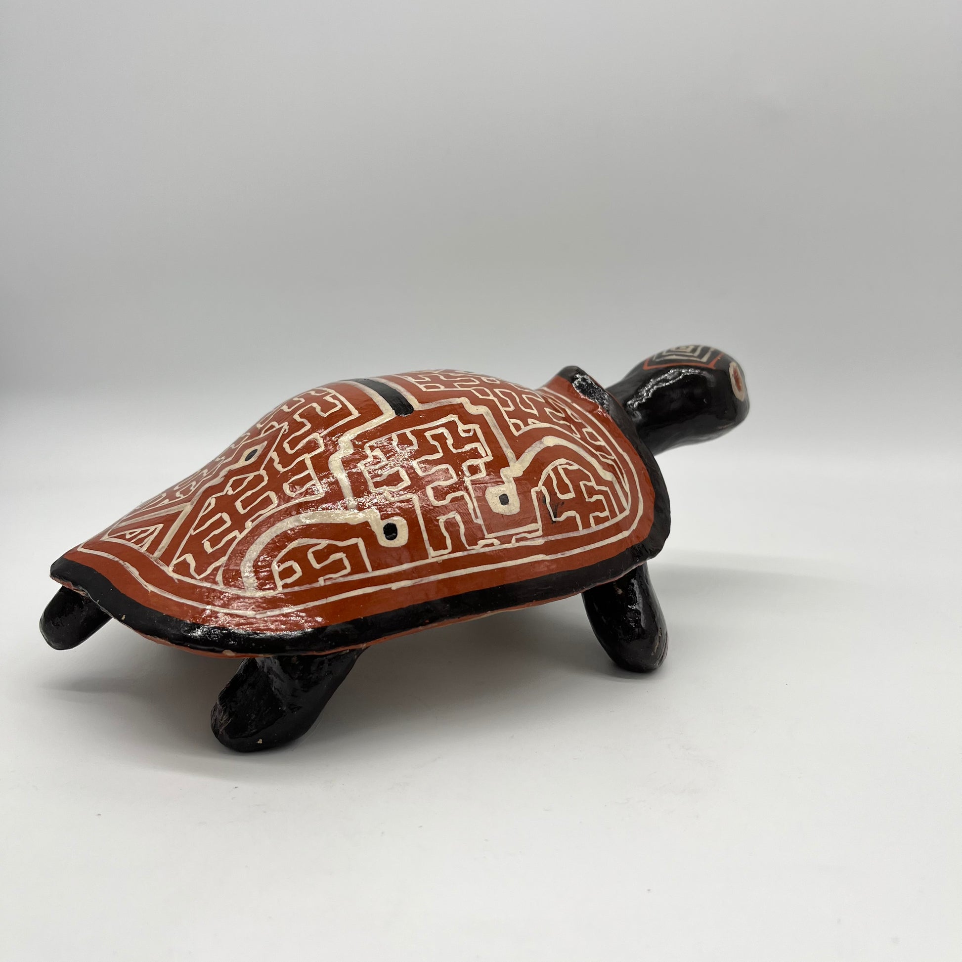 Handbuilt ceramic turtle from the Peruvian Amazon. Lily Panduro is a master ceramic artist form the Shipibo-Konibo Indigenous community near Pucallpa, Peru. These pieces are each one of a kind and represent the different animal spirits that protect the rainforest. Lily collects the clay and pit fires the pieces and then paints them with the sacred patterns characteristic of her community. The designs represent the ayahuasca visions that are central to the cosmology and culture of this ancient civilization.
