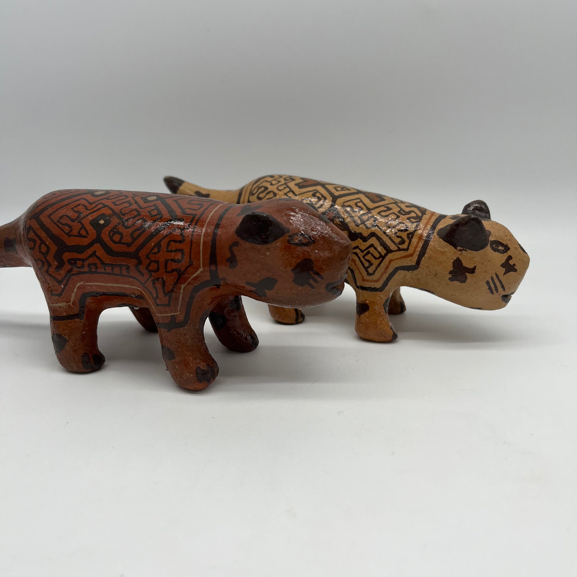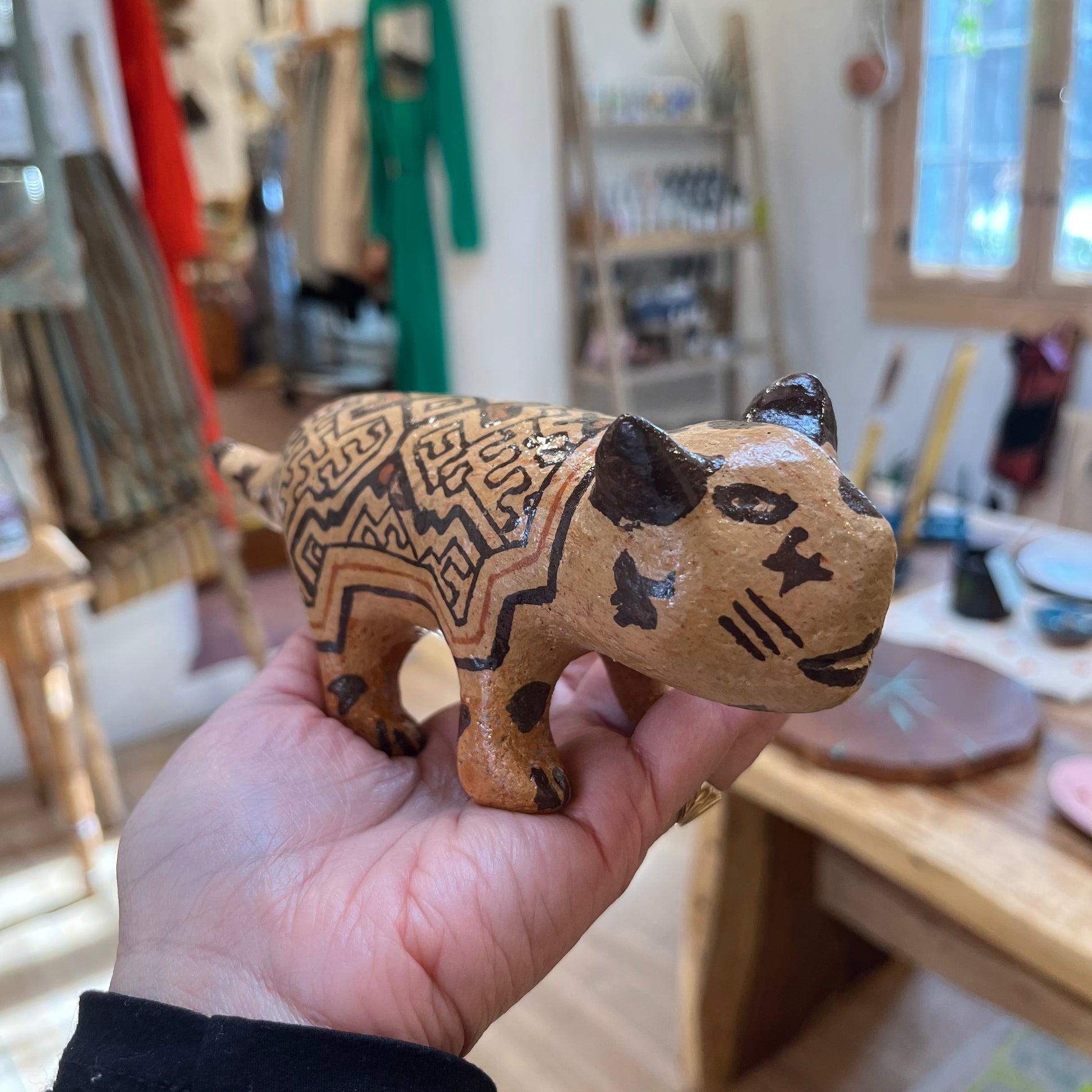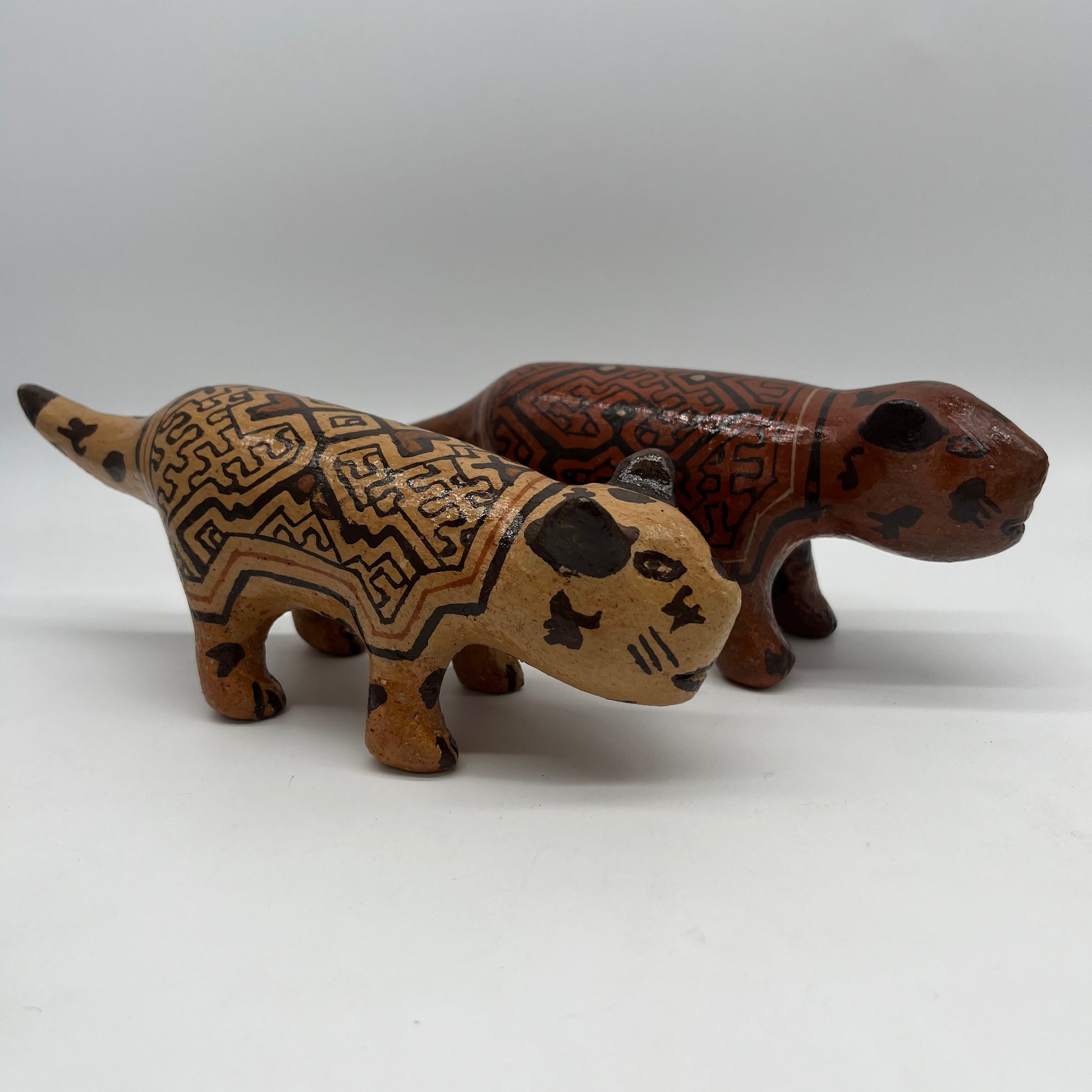 Handbuilt ceramic jaguar from the Peruvian Amazon. Sandra Panduro is a master ceramic artist form the Shipibo-Konibo Indigenous community near Pucallpa, Peru. These pieces are each one of a kind and represent the different animal spirits that protect the rainforest. Sandra collects the clay and pit fires the pieces and uses colored clay to paint them with the sacred patterns characteristic of her community. The handprinted designs represent the ayahuasca visions that are central to the cosmology and culture of this ancient civilization.