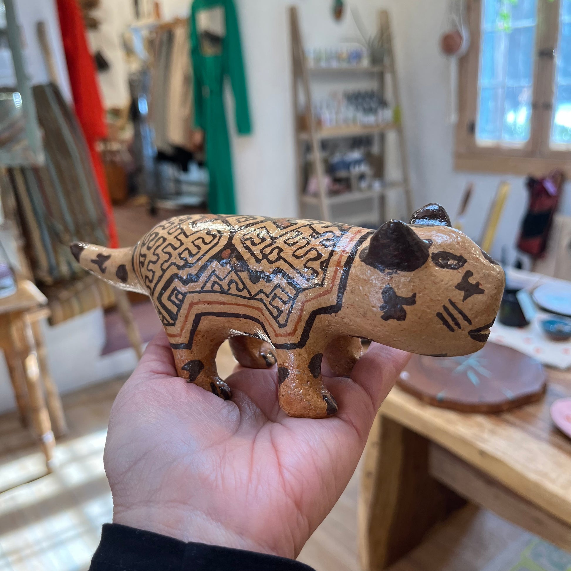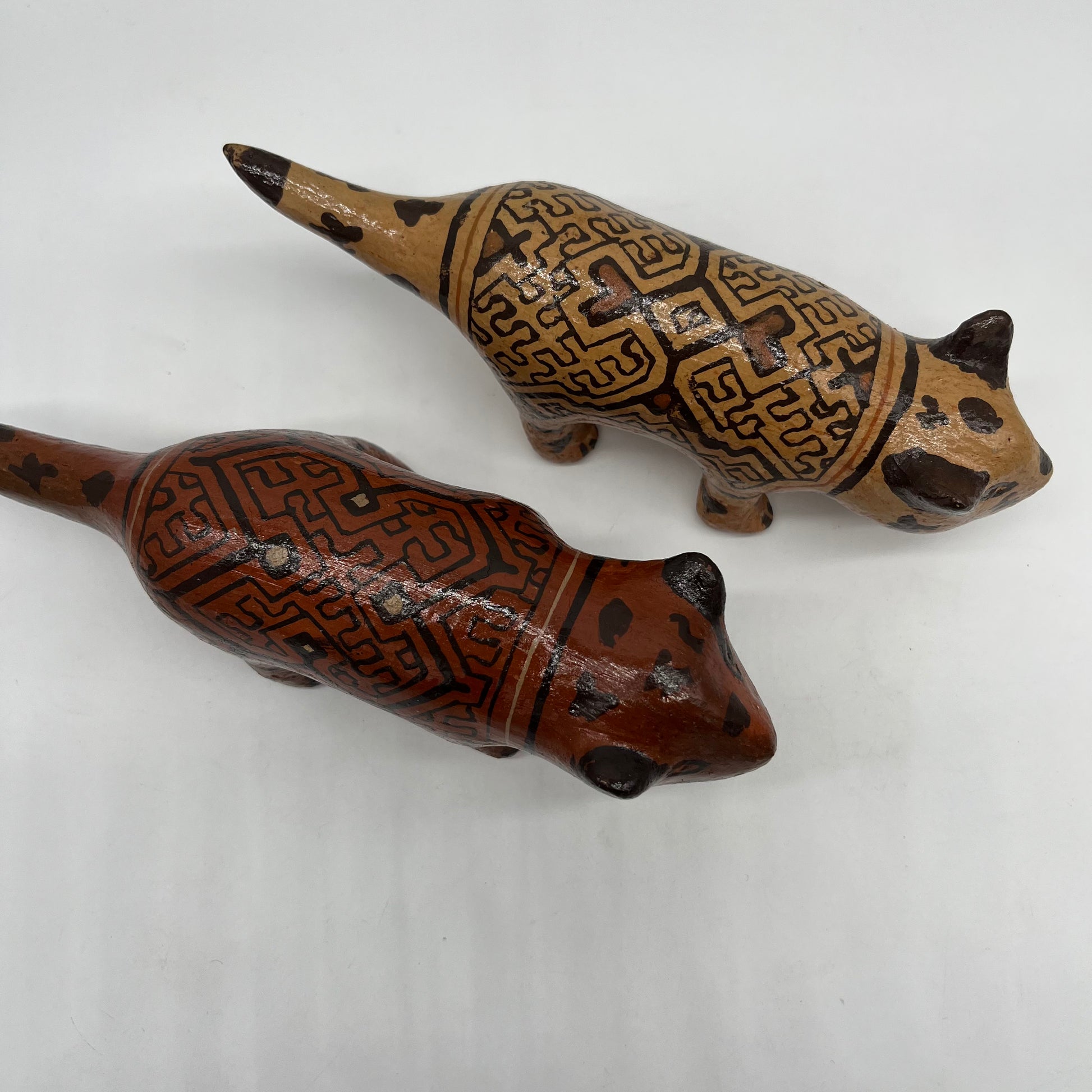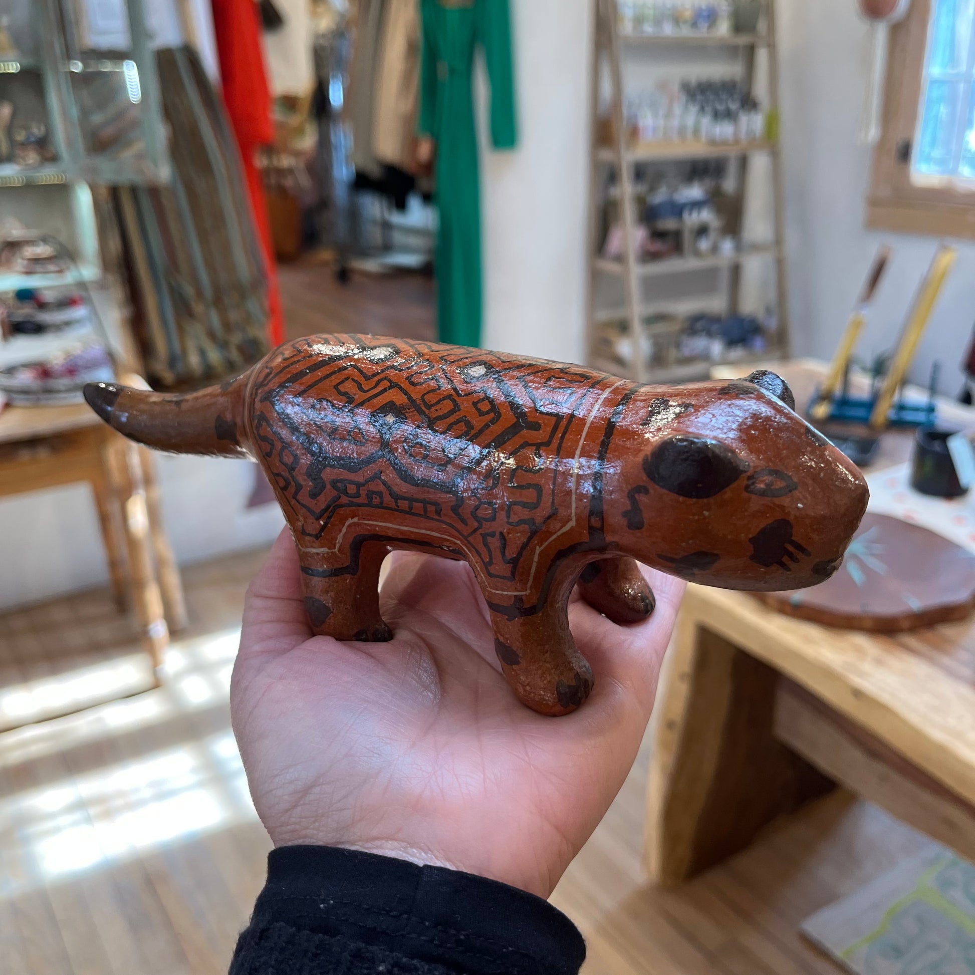 Handbuilt ceramic jaguar from the Peruvian Amazon. Sandra Panduro is a master ceramic artist form the Shipibo-Konibo Indigenous community near Pucallpa, Peru. These pieces are each one of a kind and represent the different animal spirits that protect the rainforest. Sandra collects the clay and pit fires the pieces and uses colored clay to paint them with the sacred patterns characteristic of her community. The handprinted designs represent the ayahuasca visions that are central to the cosmology and culture of this ancient civilization.