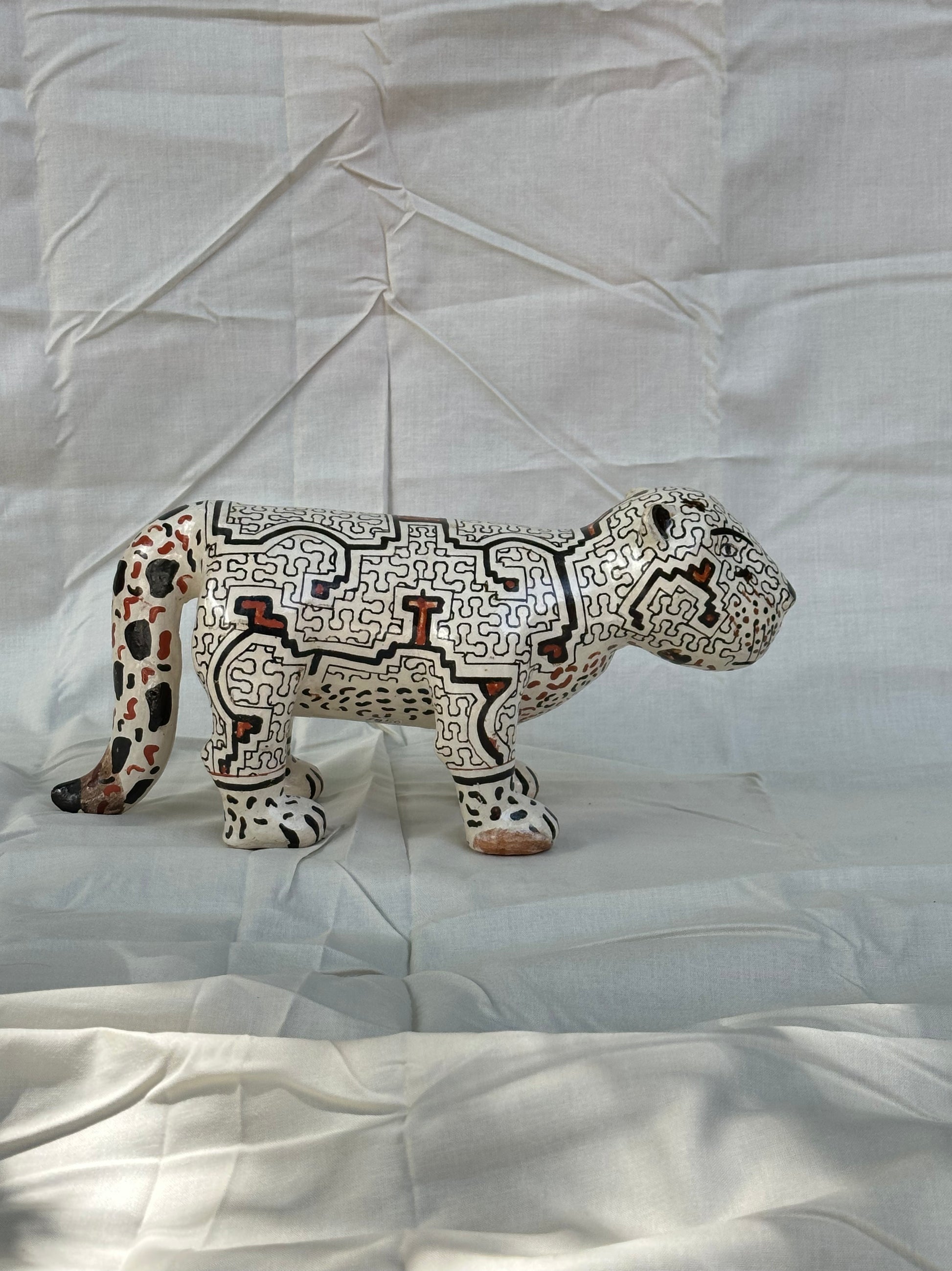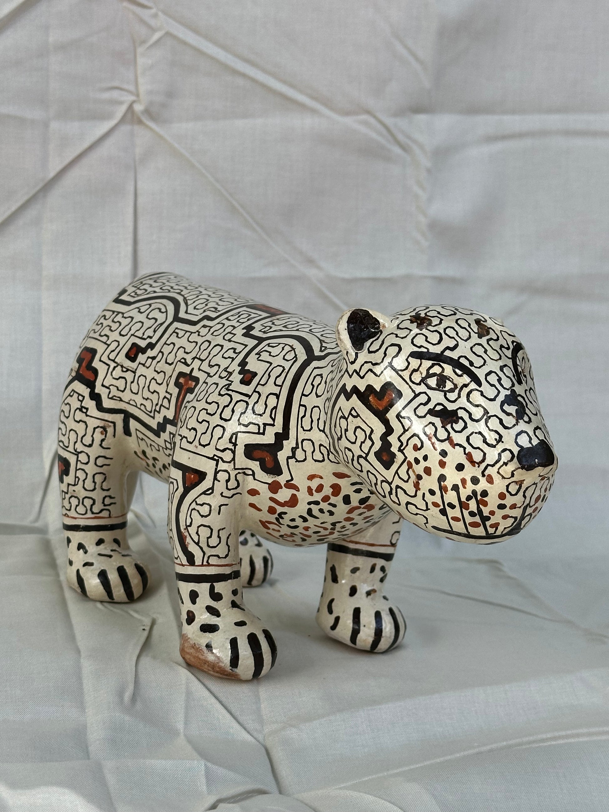 Handbuilt ceramic Jaguar from the Peruvian Amazon. Lily Panduro is a master ceramic artist form the Shipibo-Konibo Indigenous community near Pucallpa, Peru. These pieces are each one of a kind and represent the different animal spirits that protect the rainforest. Lily collects the clay and pit fires the pieces and then paints them with the sacred patterns characteristic of her community. The designs represent the ayahuasca visions that are central to the cosmology and culture of this ancient civilization.