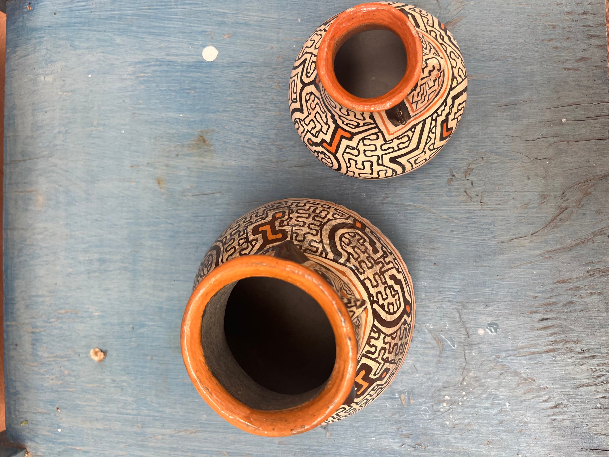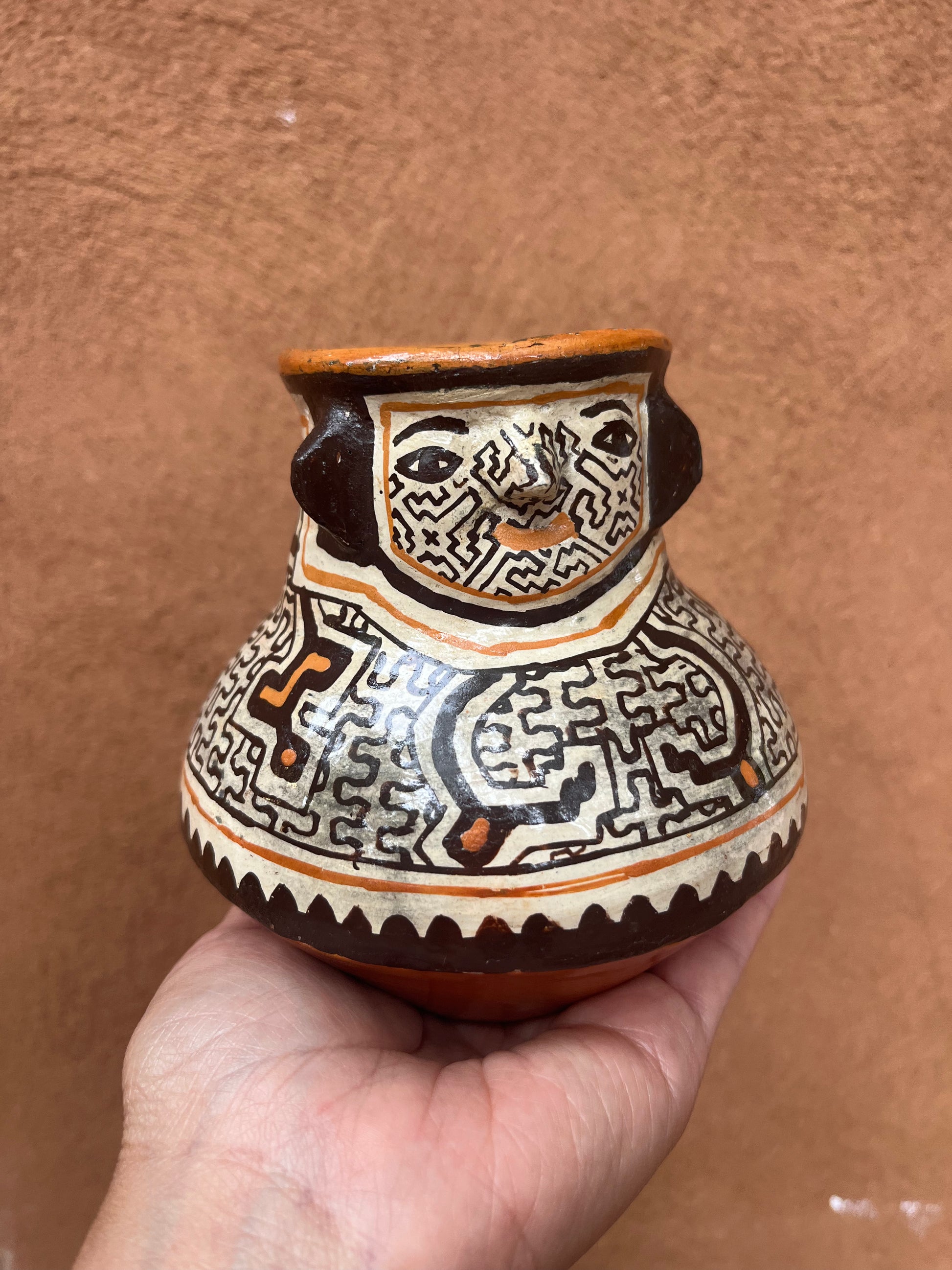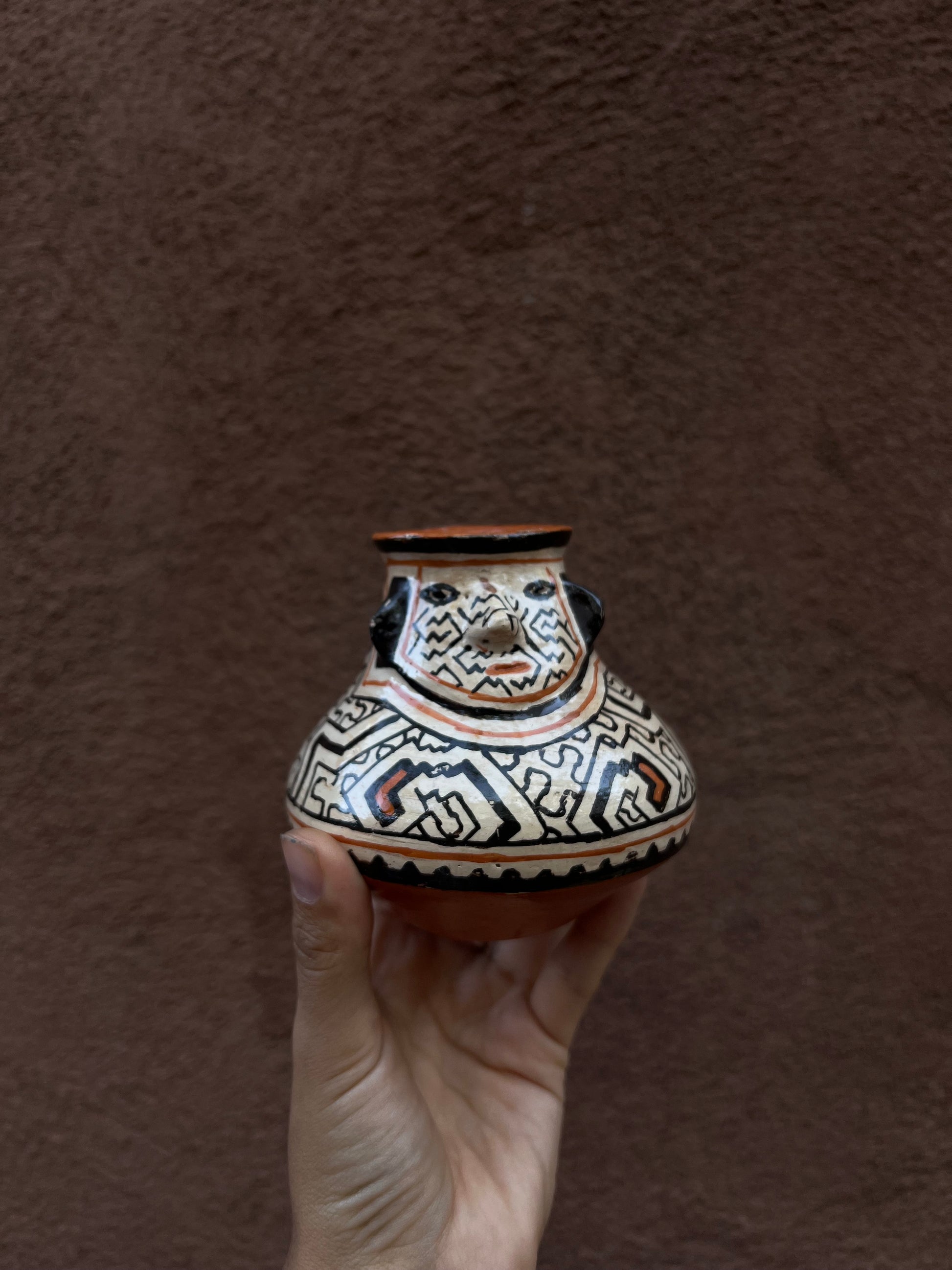 Handbuilt ceramic Vase from the Peruvian Amazon. Sandra Panduro is a master ceramic artist form the Shipibo-Konibo Indigenous community near Pucallpa, Peru. These pieces are each one of a kind and represent the different animal spirits that protect the rainforest. Sandra collects the clay and pit fires the pieces and uses colored clay to paint them with the sacred patterns characteristic of her community. The handprinted designs represent the ayahuasca visions that are central to the cosmology and culture of this ancient civilization.