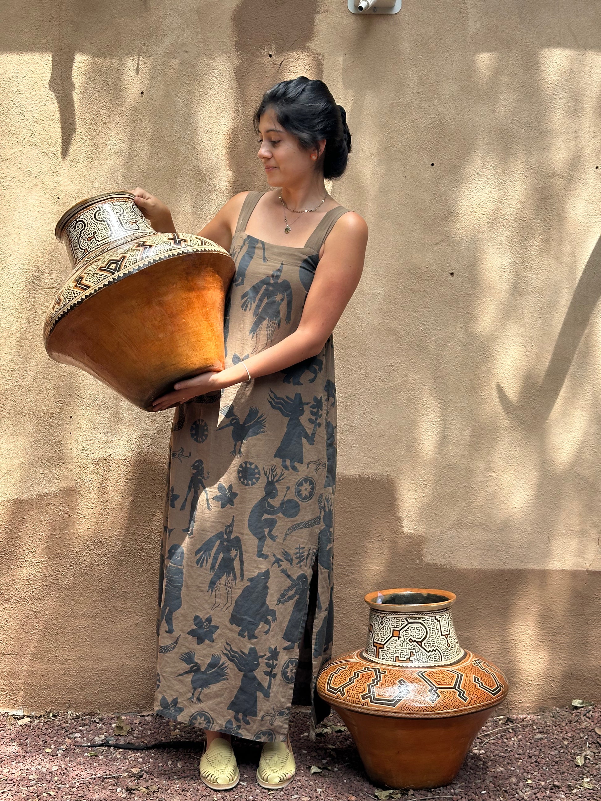 Handbuilt ceramic Vase from the Peruvian Amazon. Sandra Panduro is a master ceramic artist form the Shipibo-Konibo Indigenous community near Pucallpa, Peru. These pieces are each one of a kind and represent the different animal spirits that protect the rainforest. Sandra collects the clay and pit fires the pieces and uses colored clay to paint them with the sacred patterns characteristic of her community. The handprinted designs represent the ayahuasca visions that are central to the cosmology and culture of this ancient civilization.