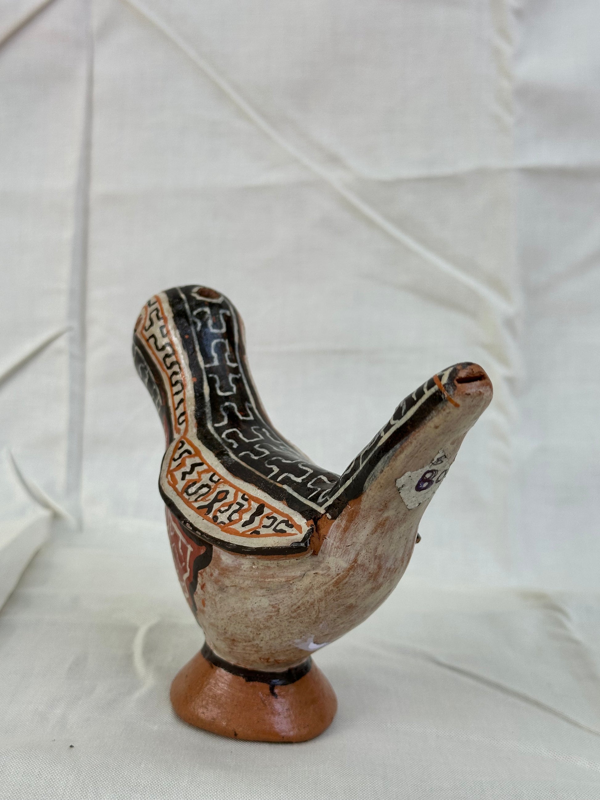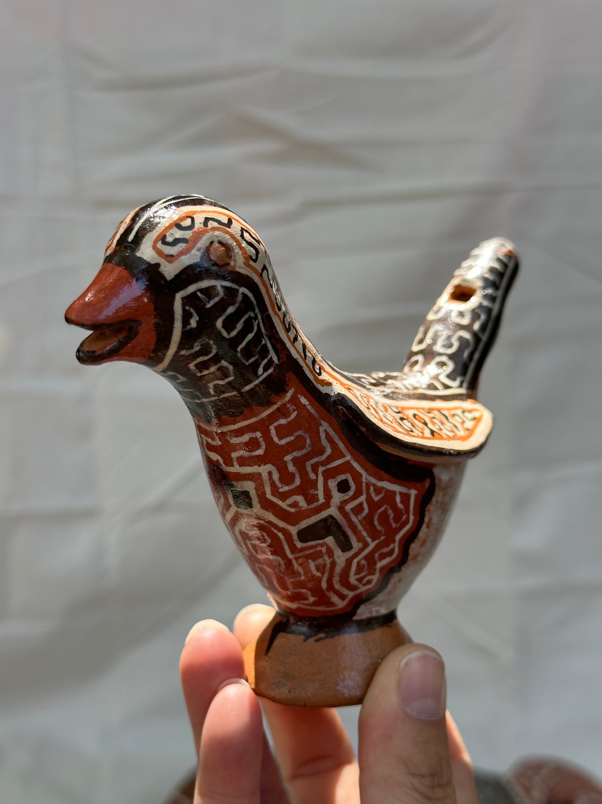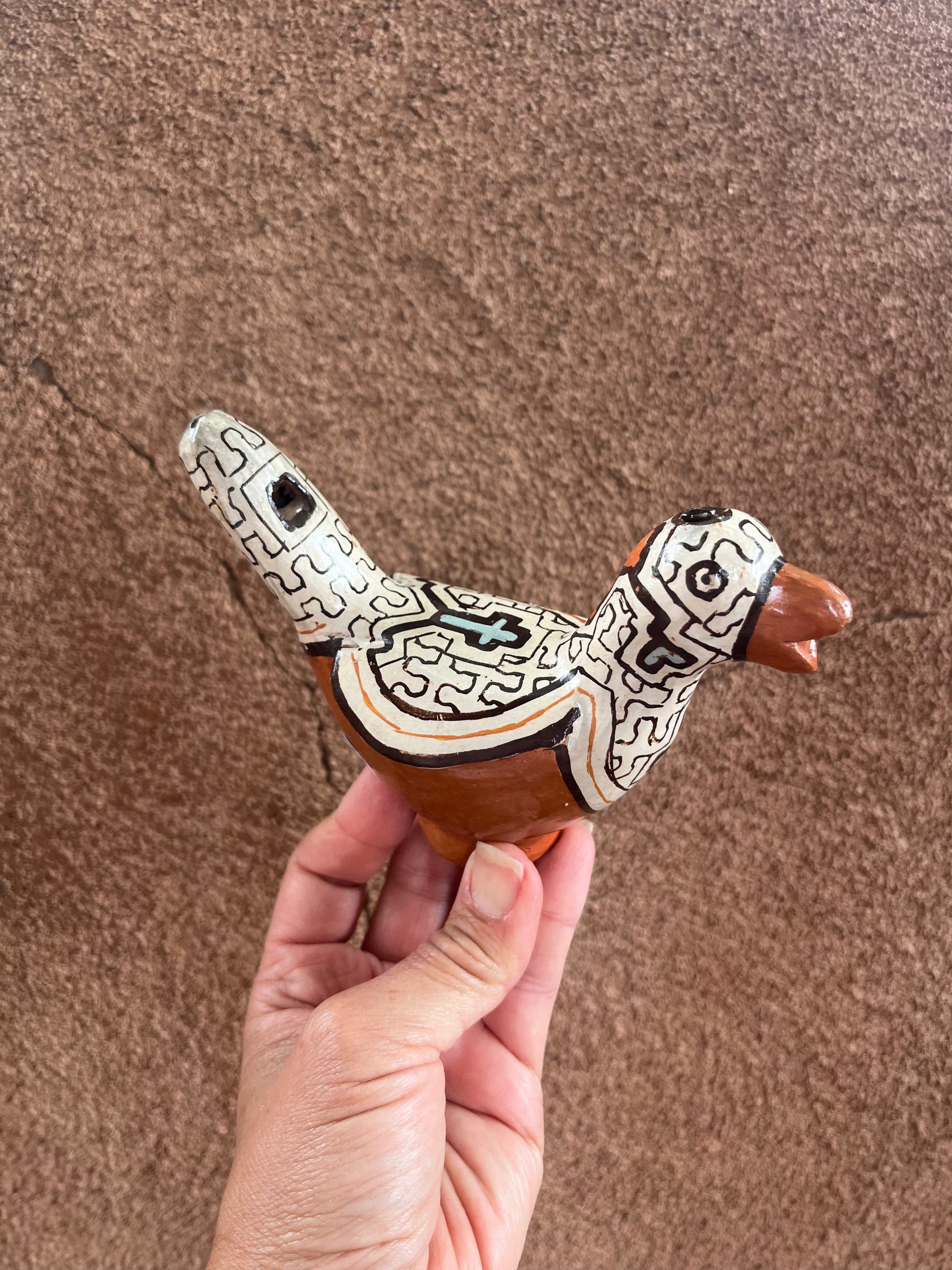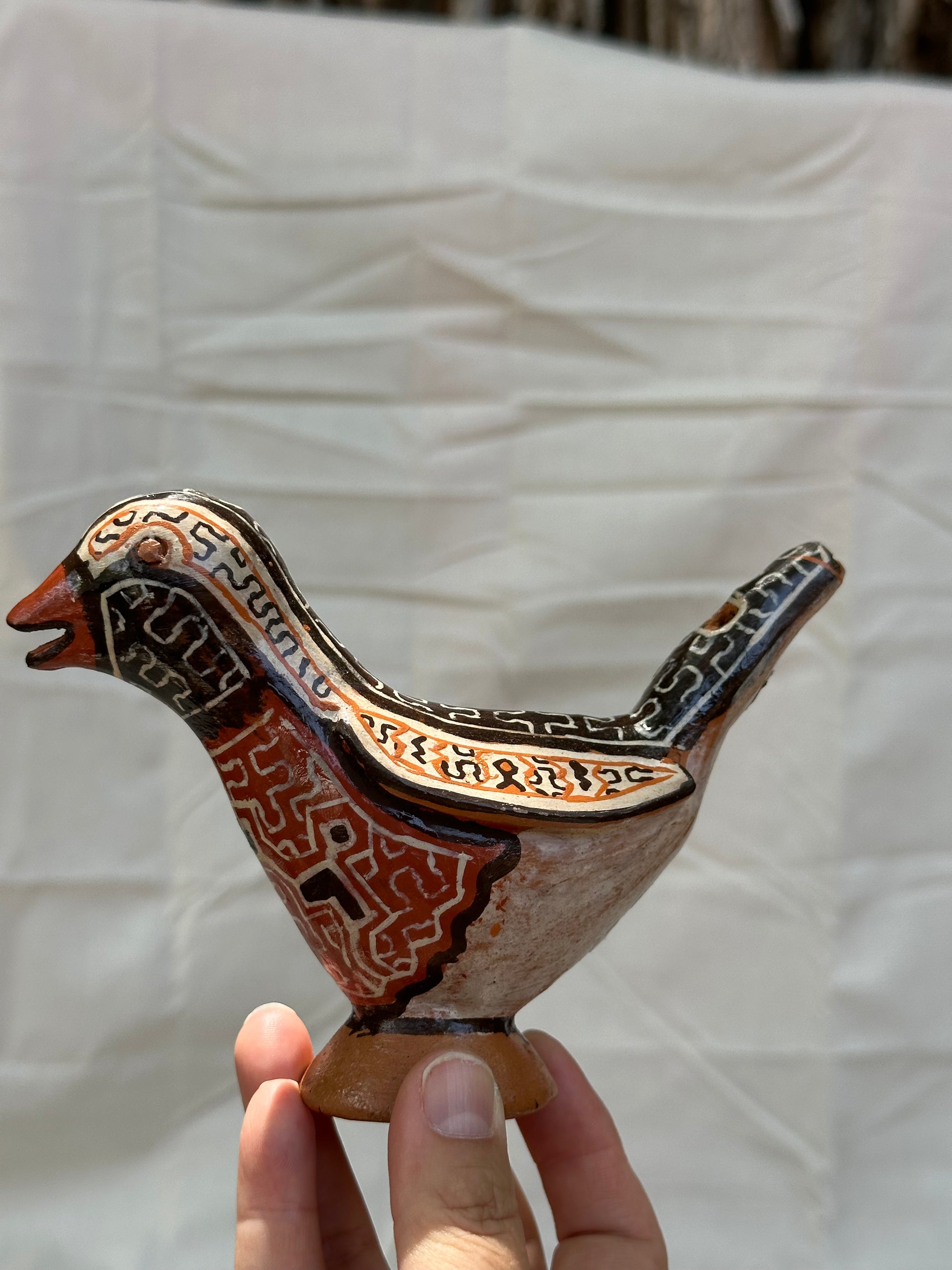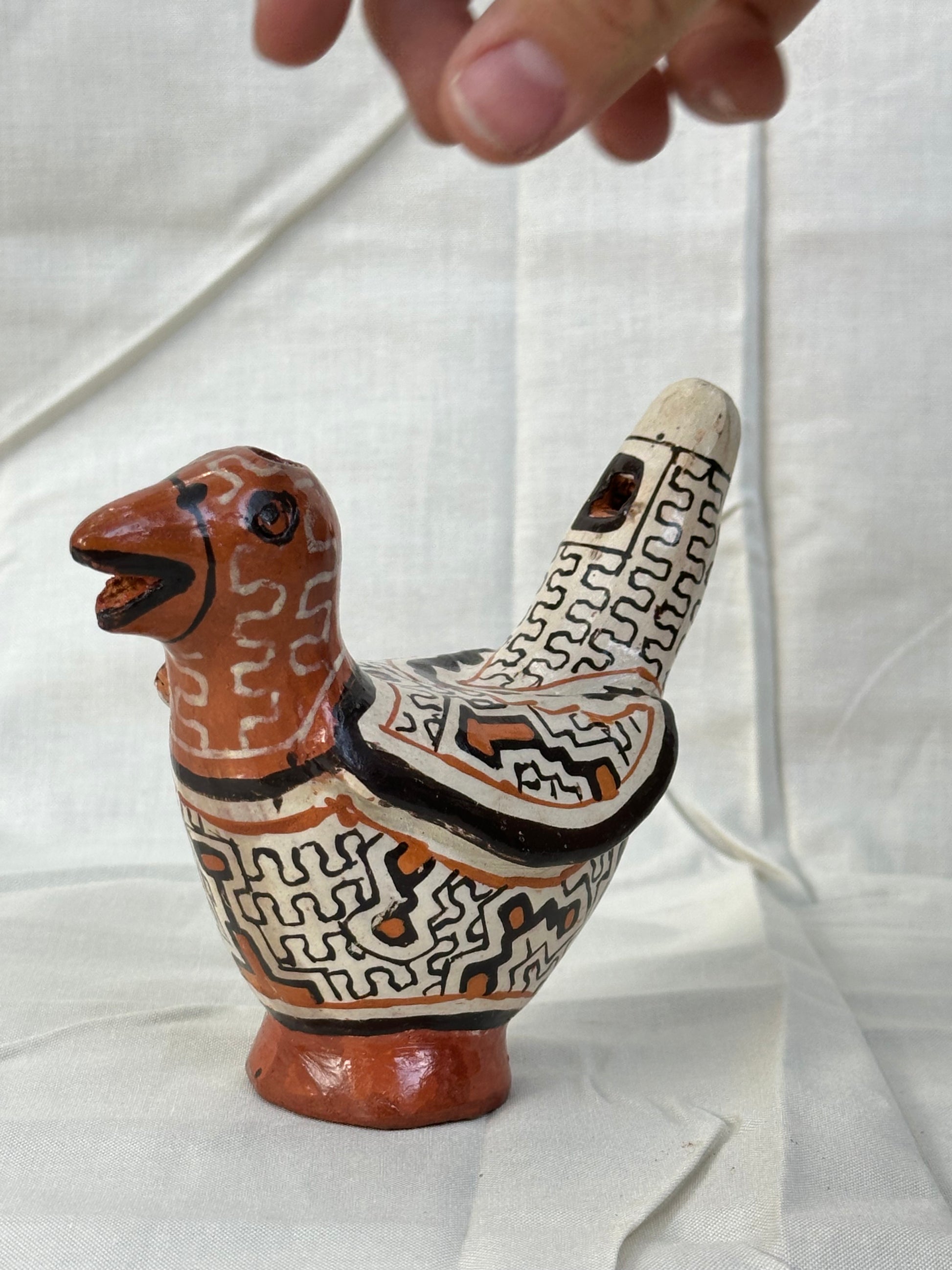 Handbuilt ceramic bird whistle from the Peruvian Amazon. Sandra Panduro is a master ceramic artist form the Shipibo-Konibo Indigenous community near Pucallpa, Peru. These pieces are each one of a kind and represent the different animal spirits that protect the rainforest. Sandra collects the clay and pit fires the pieces and uses colored clay to paint them with the sacred patterns characteristic of her community. The handprinted designs represent the ayahuasca visions that are central to the cosmology and culture of this ancient civilization.
