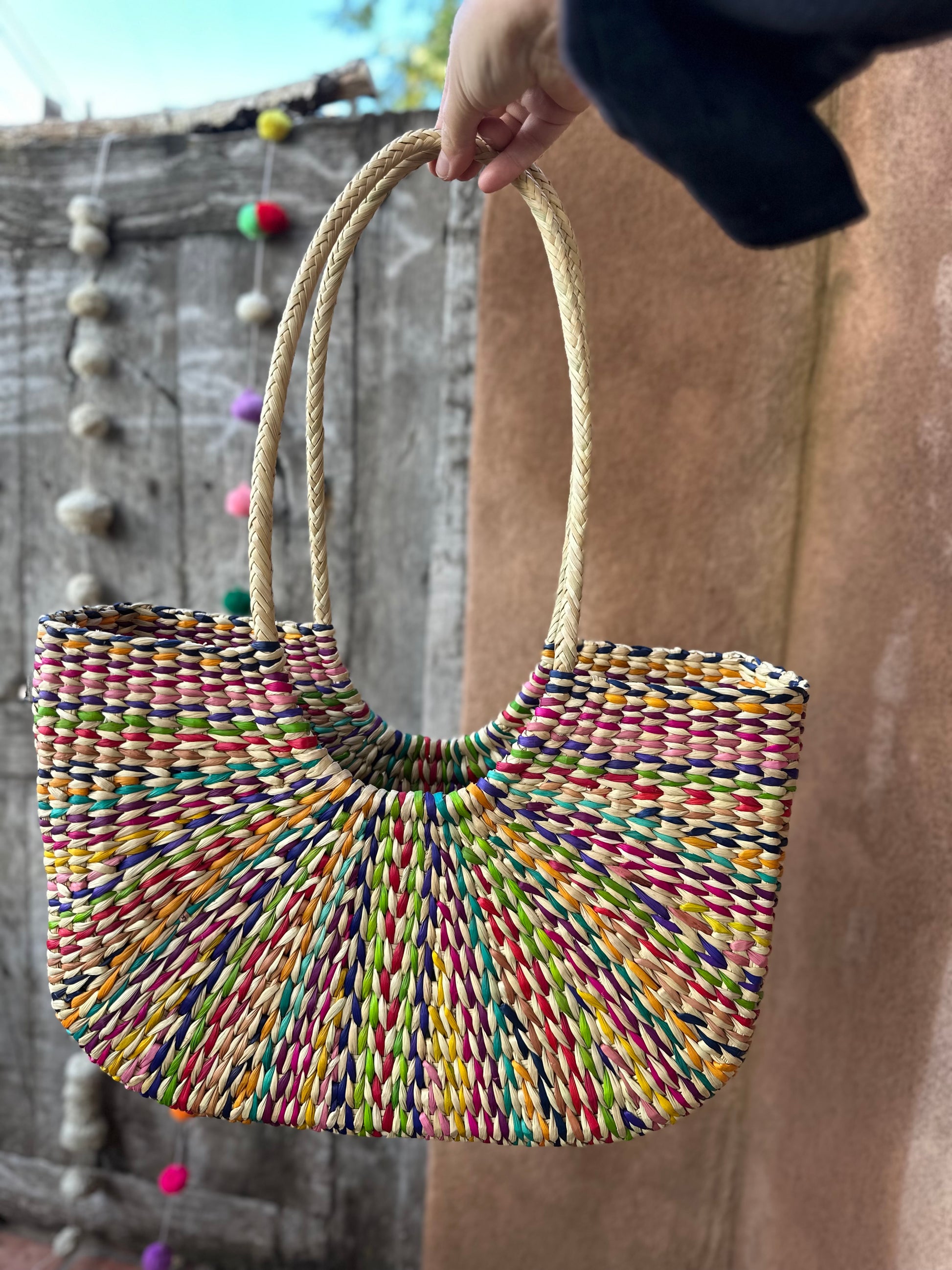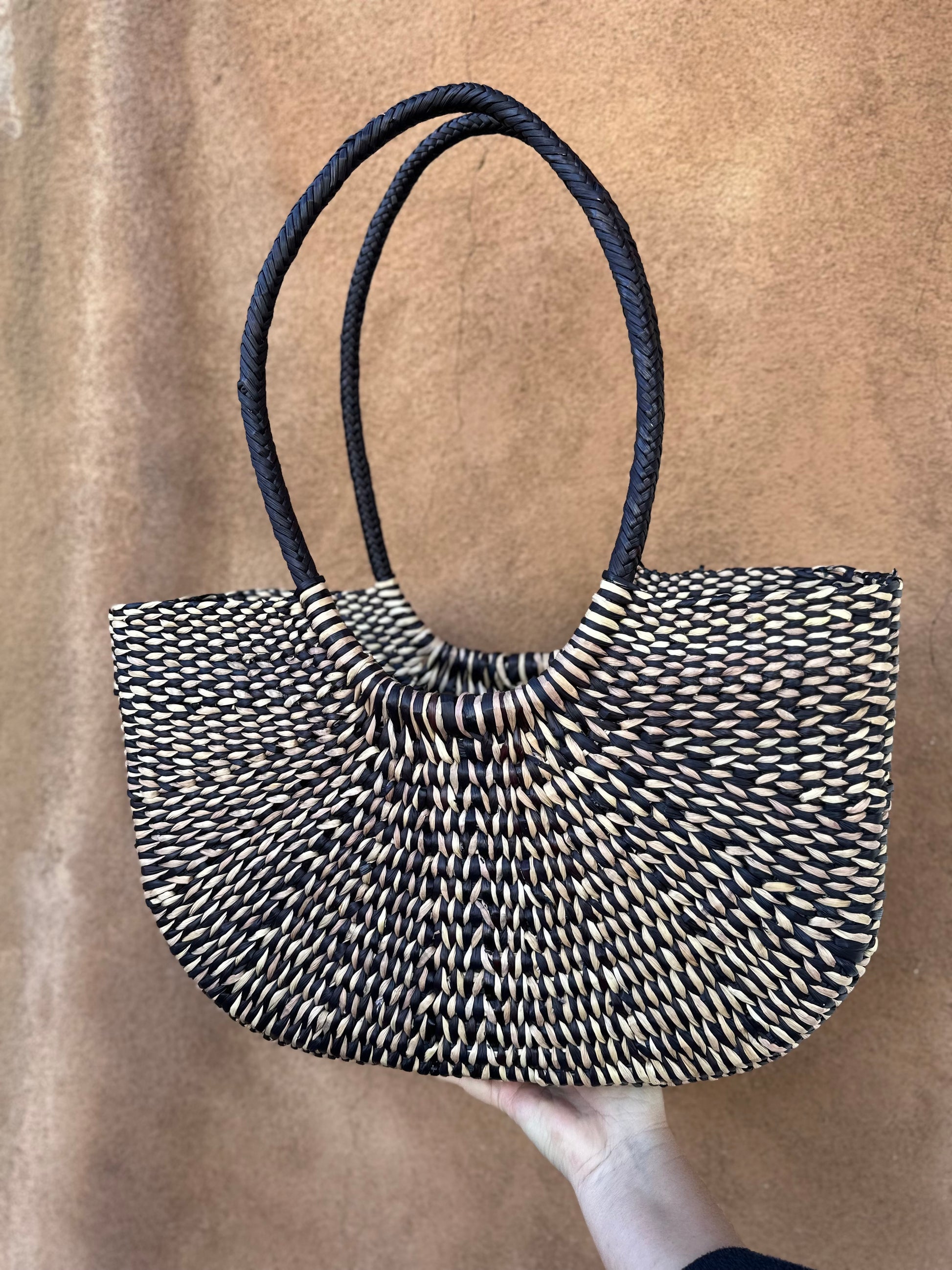 Handwoven basket in "junco" a reed that is harvested in the coastal wetlands of Peru. This sustainably produced basket serves as a shoulder basket or large tote.