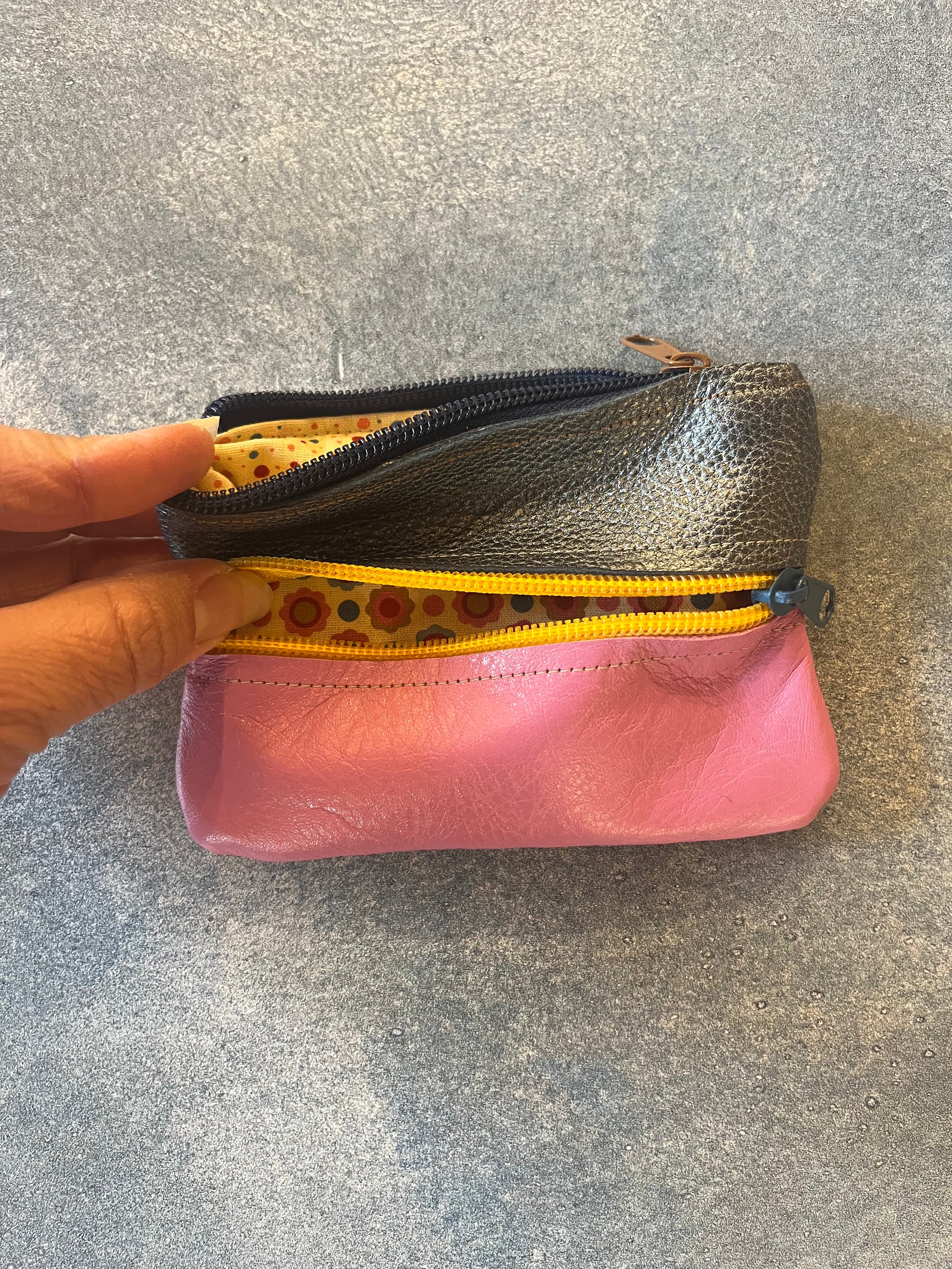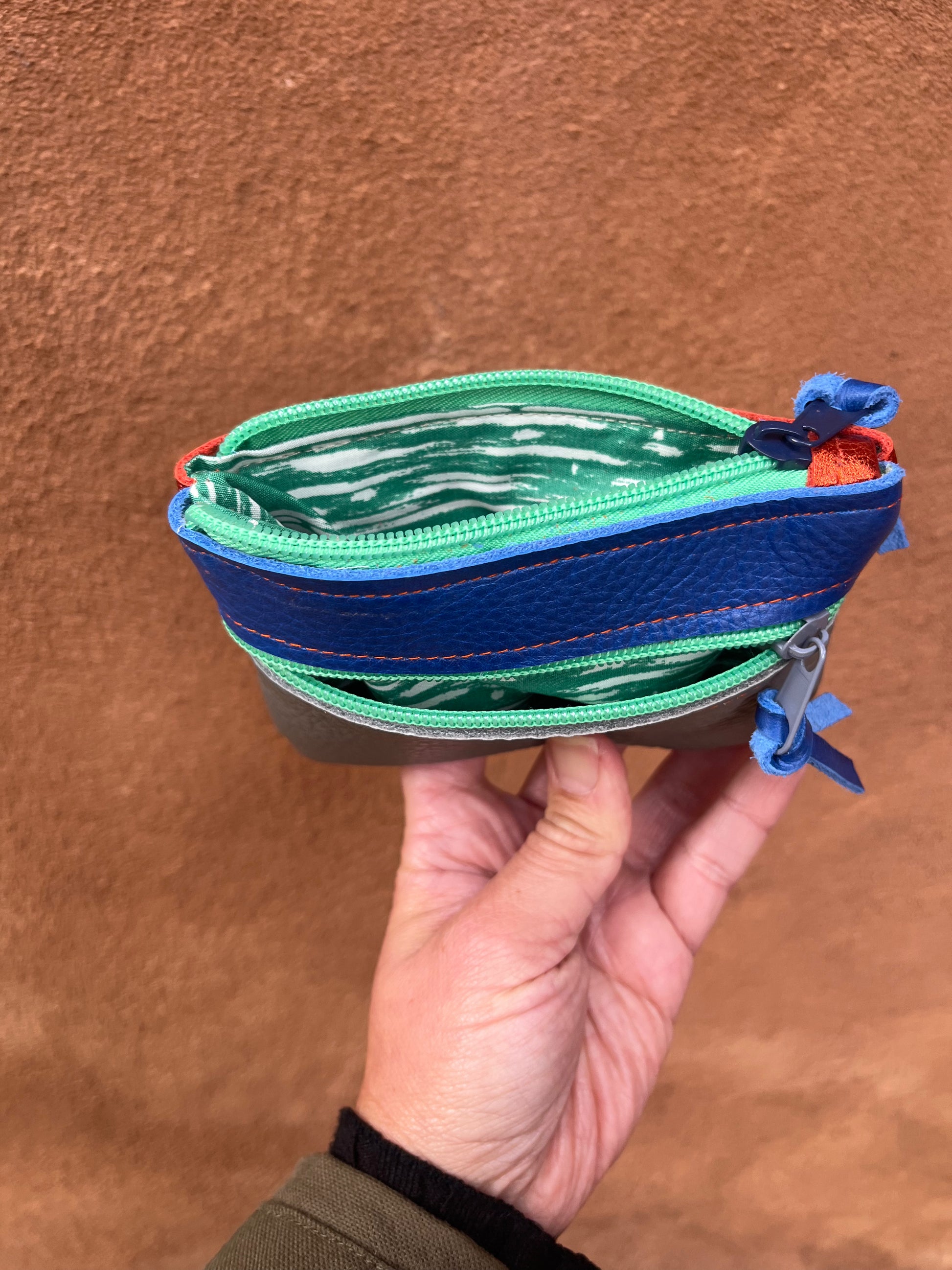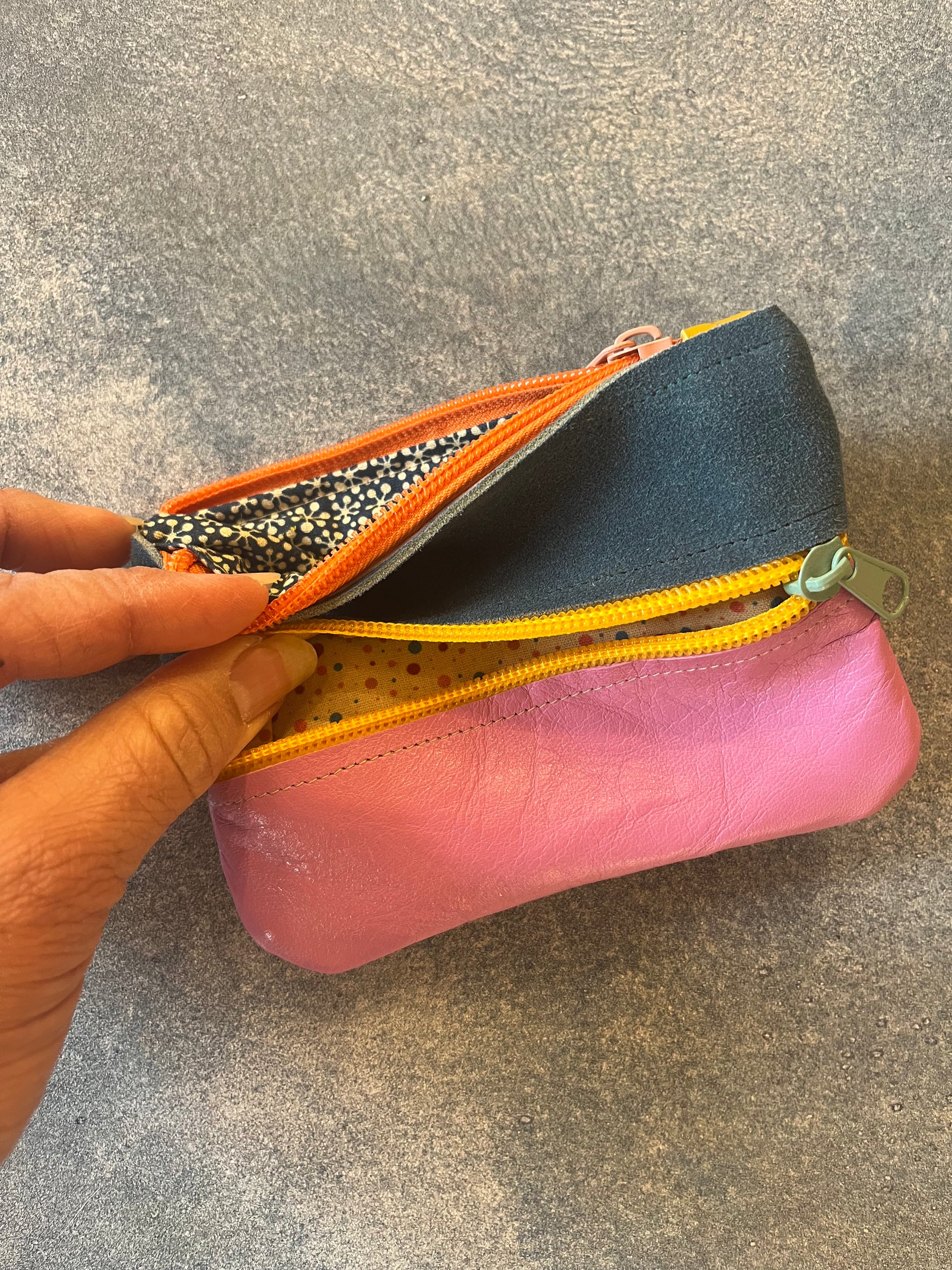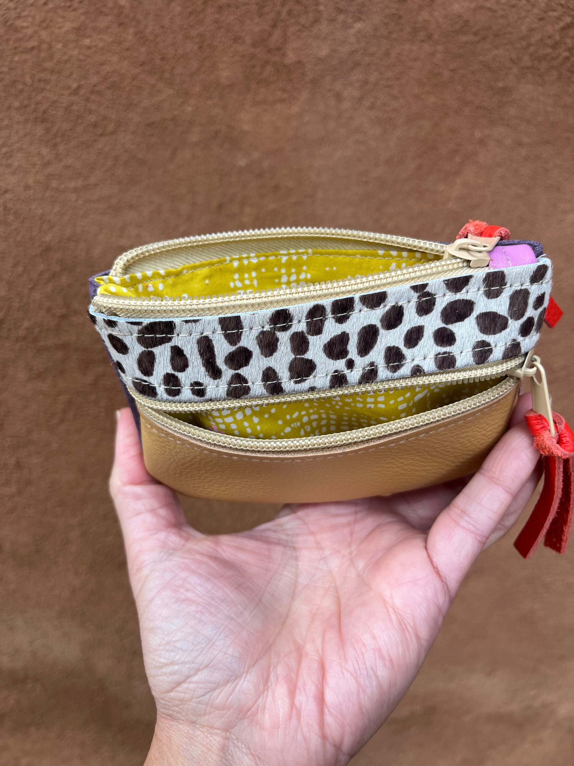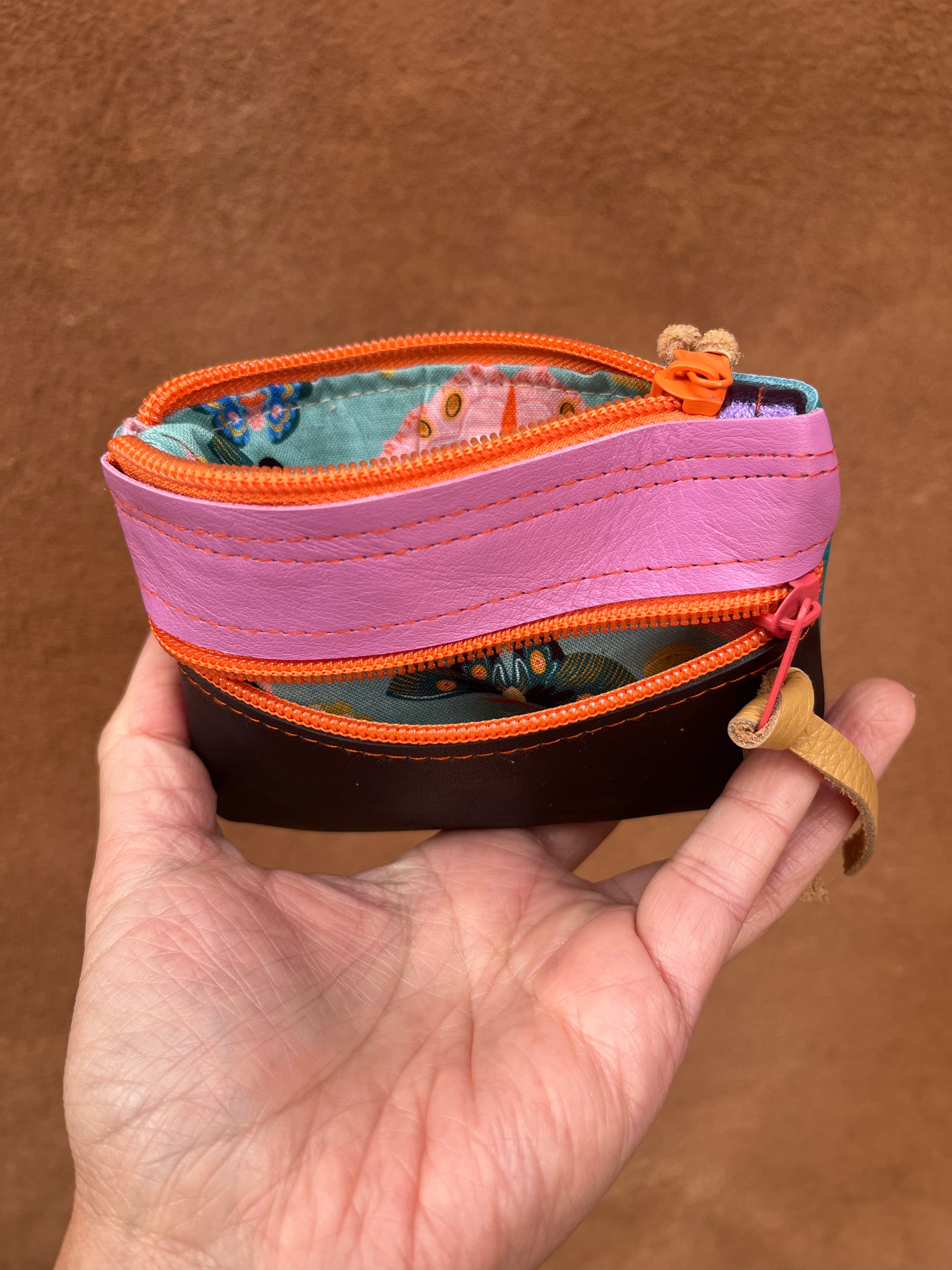 Small leather wallets designed and handmade by Rachel Hosmer of Ami Bags in her studio in Albuquerque, New Mexico.