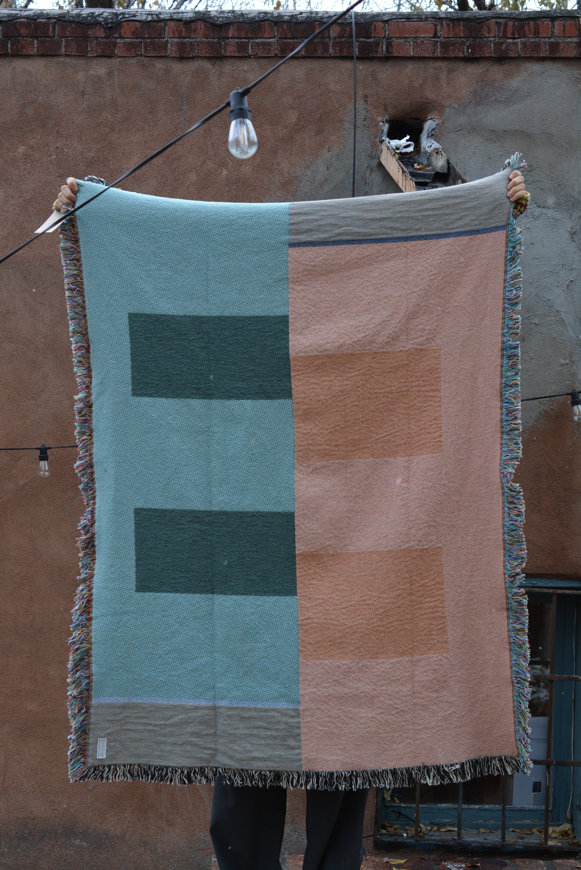 100% cotton woven blanket with tasseled ends.