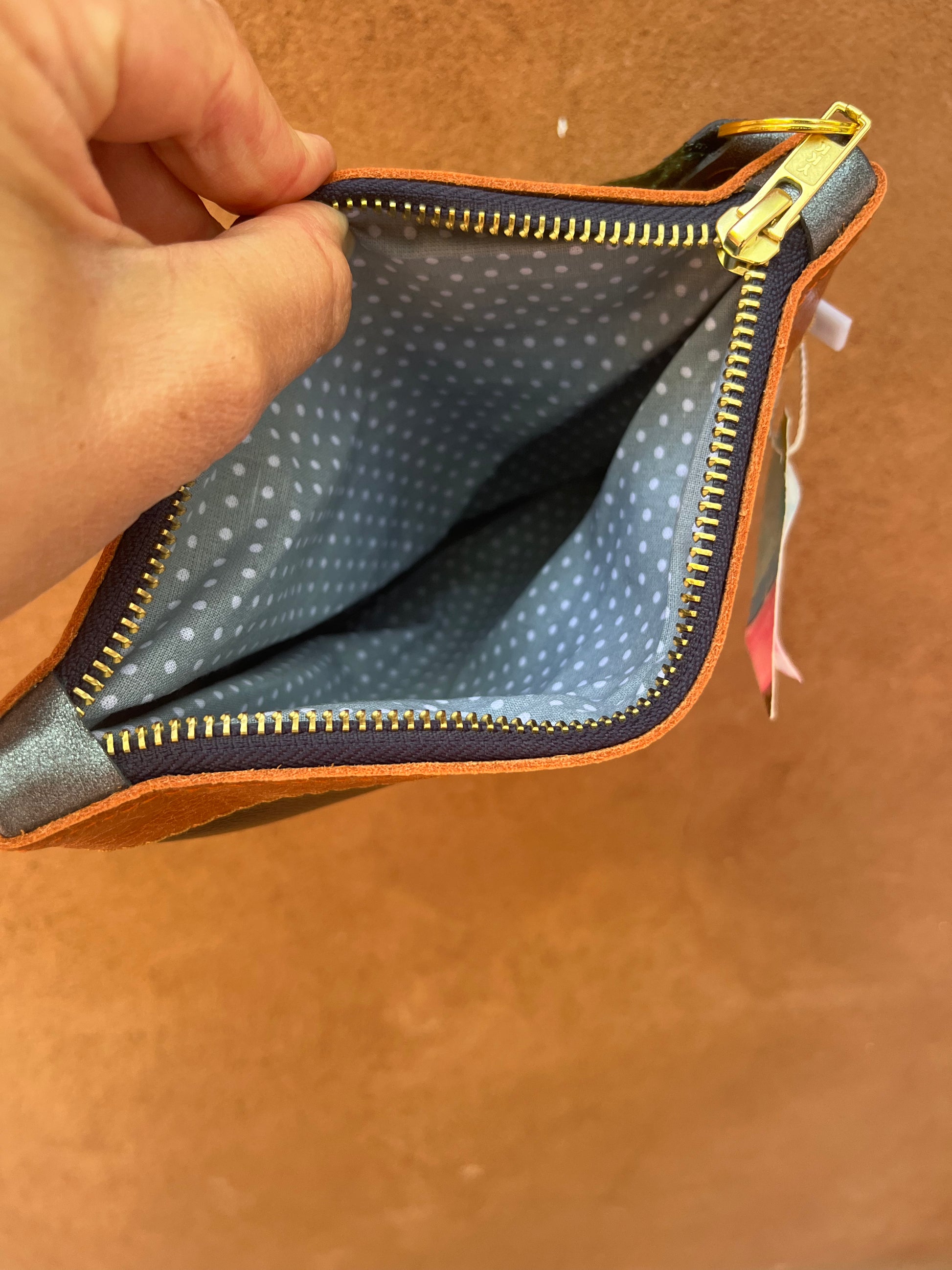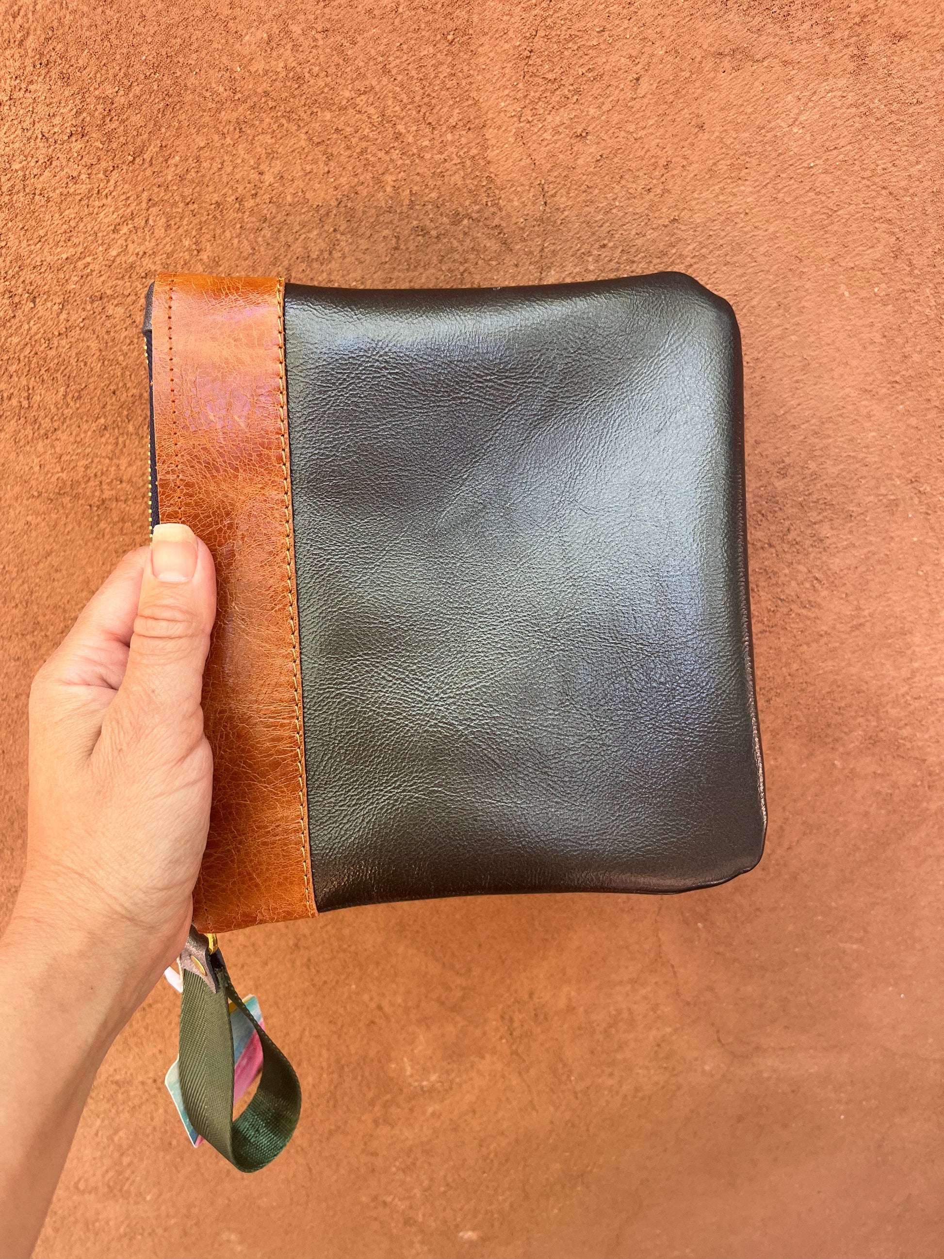 This leather wristlet is designed and handmade by Rachel Reyes of Ami Style in her studio in Albuquerque, New Mexico.