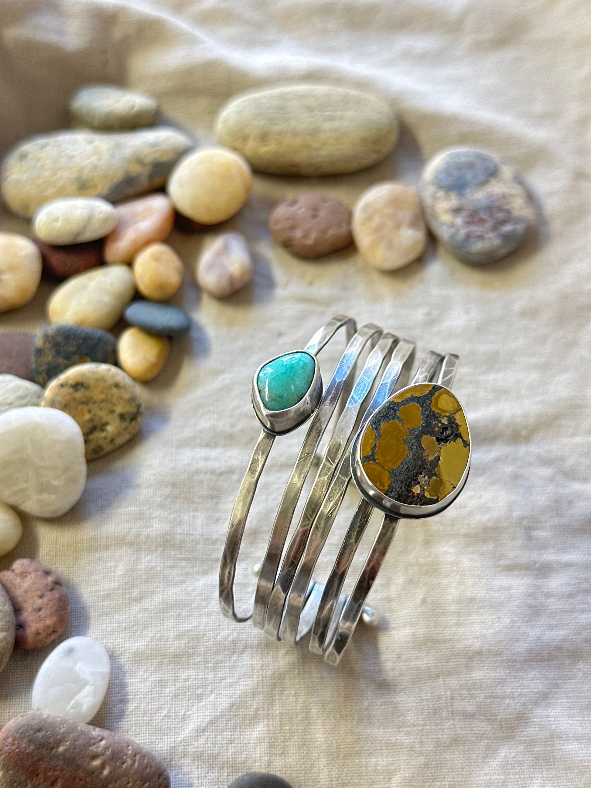 This sturdy sterling silver bracelet holds two pieces of Royston and Hubei Turquoise on a sturdy statement cuff constructed by 6 hammered texture wires. Balled ends wires keep all hand formed wire cuff connected and in place. I finished this cuff with a dark patina to accentuate the hammered texture. This cuff can be slightly formed to fit a many sizes.