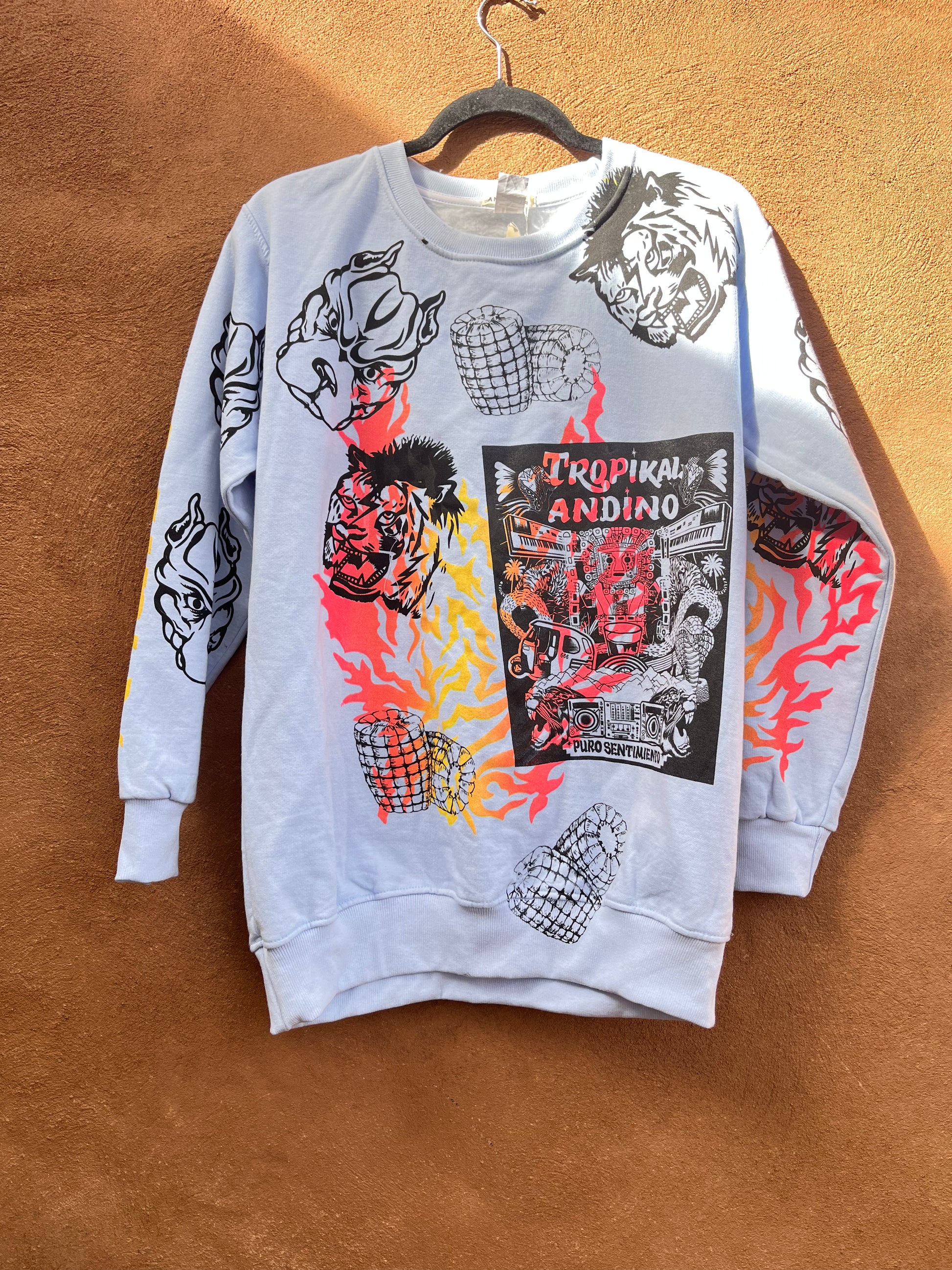 This one of a kind Sweatshirt is a piece of wearable art made from upcycled dead stock and vintage fabrics. It is screen printed by hand with Amapolay's unique graphic design, inspired by ancient Peruvian symbology and Limeño street art. It also includes embroidered elements that evoke the colorful style of the traditional "pollera," the highly decorated skirts worn by Andean women. This piece is made with care and attention to detail in every step of the process. Amapolay designs, prints, and sews each jacket by hand.