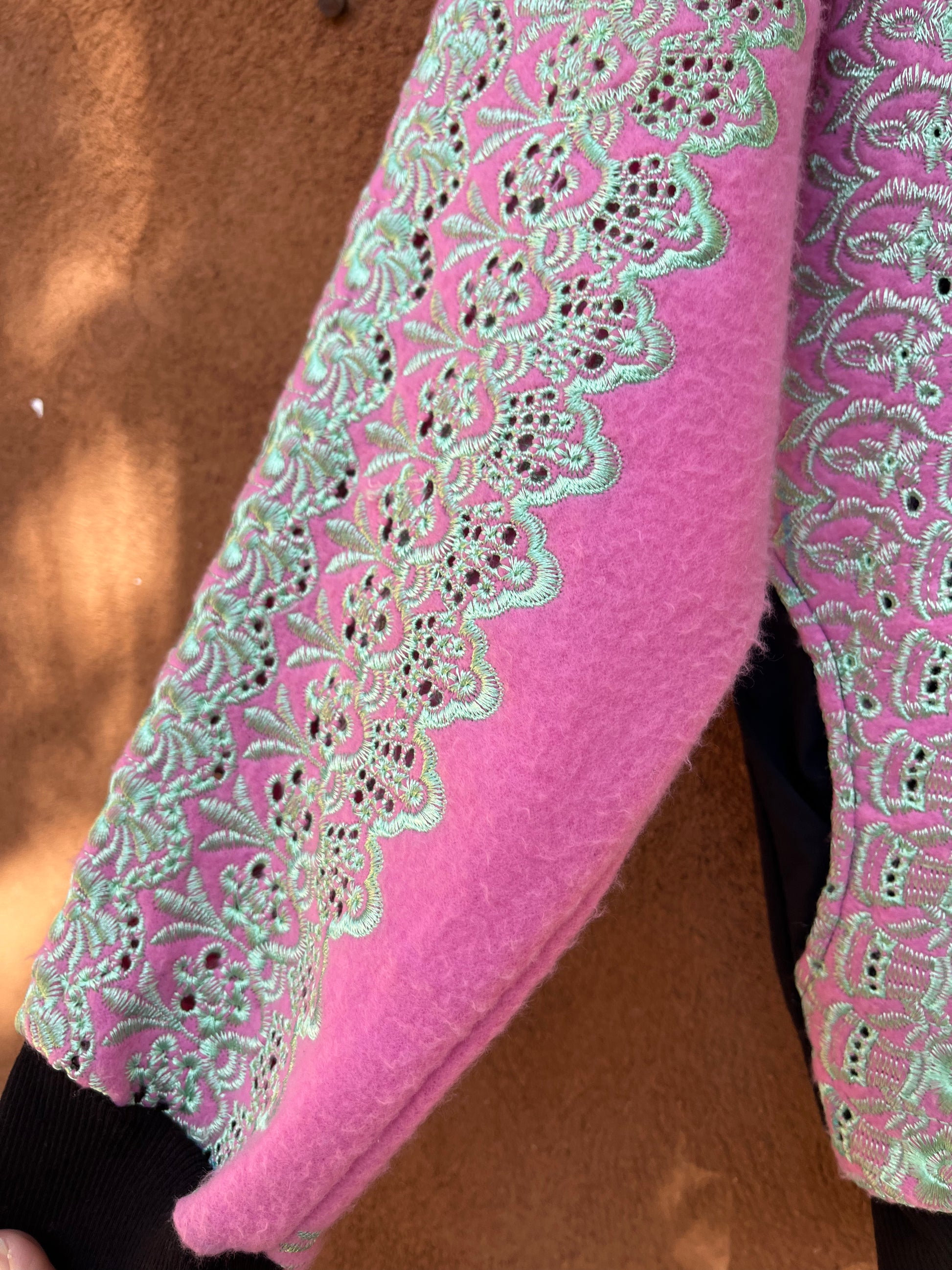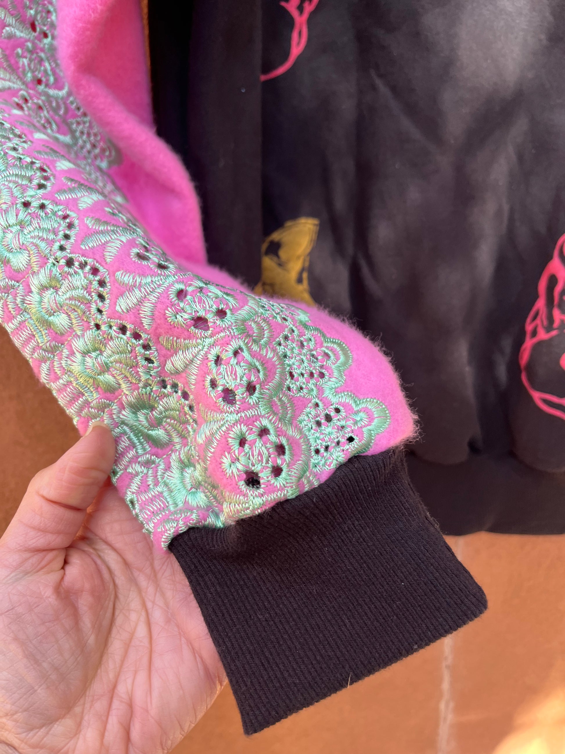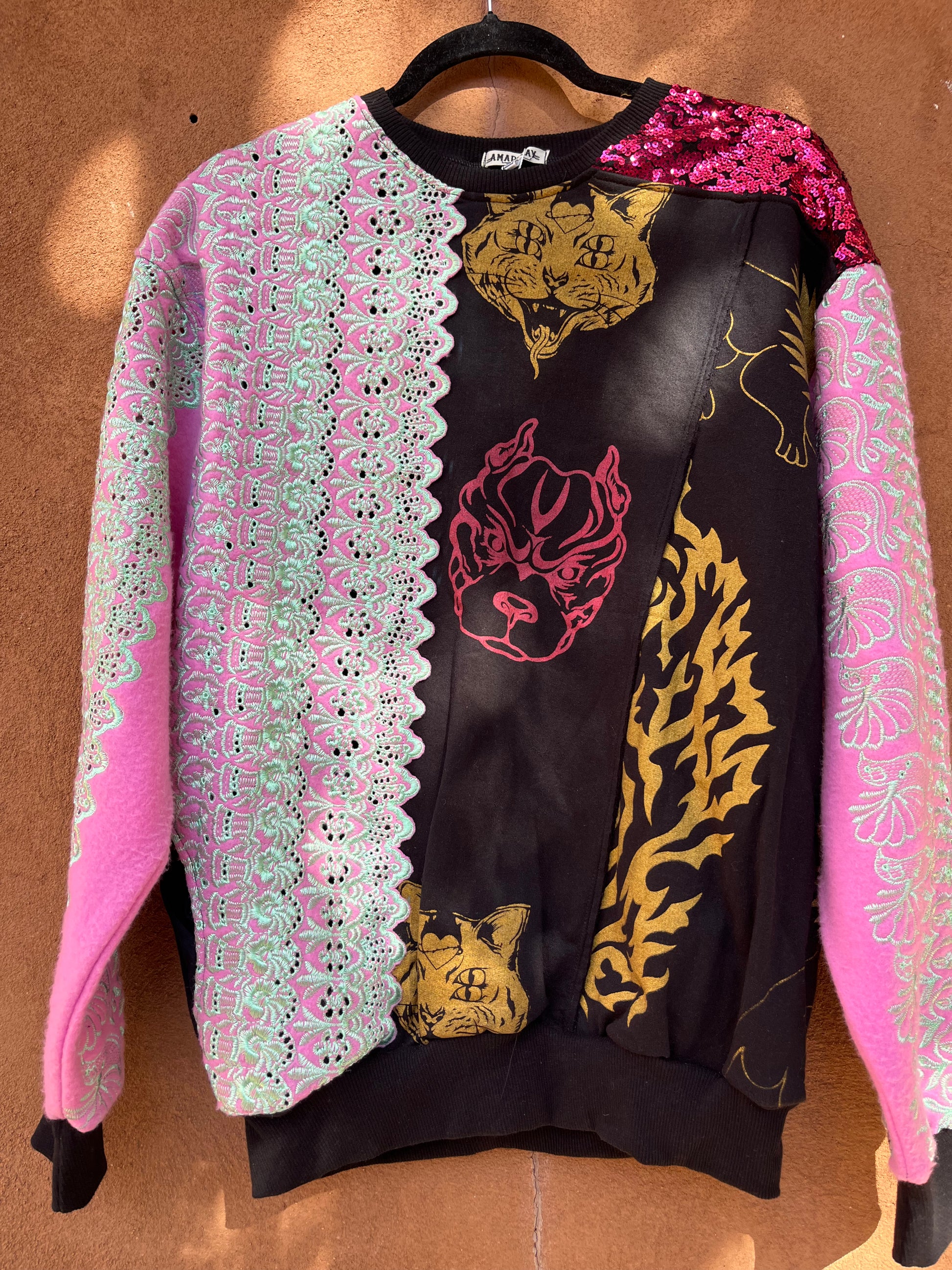 This one of a kind Sweatshirt is a piece of wearable art made from upcycled dead stock and vintage fabrics. It is screen printed by hand with Amapolay's unique graphic design, inspired by ancient Peruvian symbology and Limeño street art. It also includes embroidered elements that evoke the colorful style of the traditional "pollera," the highly decorated skirts worn by Andean women. This piece is made with care and attention to detail in every step of the process. Amapolay designs, prints, and sews each jacket by hand.