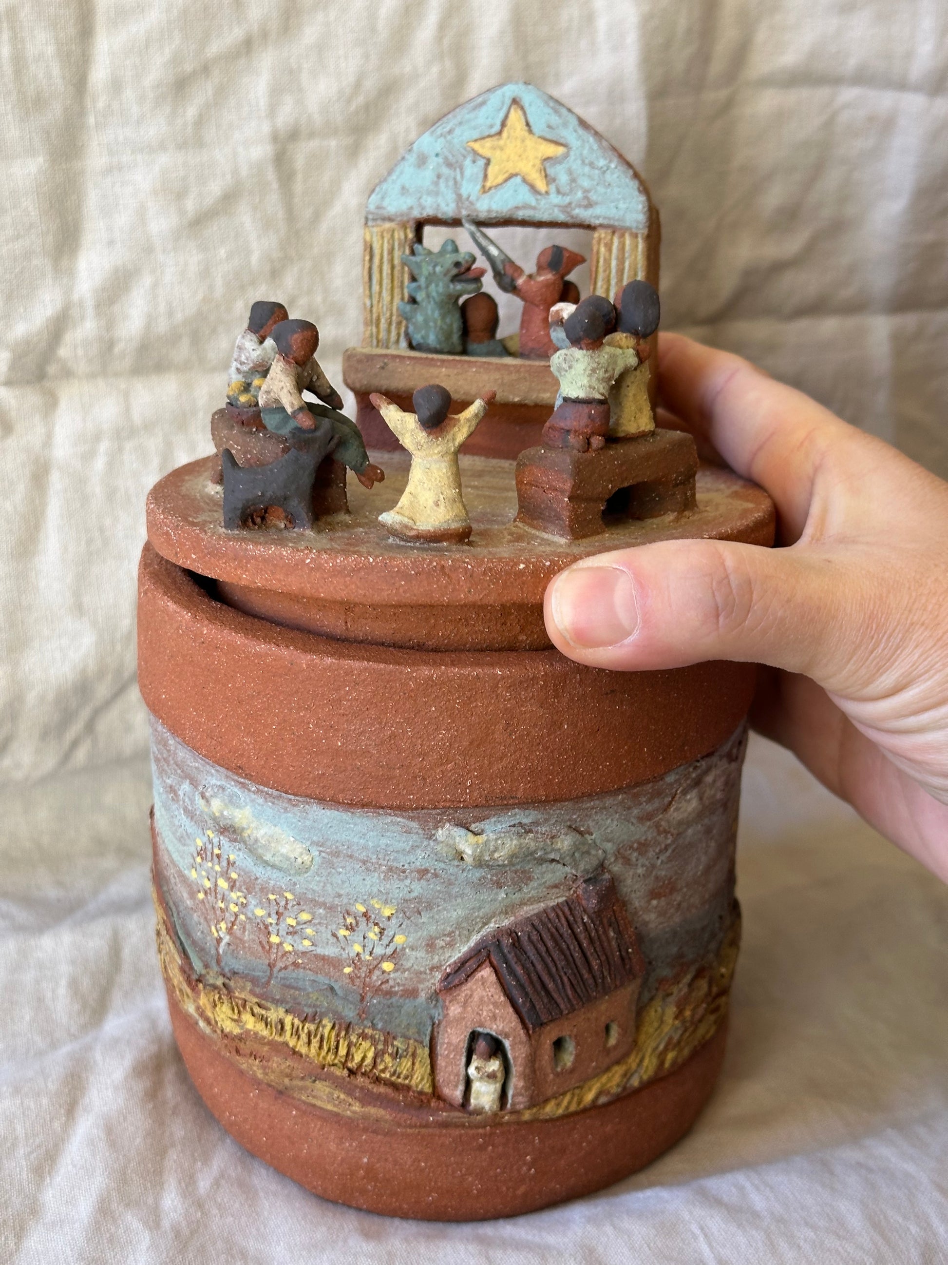 “I have been working with clay for almost twenty years. I first studied art at Rhode Island School of Design, and then I went on to do puppetry for several years with the Bread and Puppet theater in Vermont. My love of clay and puppets led me into making moving clay toys, whistles and bells and I have been making miniature clay works ever since. Growing up in a big family and spending much time in Peru during my childhood has also greatly influenced my work.”