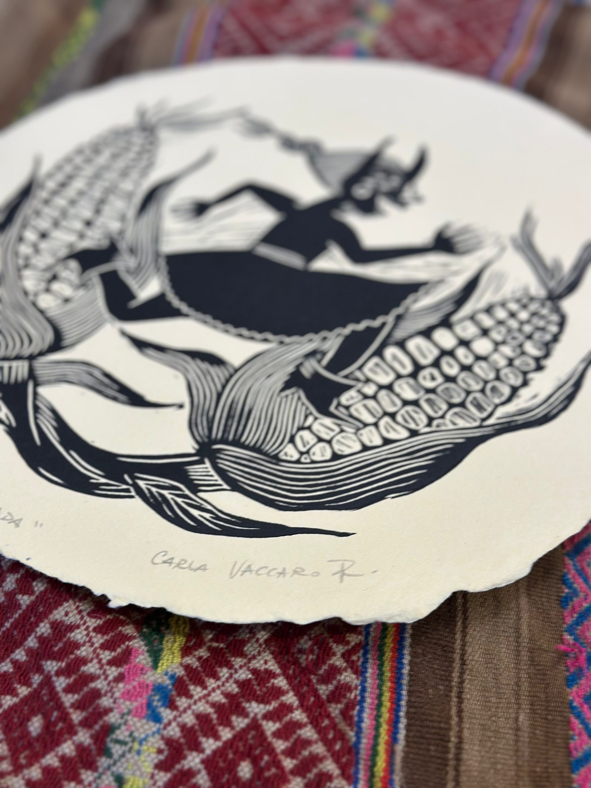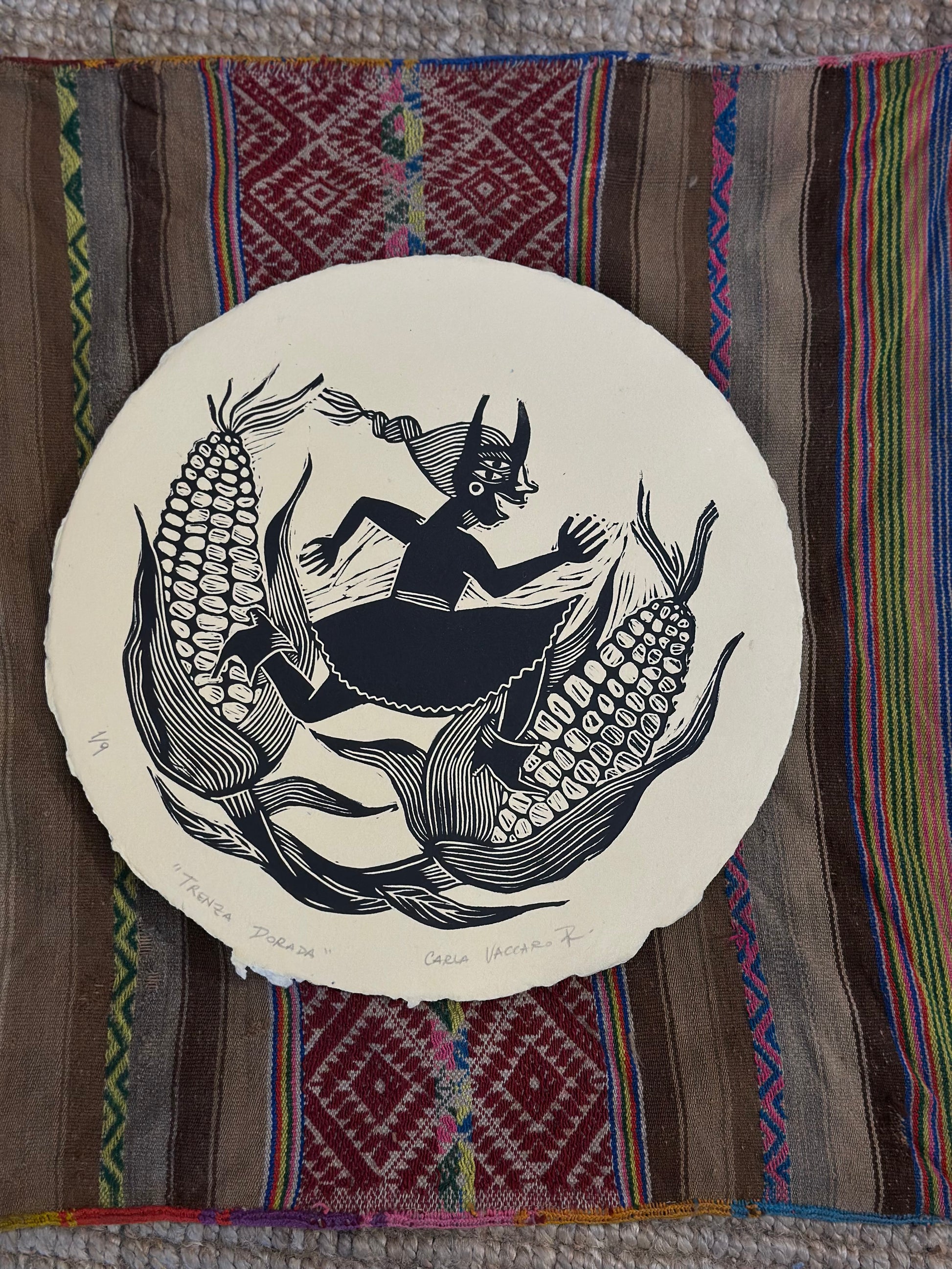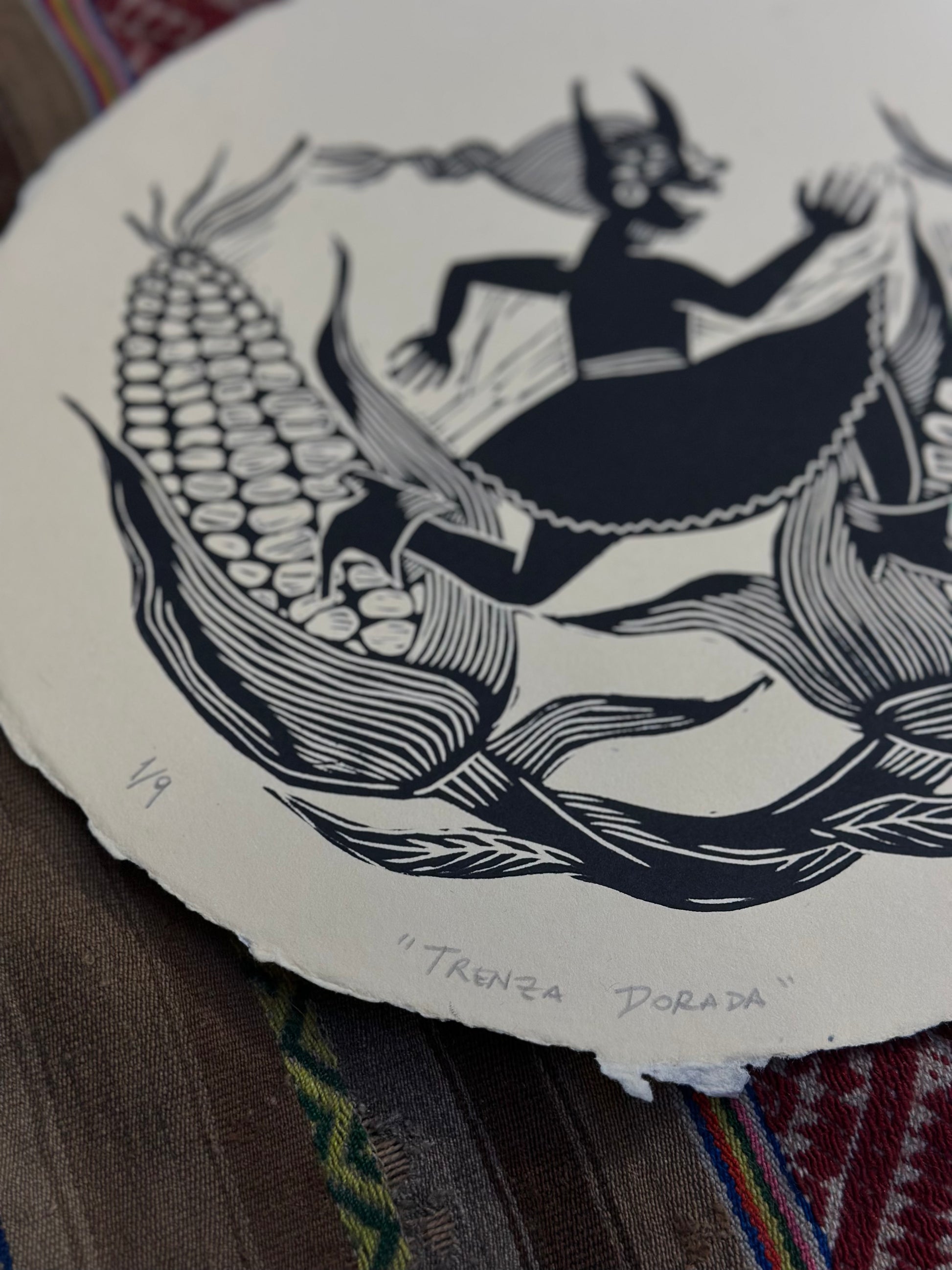 This is "Trenza Dorada", a lino print using handmade paper produced in the center's Living Museum of Paper from materials such as cotton, denim and kozo (paper mulberry) This paper is used by artists who complete residencies or workshops at La Ceiba Grafica, which is a printmaking center in Veracruz, Mexico.