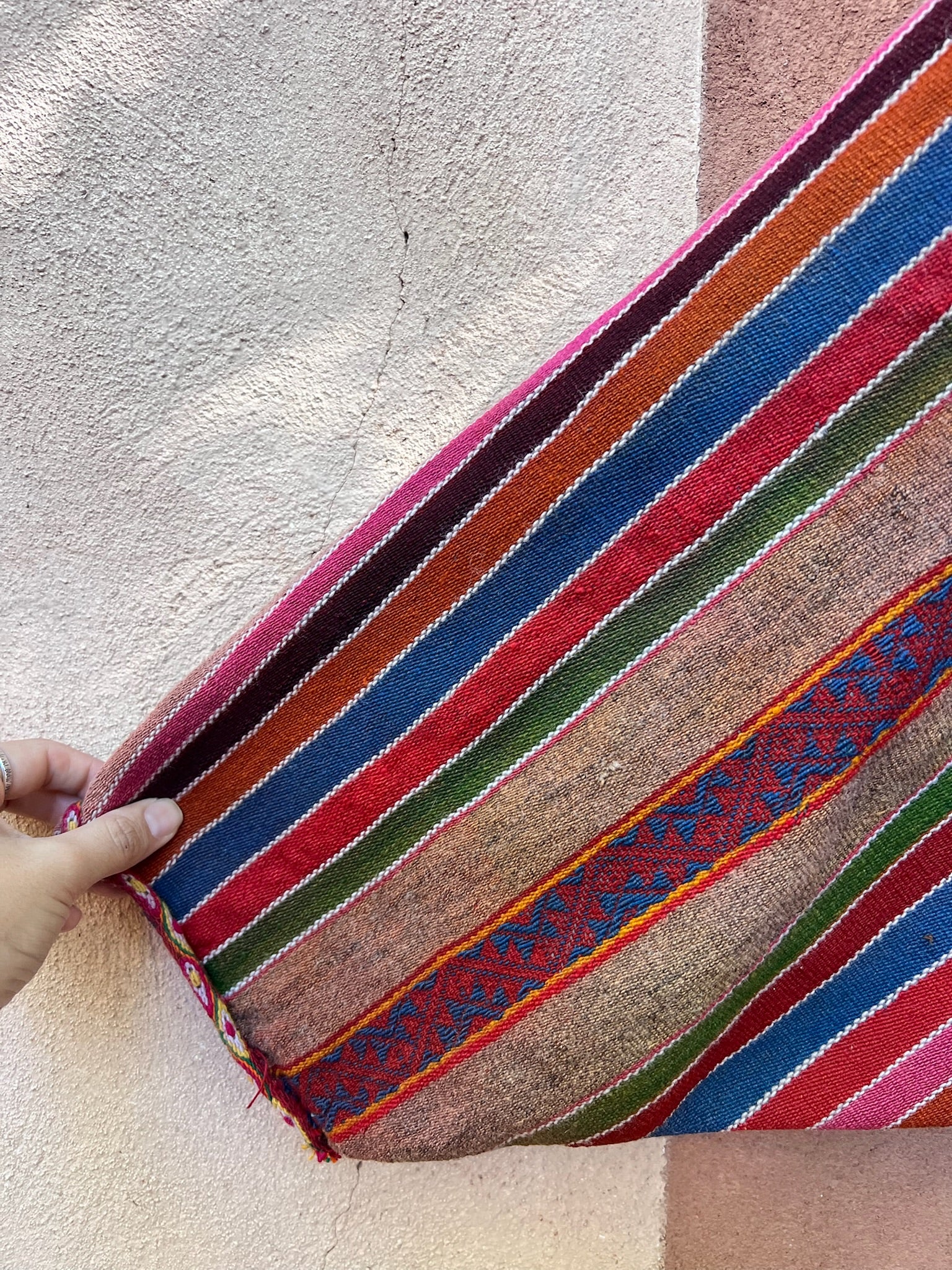 Each piece is upcycled from antique hand woven wool textiles. These blankets were vegetable dyed and hand woven by indigenous women from the region of Cusco. They are woven with patterns, colors, and symbols that chronicle the cultural identity of the weaver and their community.