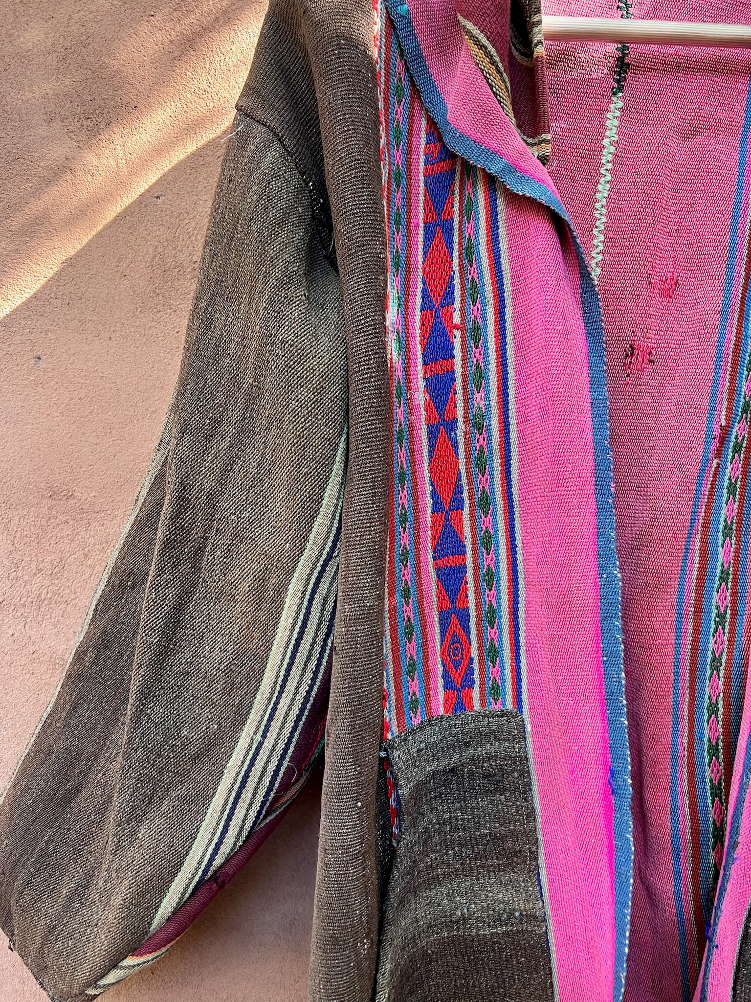 Each piece is upcycled from antique hand woven wool textiles. These blankets were vegetable dyed and hand woven by indigenous women from the region of Cusco. They are woven with patterns, colors, and symbols that chronicle the cultural identity of the weaver and their community.