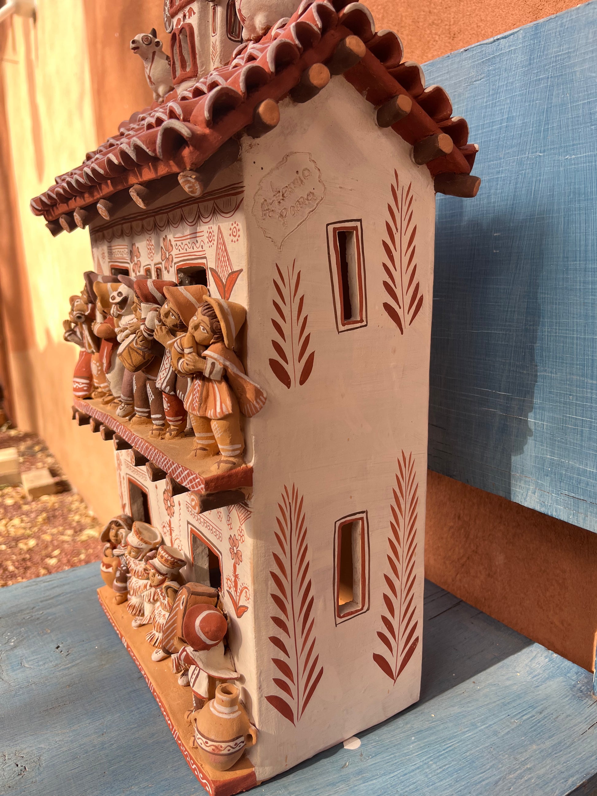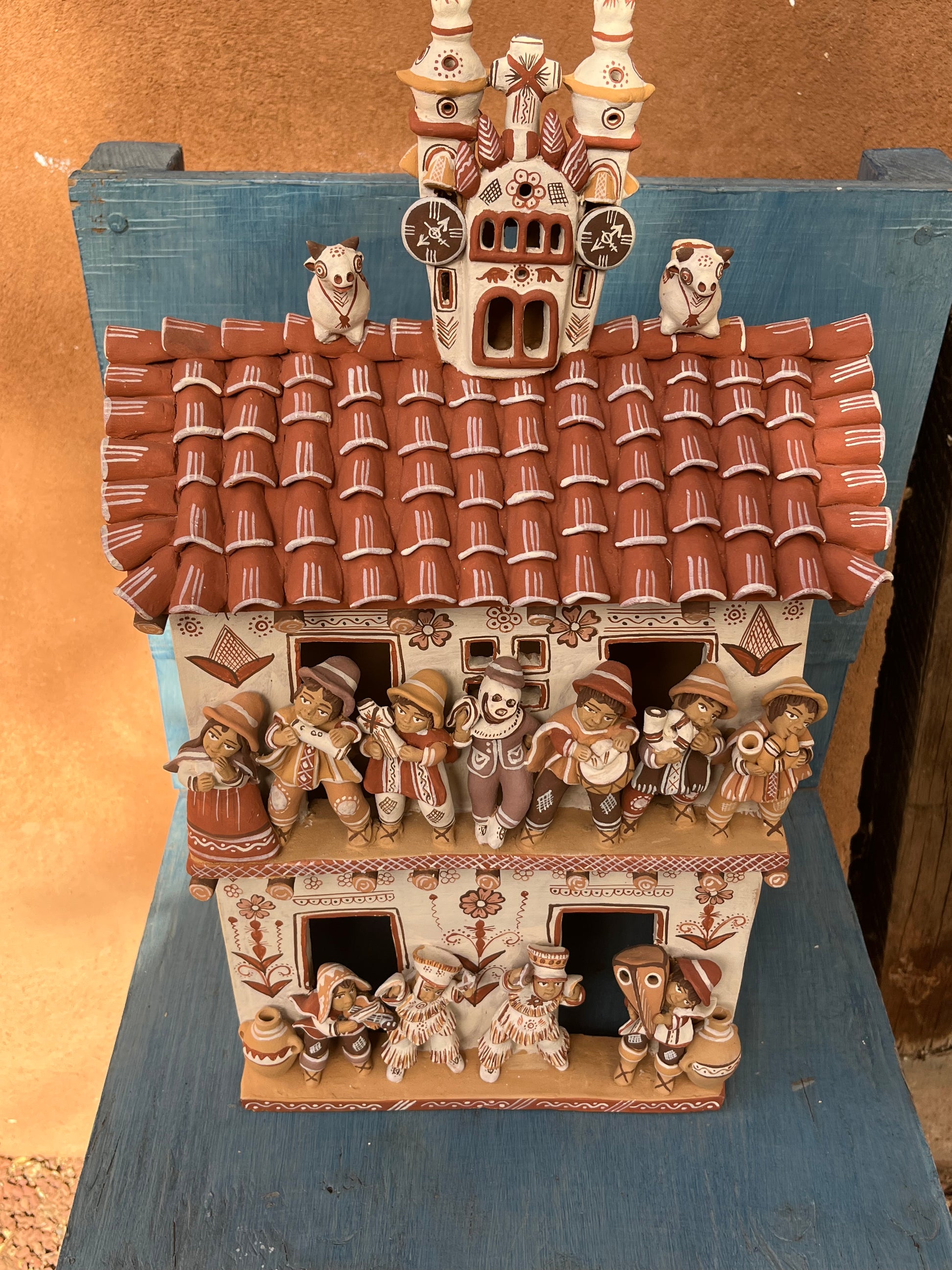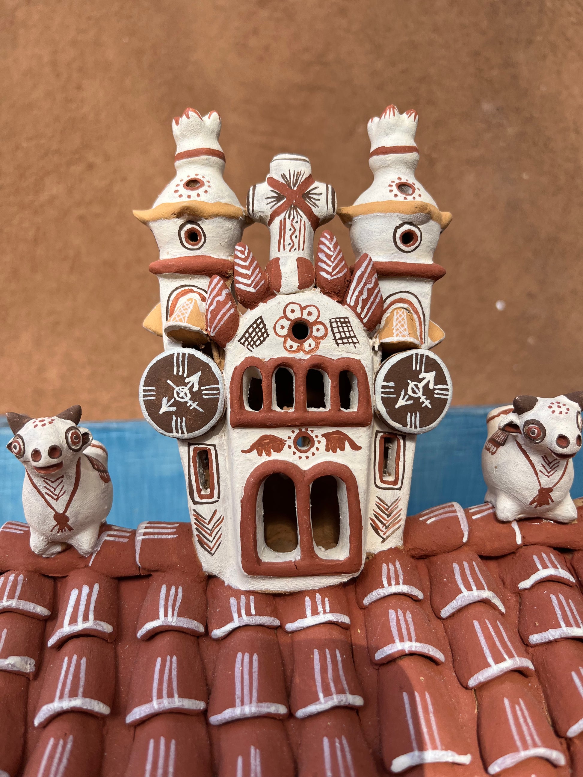 Artemio adorns his ceramics- typically rendered in earthy tones of beige, deep coral, and chocolate brown- with traditional iconography typical of the region.