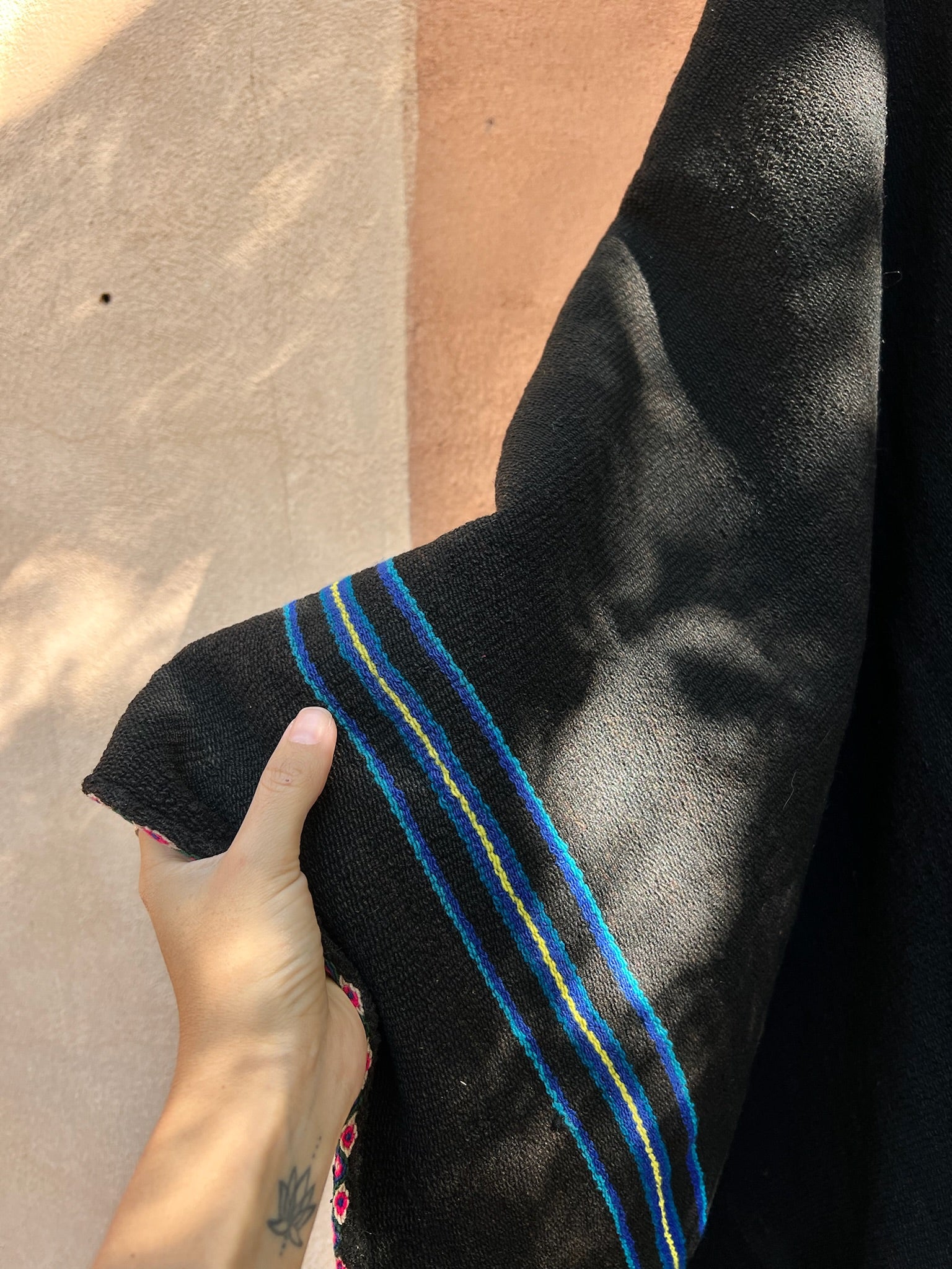 This one of a kind poncho was handmade in the Sacred Valley of Cusco, Peru. This poncho is an antique piece handwoven from black sheep wool, its earned a unique patina from years of use.