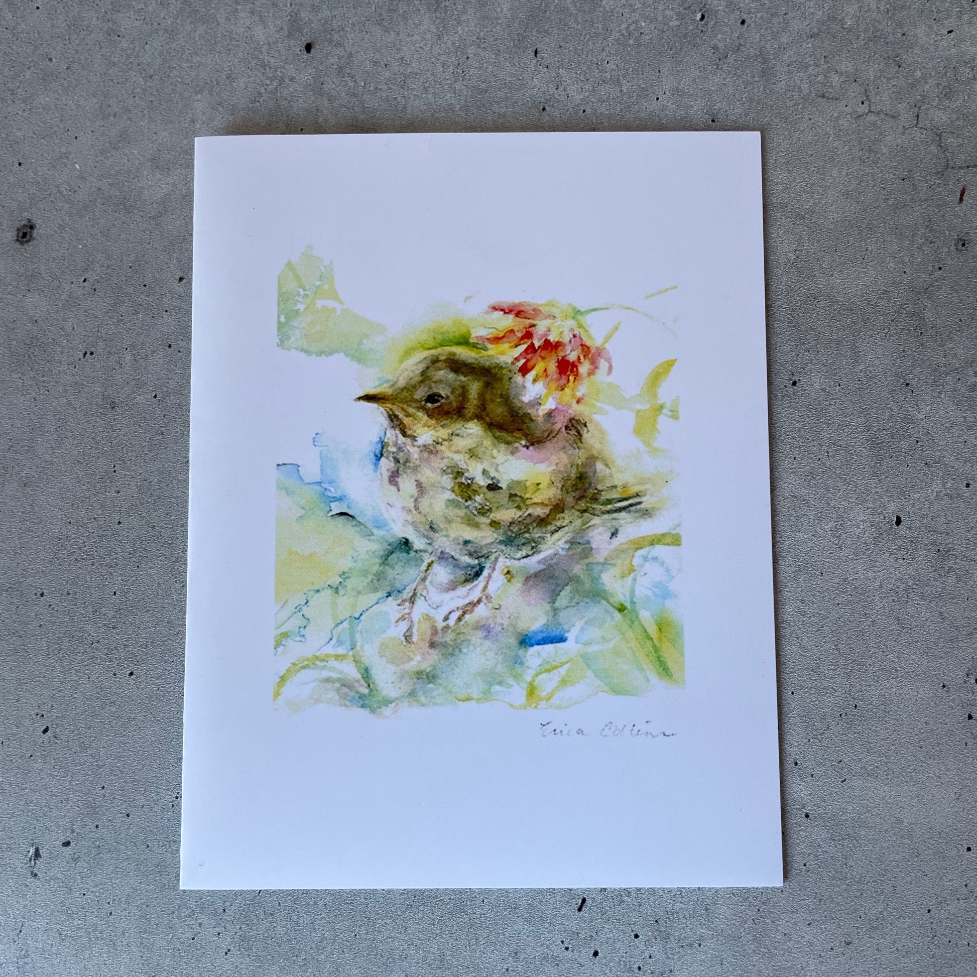Reproduction of original watercolor by Erica Collins. Art card printed on high quality, heavy card stock, includes envelope. Package of 6.