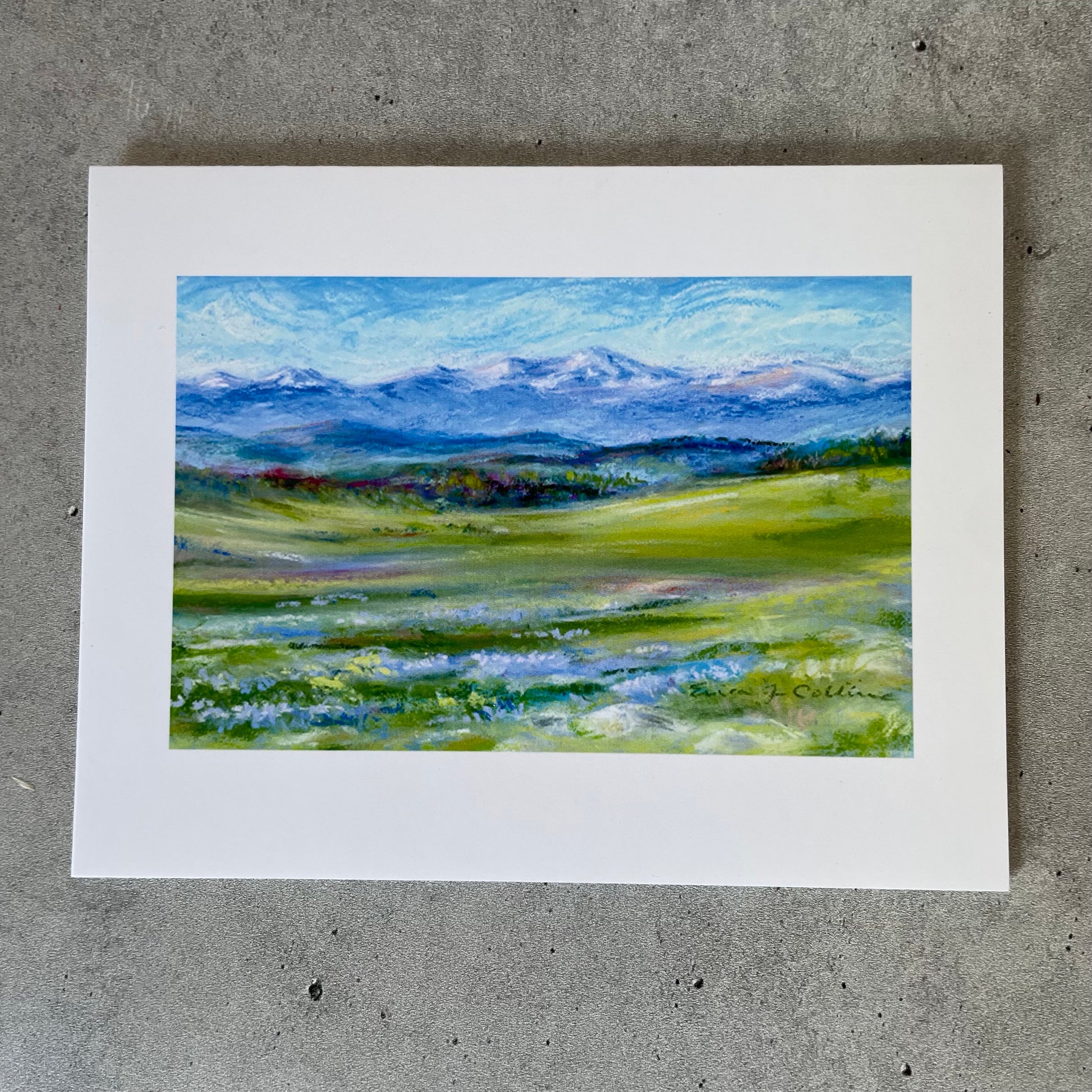 Reproduction of original watercolor by Erica Collins. Art card printed on high quality, heavy card stock, includes envelope. Package of 6.